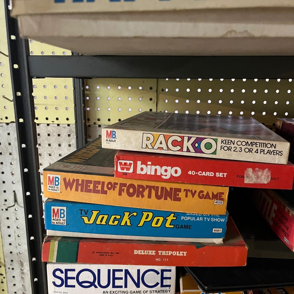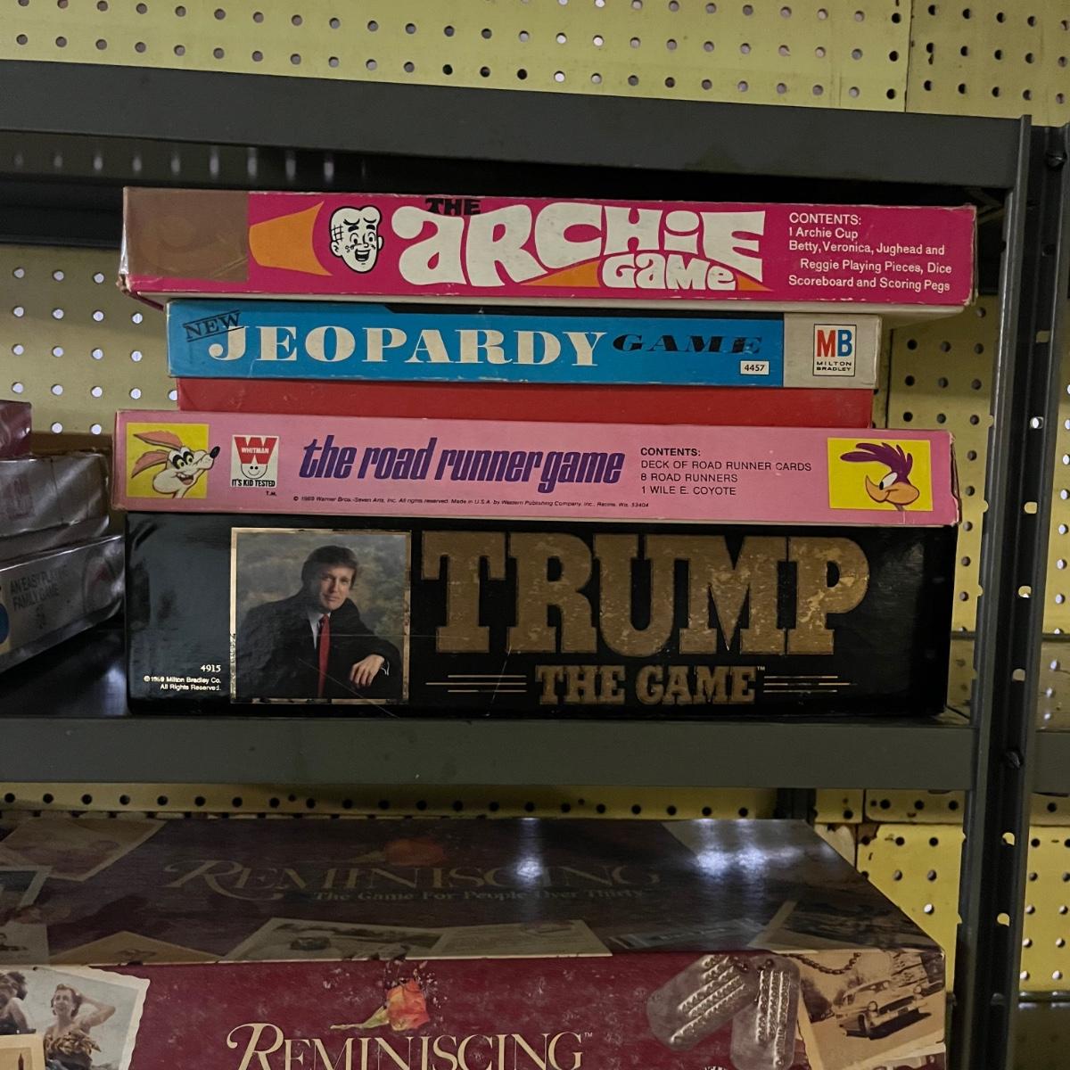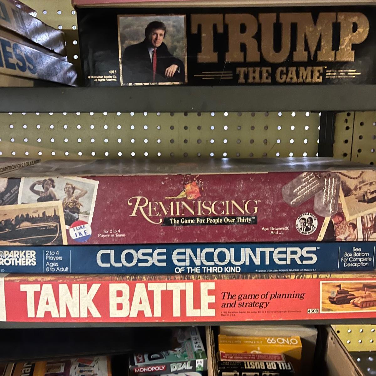Lot contains a plethora of board games including Monopoly, Trump, Power Broker, Battleship, Trivial Pursuit and many more. Shelf not included but available later in sale.