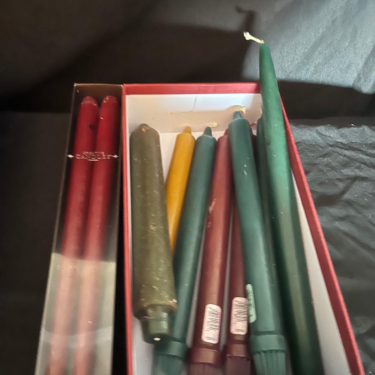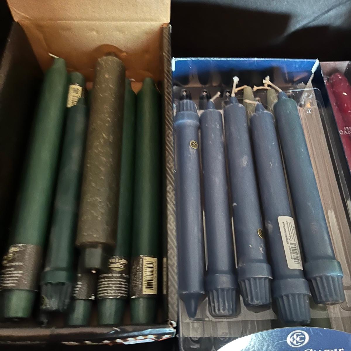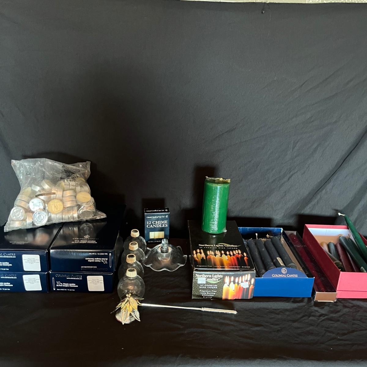 Lot includes four boxes of twelve candles each, a metal candle snuffer, two bags of tea lights, four glass votives for candelabras and an assortment of loose tapered candles.