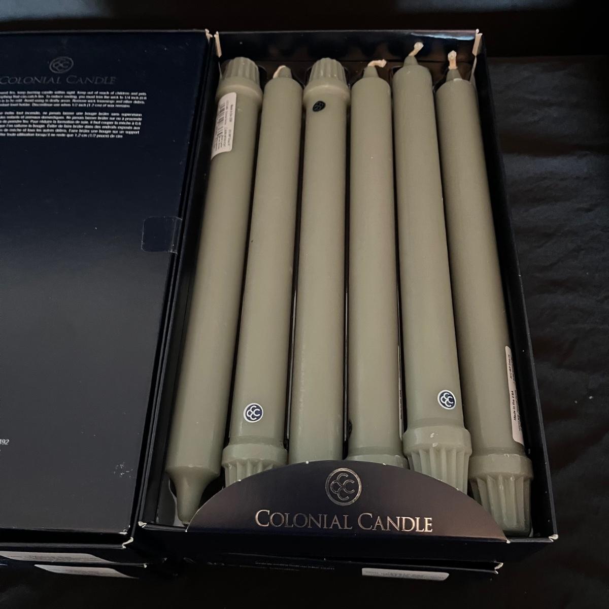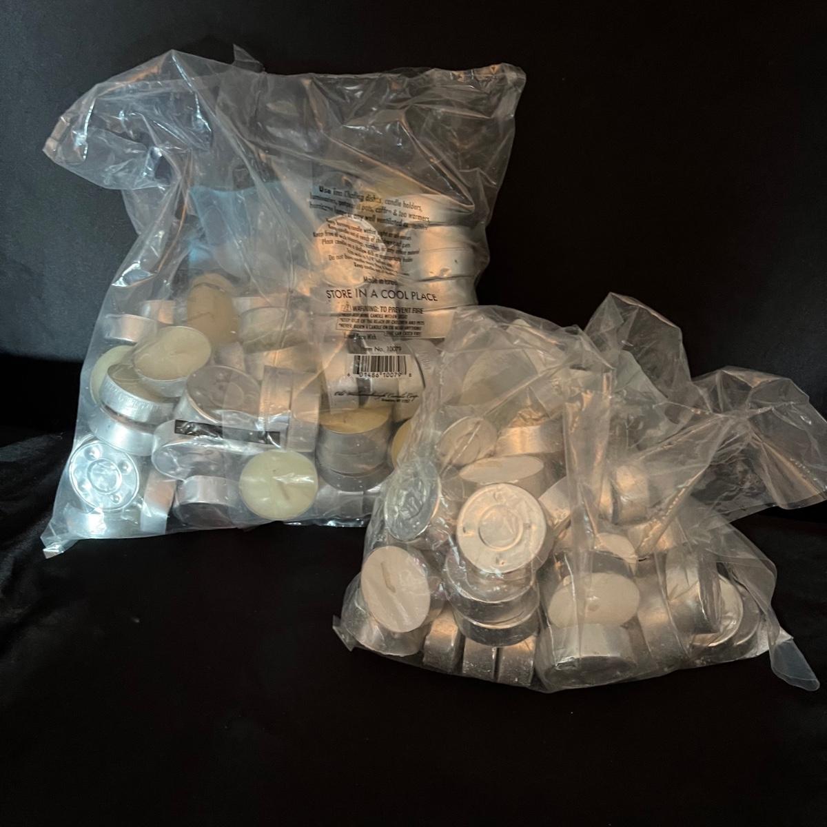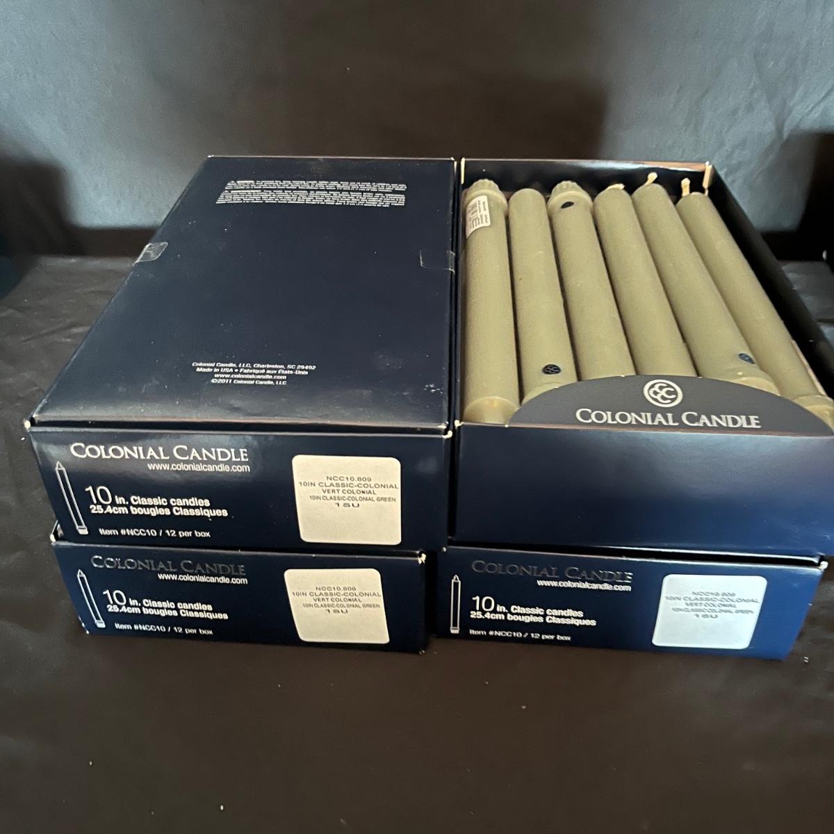 Lot includes four boxes of twelve candles each, a metal candle snuffer, two bags of tea lights, four glass votives for candelabras and an assortment of loose tapered candles.