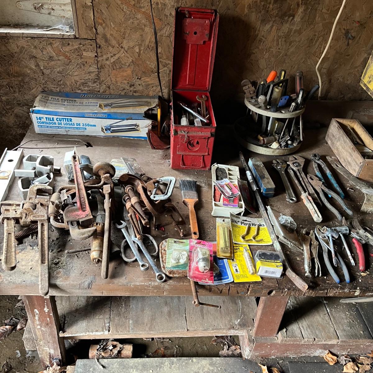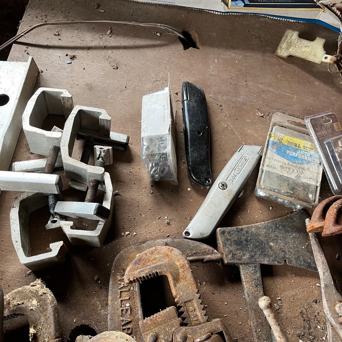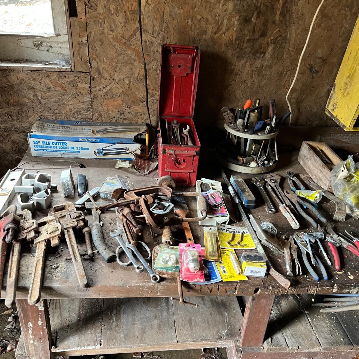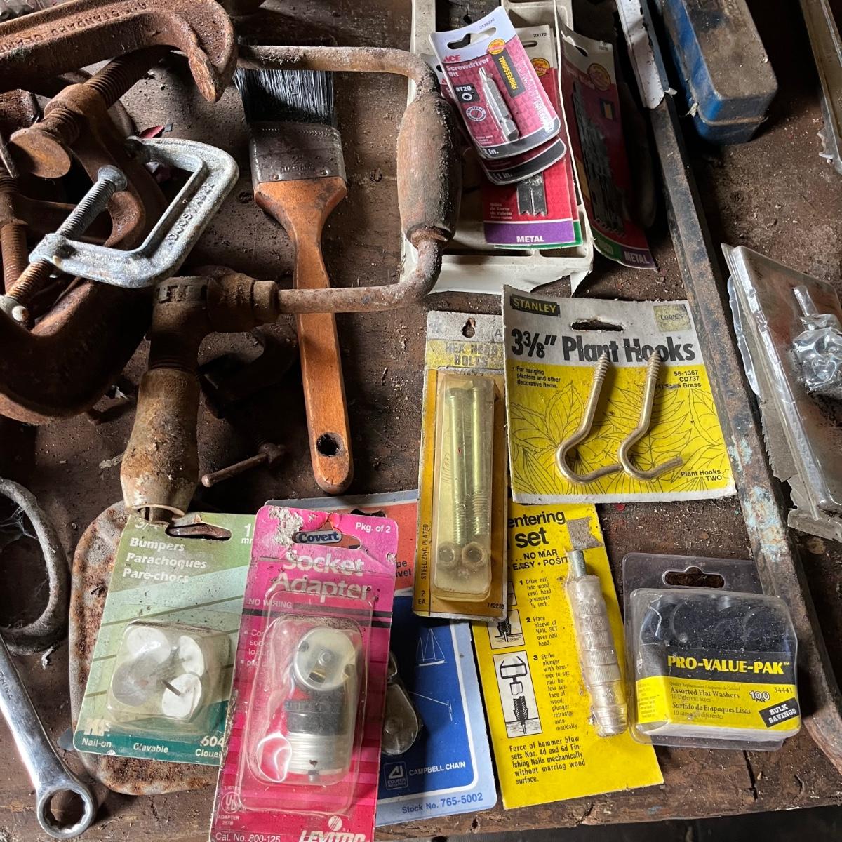 Lot contains a plethora of hand tools including Craftsman ratchets, Kobolt pliers, screwdrivers, 14” tile cutter, pipe wrenches, C clamps, adjustable wrenches and more. Also includes a assortment of hardware.