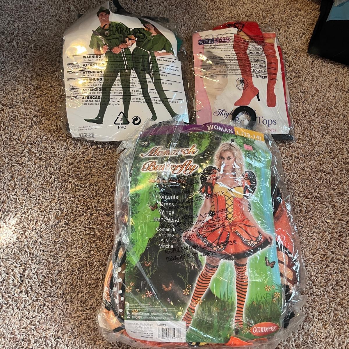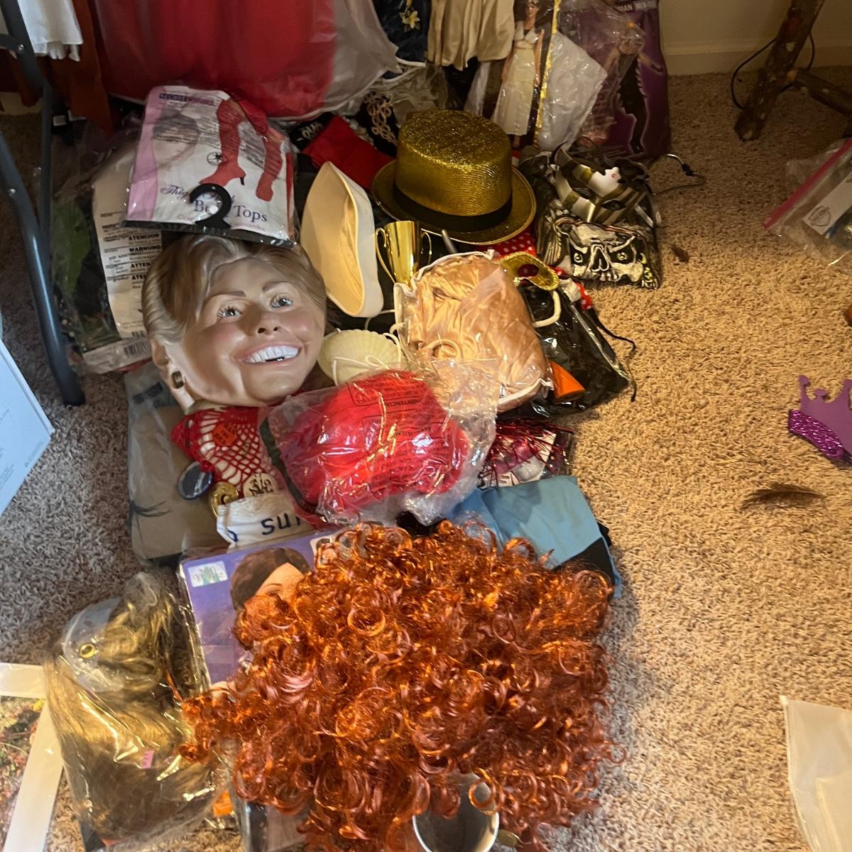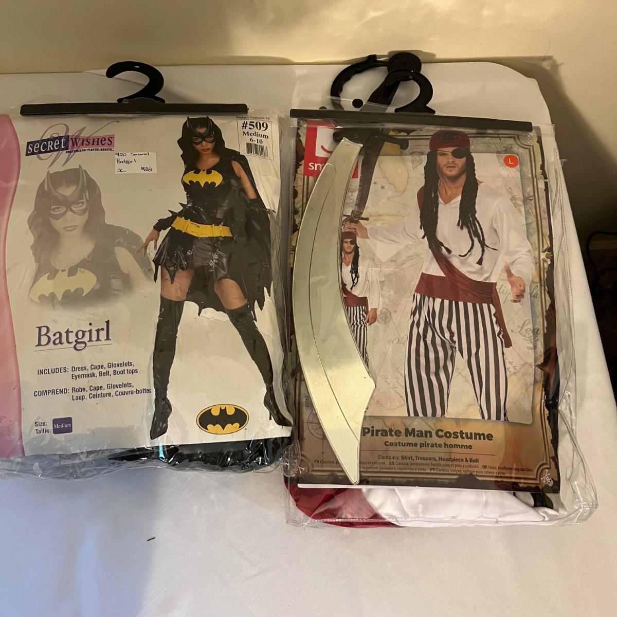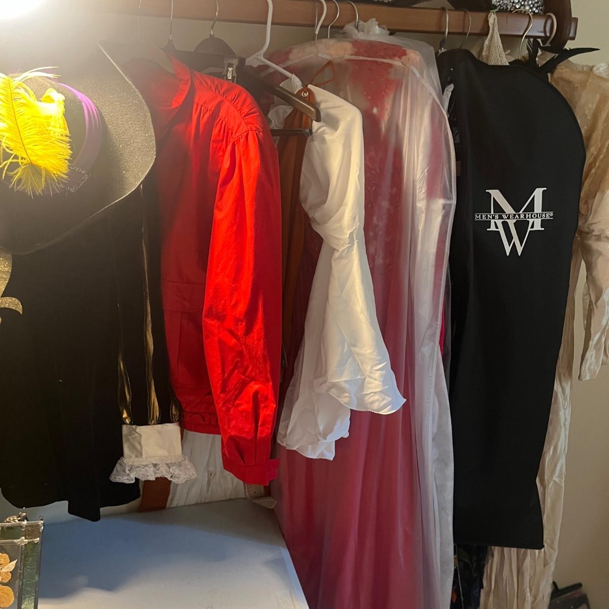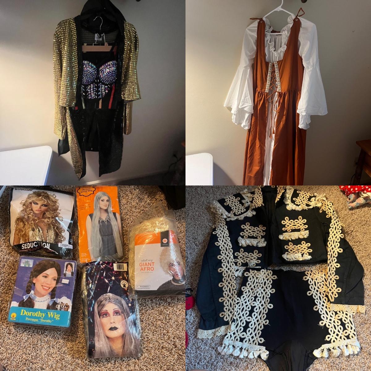 Lot contains a plethora of ladies costumes including swashbuckler outfit, butterfly, bee, belly dancer, cocktail dresses, wigs, hats, chaps, two sets of angel wings, safari hat and more. Most items appear to be medium to large.