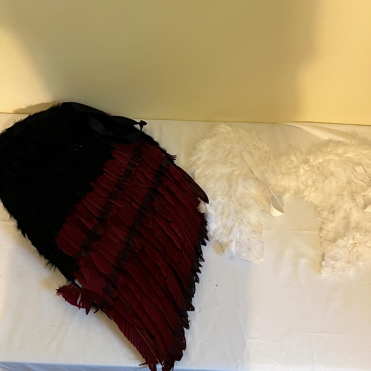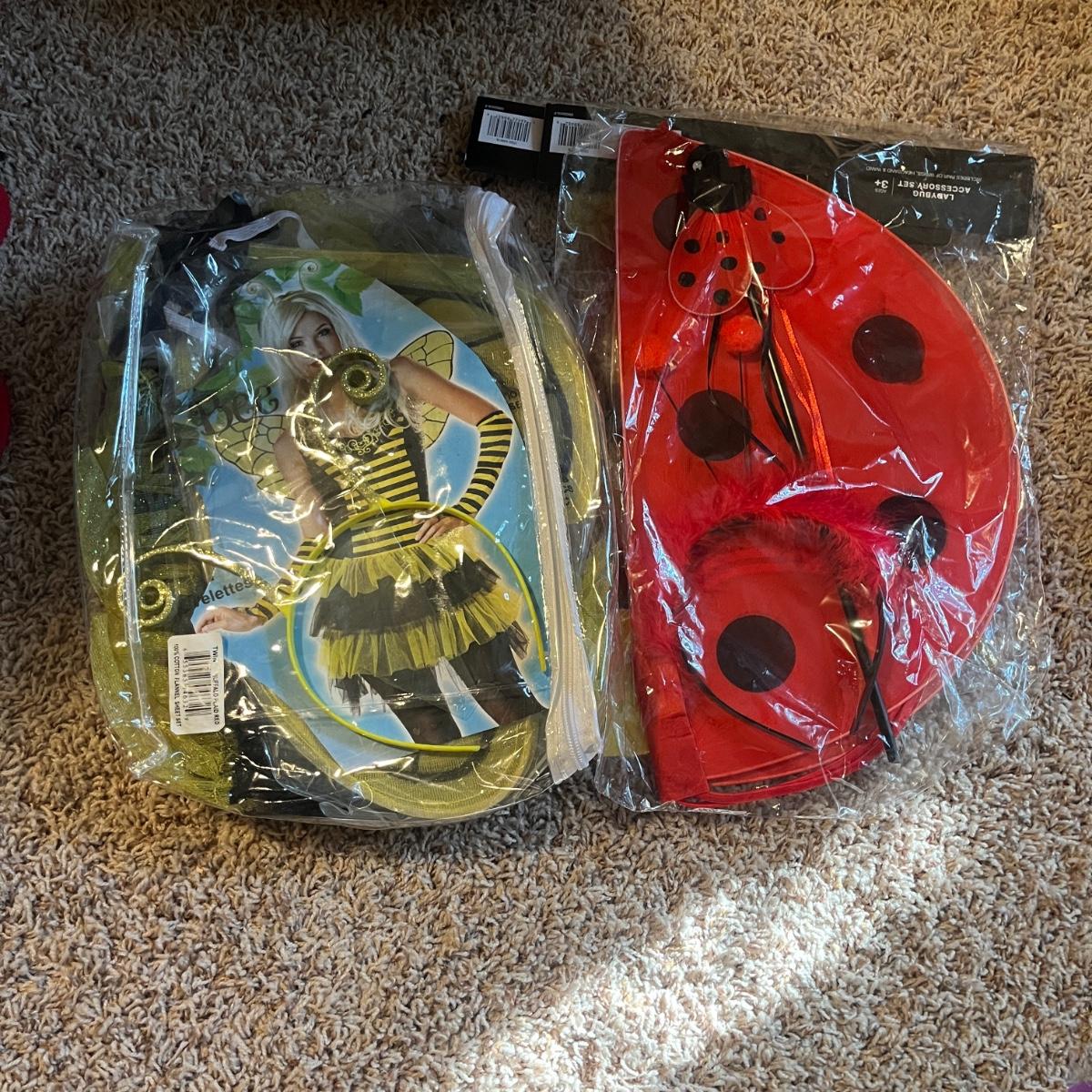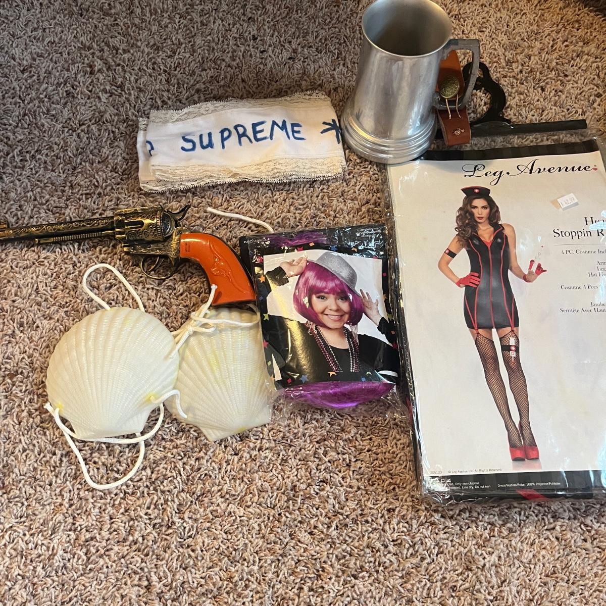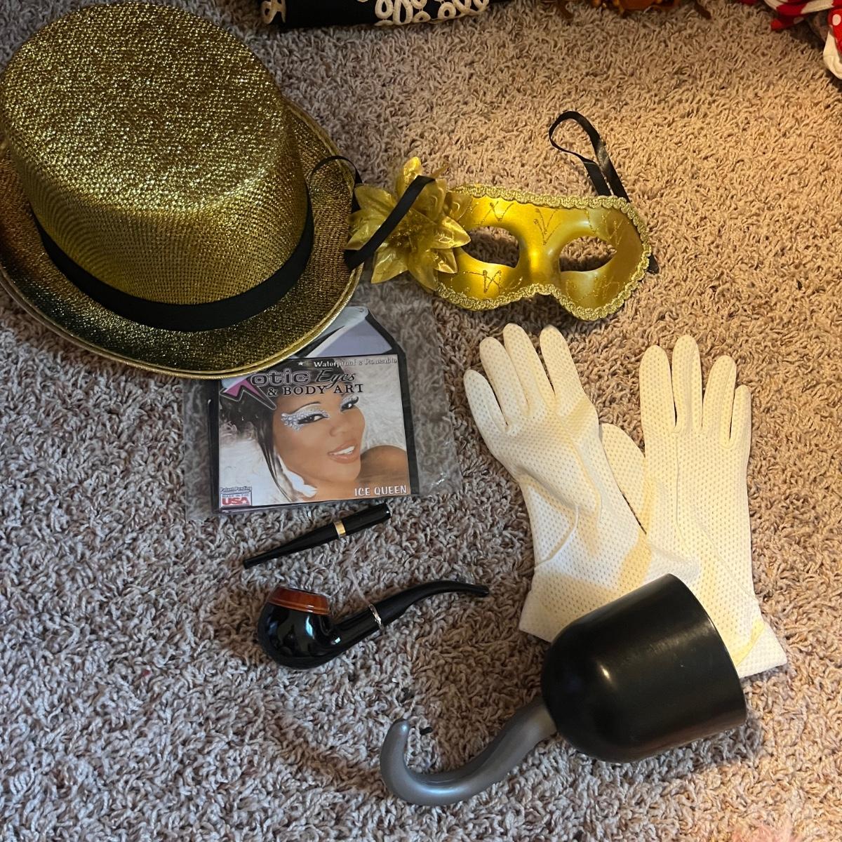 Lot contains a plethora of ladies costumes including swashbuckler outfit, butterfly, bee, belly dancer, cocktail dresses, wigs, hats, chaps, two sets of angel wings, safari hat and more. Most items appear to be medium to large.
