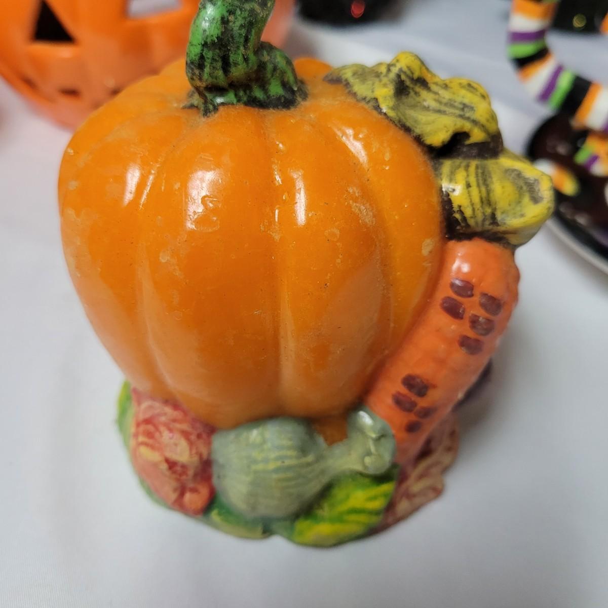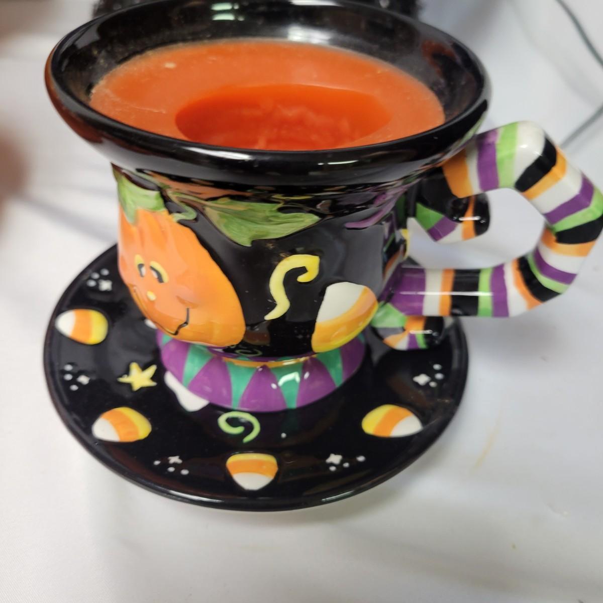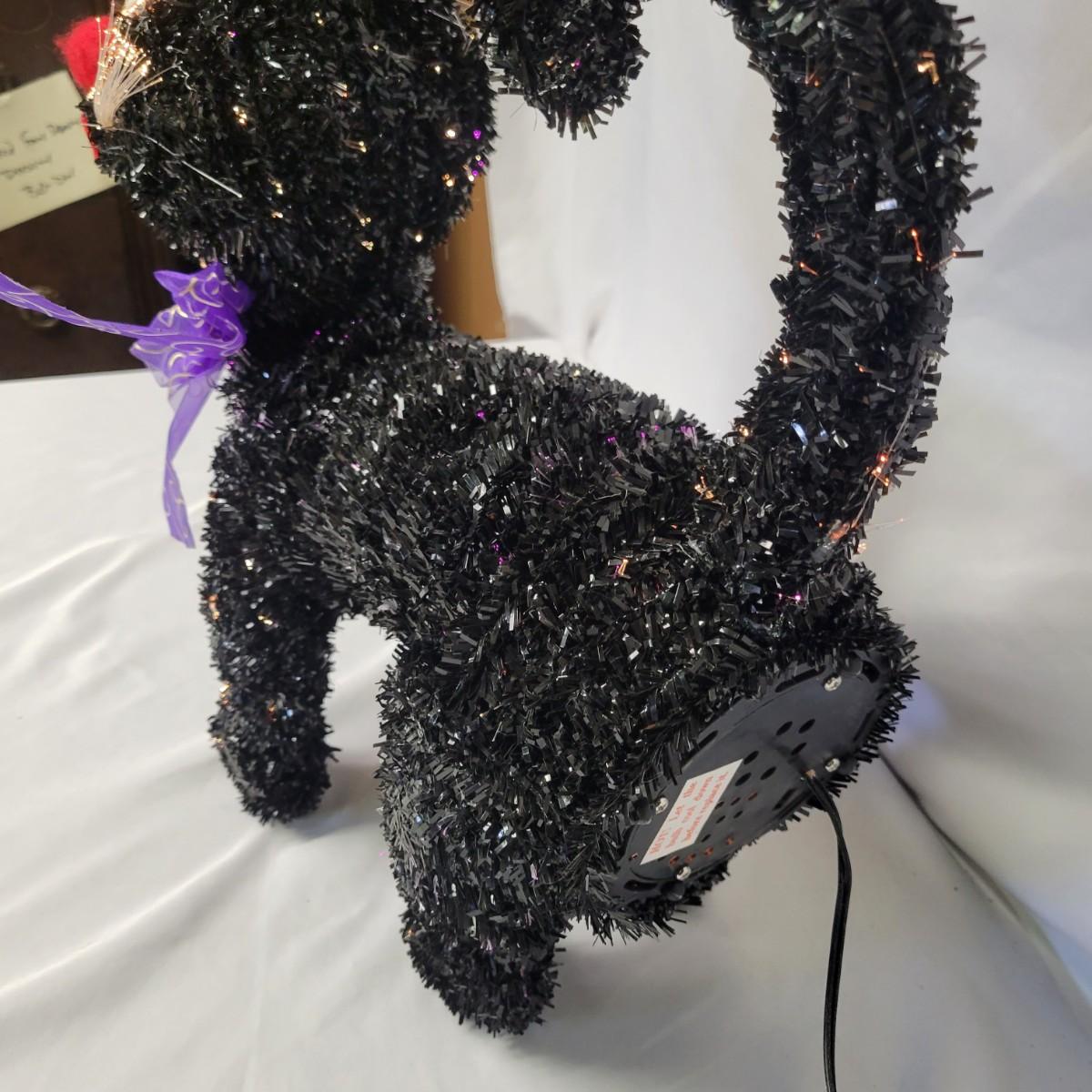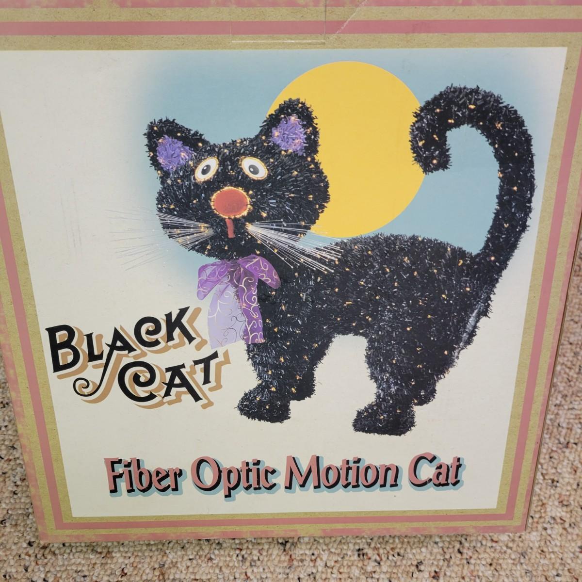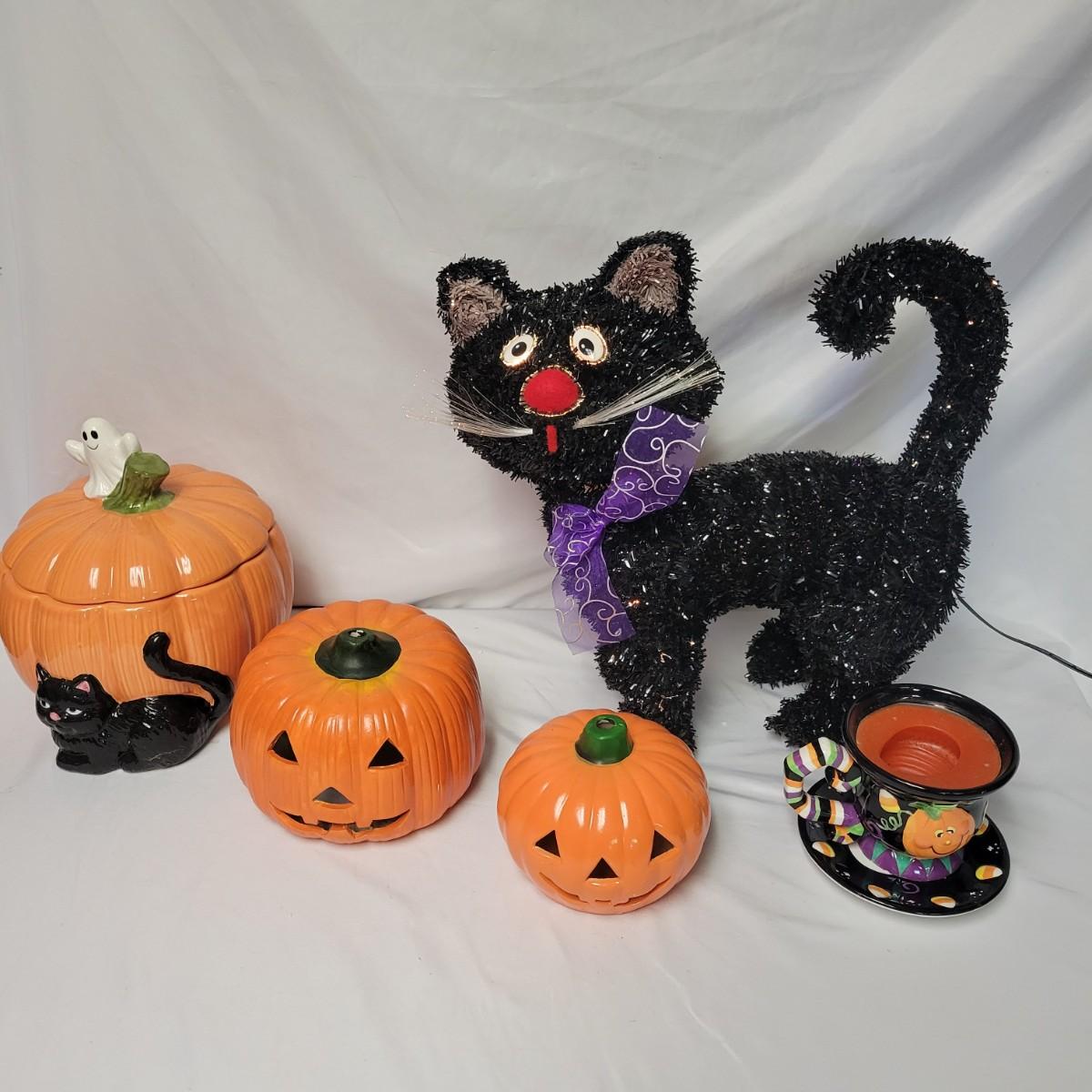 An assortment of Halloween items in good condition, although some of the candles have been lightly used. Included is a cornucopia of pumpkins. Some are ceramic, most are scented candles. A spooky serving bowl, a coffee cup and saucer is also included. A fiber optic motion black cat is also in this lot. Item was tested and works and measures approximately 13" x 5.5" x 14". Local pickup only
