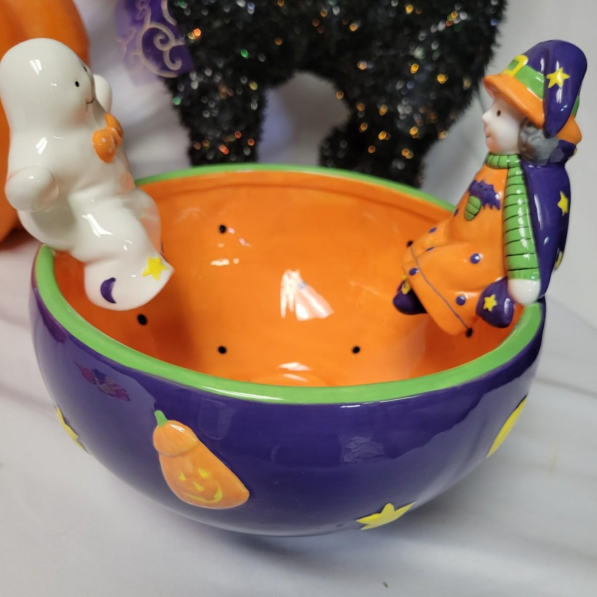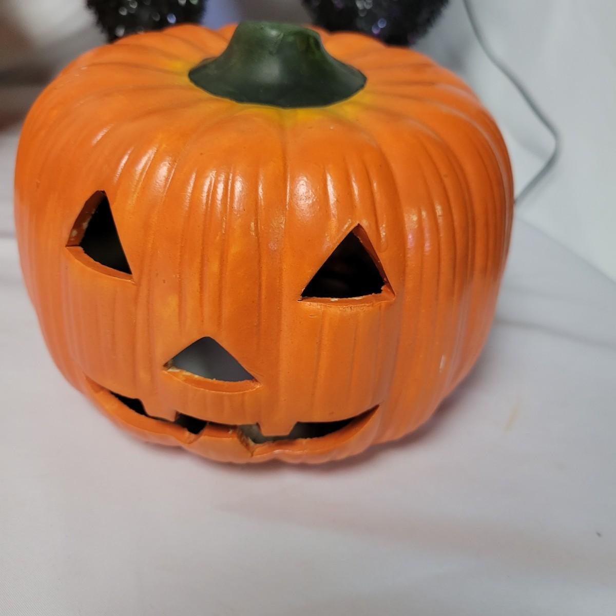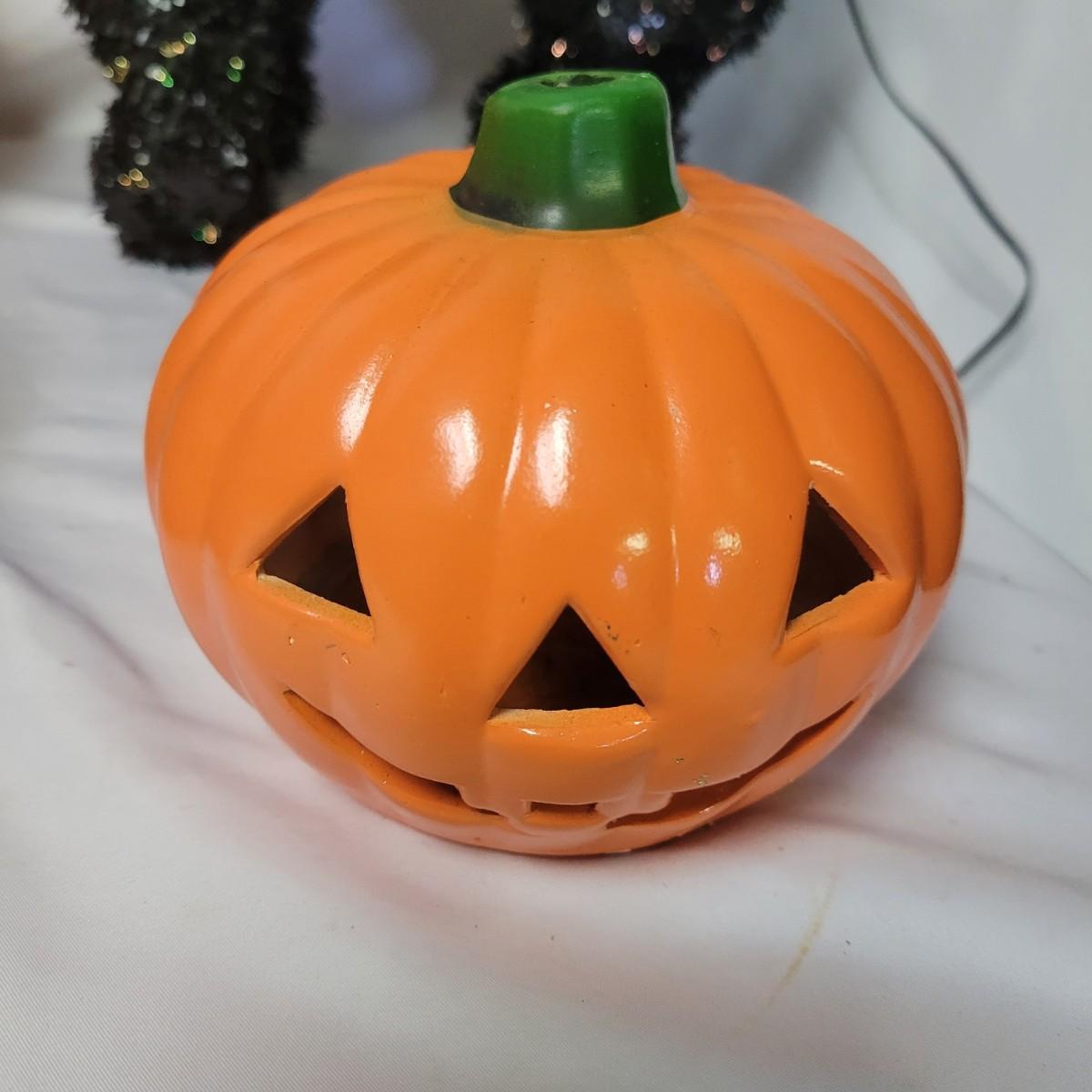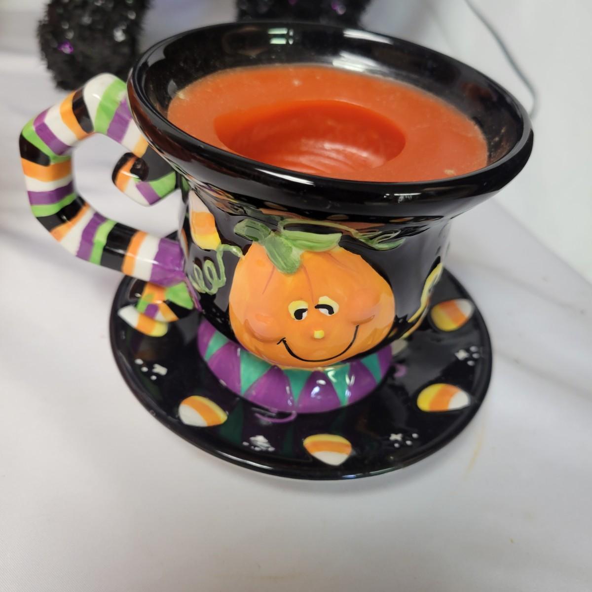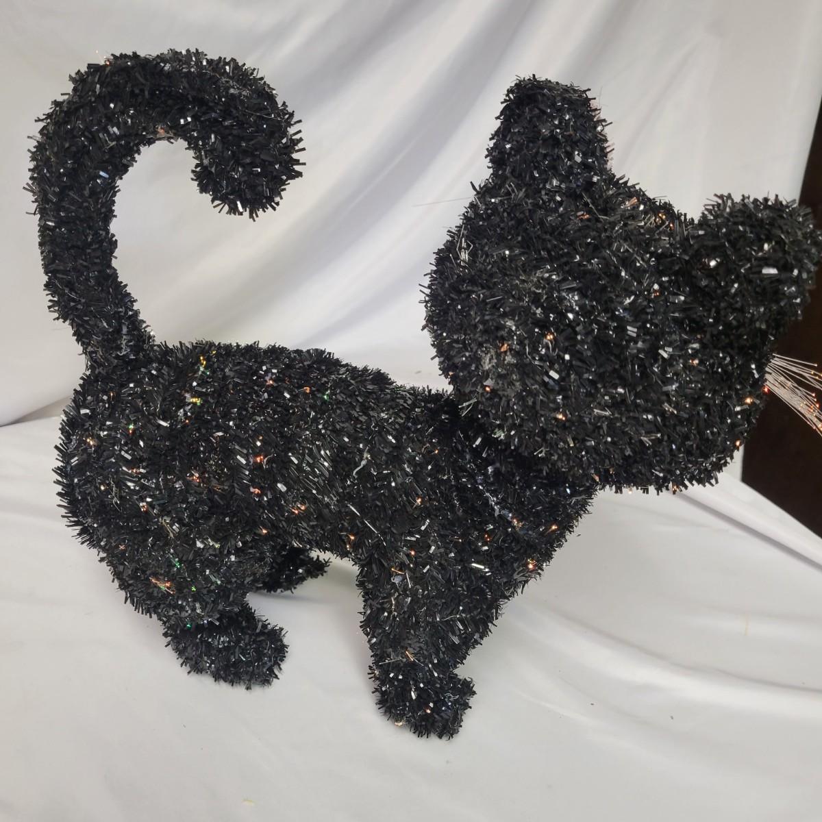 An assortment of Halloween items in good condition, although some of the candles have been lightly used. Included is a cornucopia of pumpkins. Some are ceramic, most are scented candles. A spooky serving bowl, a coffee cup and saucer is also included. A fiber optic motion black cat is also in this lot. Item was tested and works and measures approximately 13" x 5.5" x 14". Local pickup only