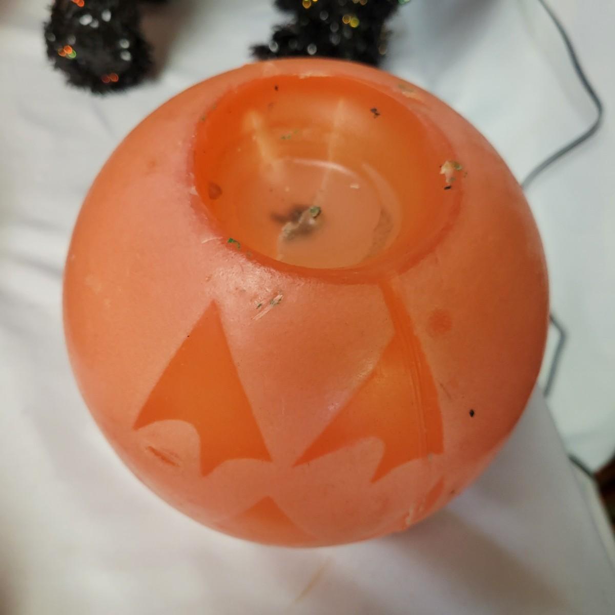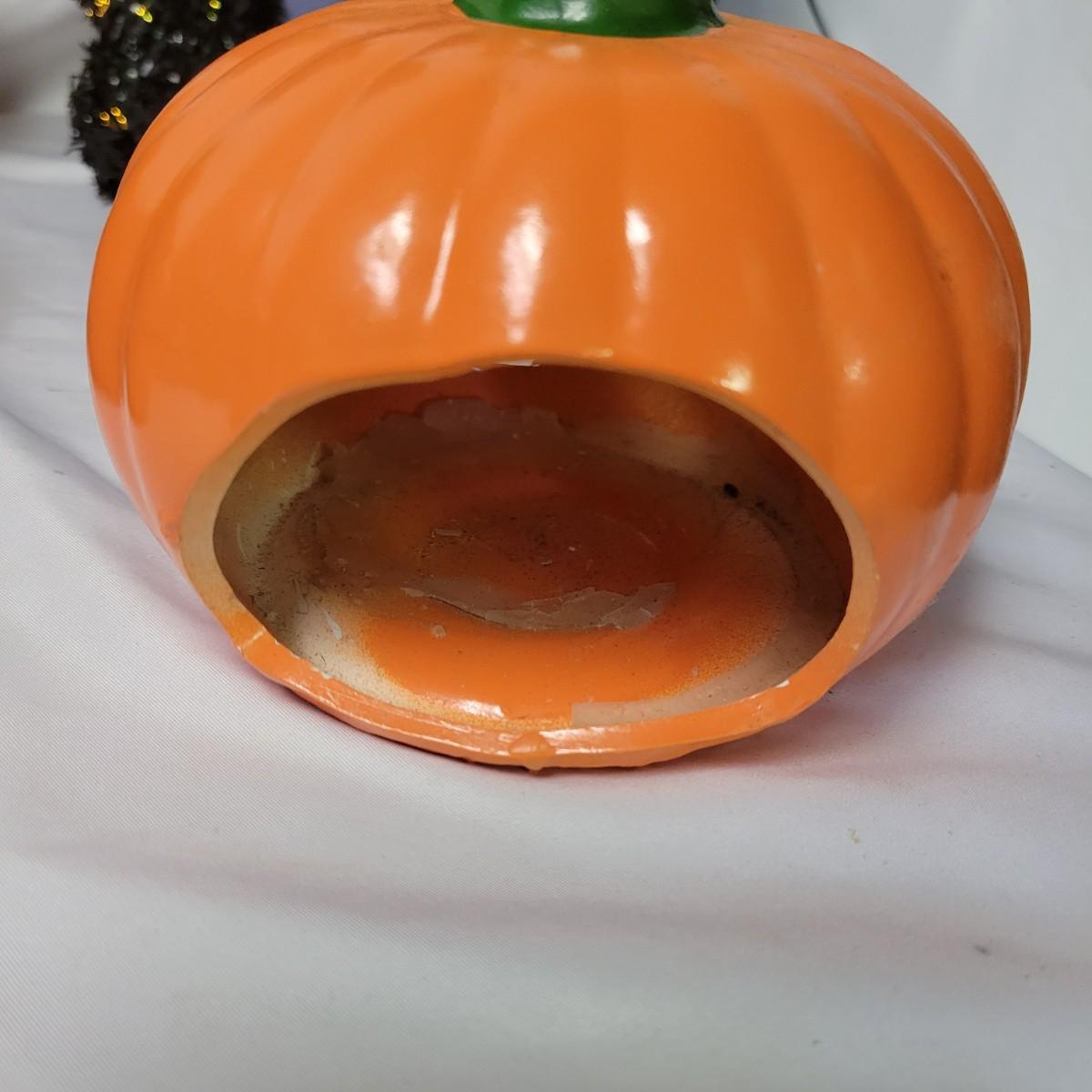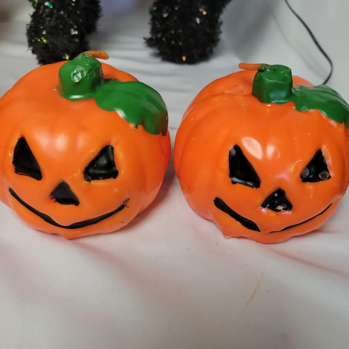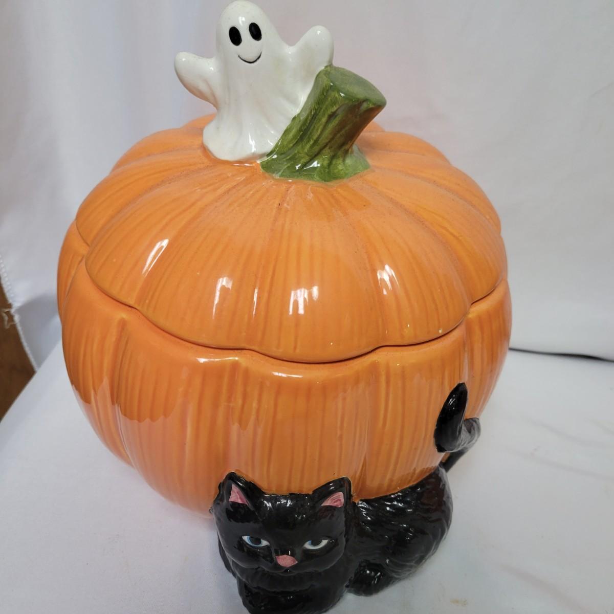 An assortment of Halloween items in good condition, although some of the candles have been lightly used. Included is a cornucopia of pumpkins. Some are ceramic, most are scented candles. A spooky serving bowl, a coffee cup and saucer is also included. A fiber optic motion black cat is also in this lot. Item was tested and works and measures approximately 13" x 5.5" x 14". Local pickup only