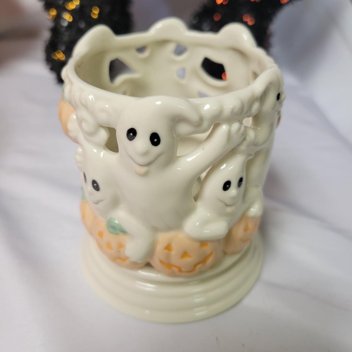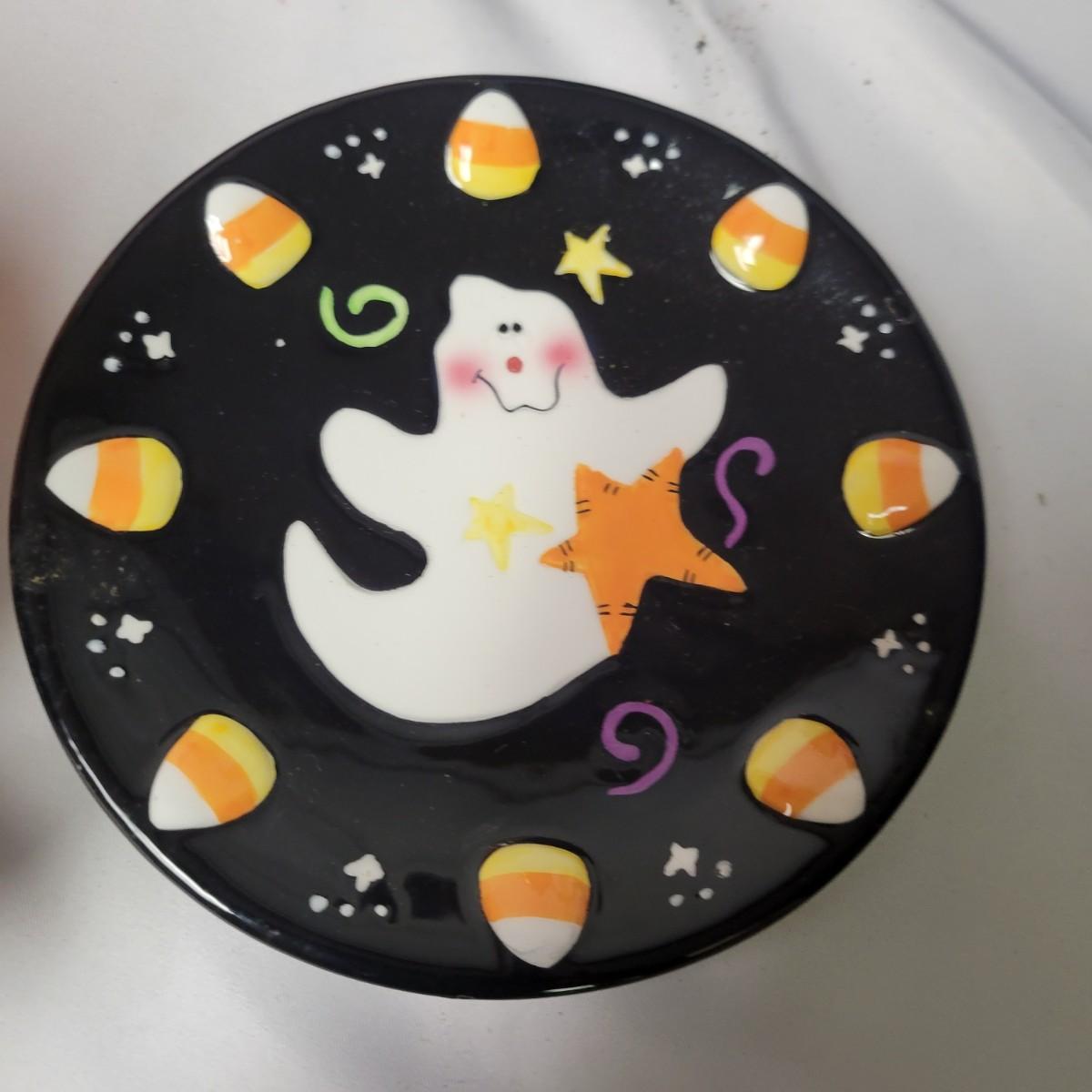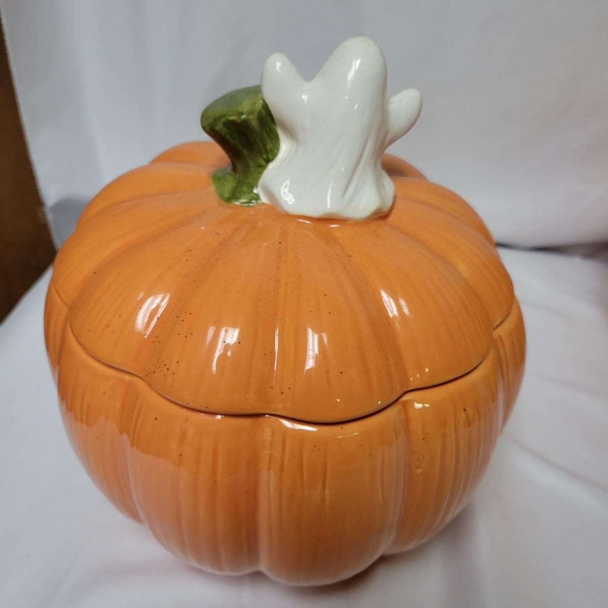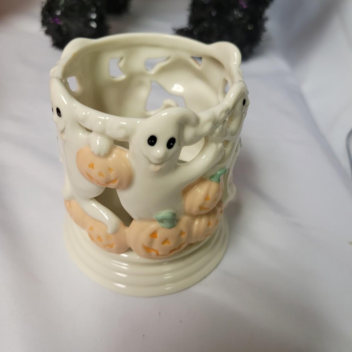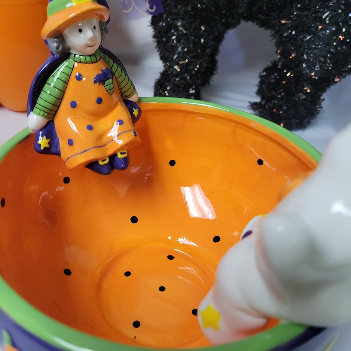 An assortment of Halloween items in good condition, although some of the candles have been lightly used. Included is a cornucopia of pumpkins. Some are ceramic, most are scented candles. A spooky serving bowl, a coffee cup and saucer is also included. A fiber optic motion black cat is also in this lot. Item was tested and works and measures approximately 13" x 5.5" x 14". Local pickup only