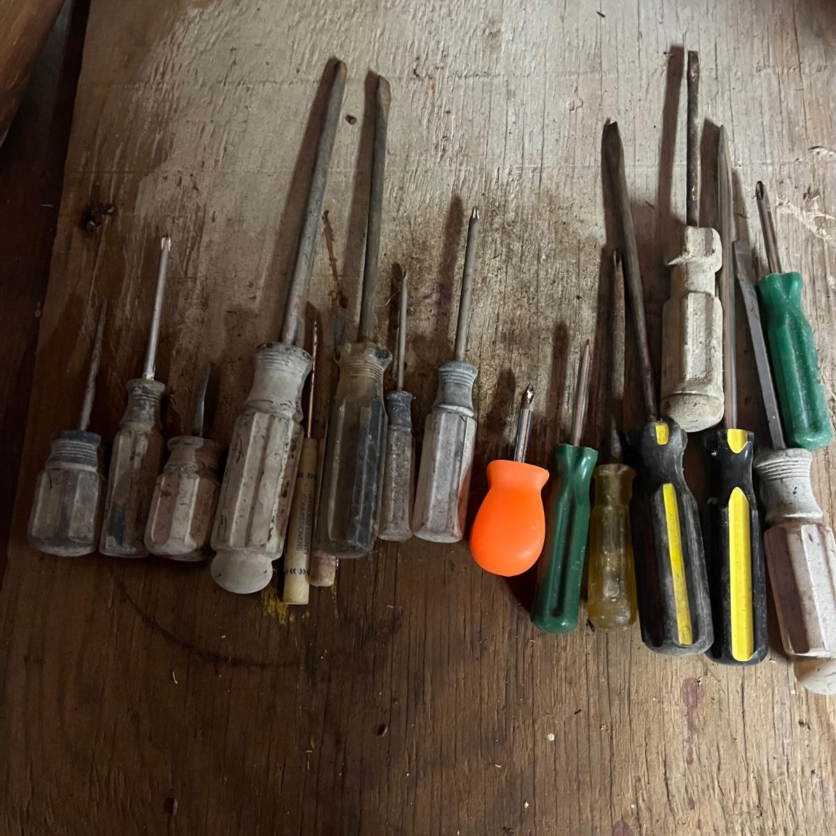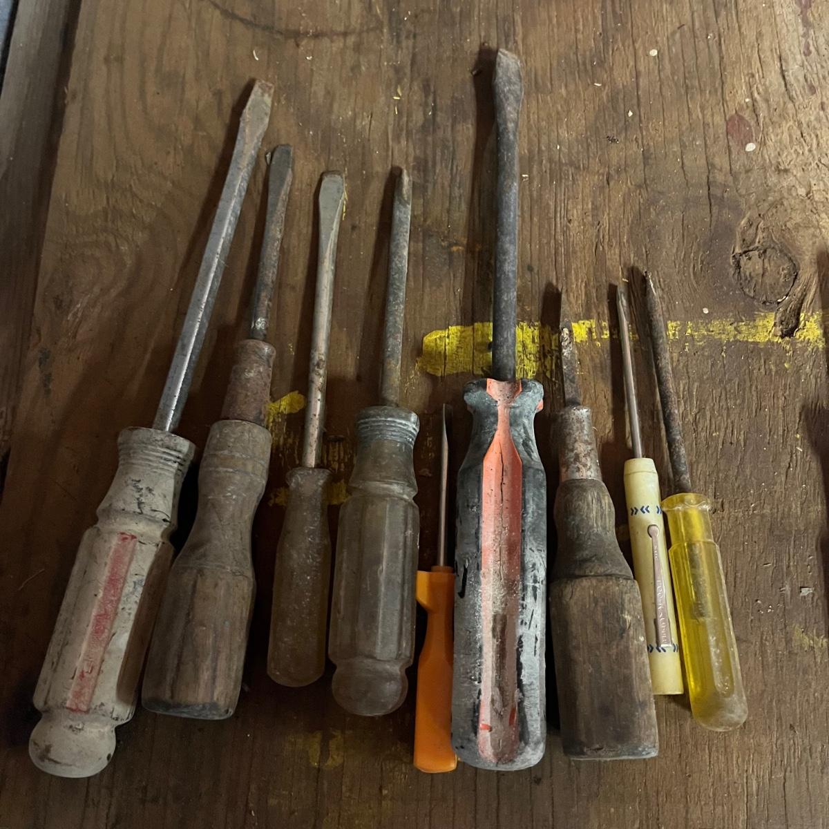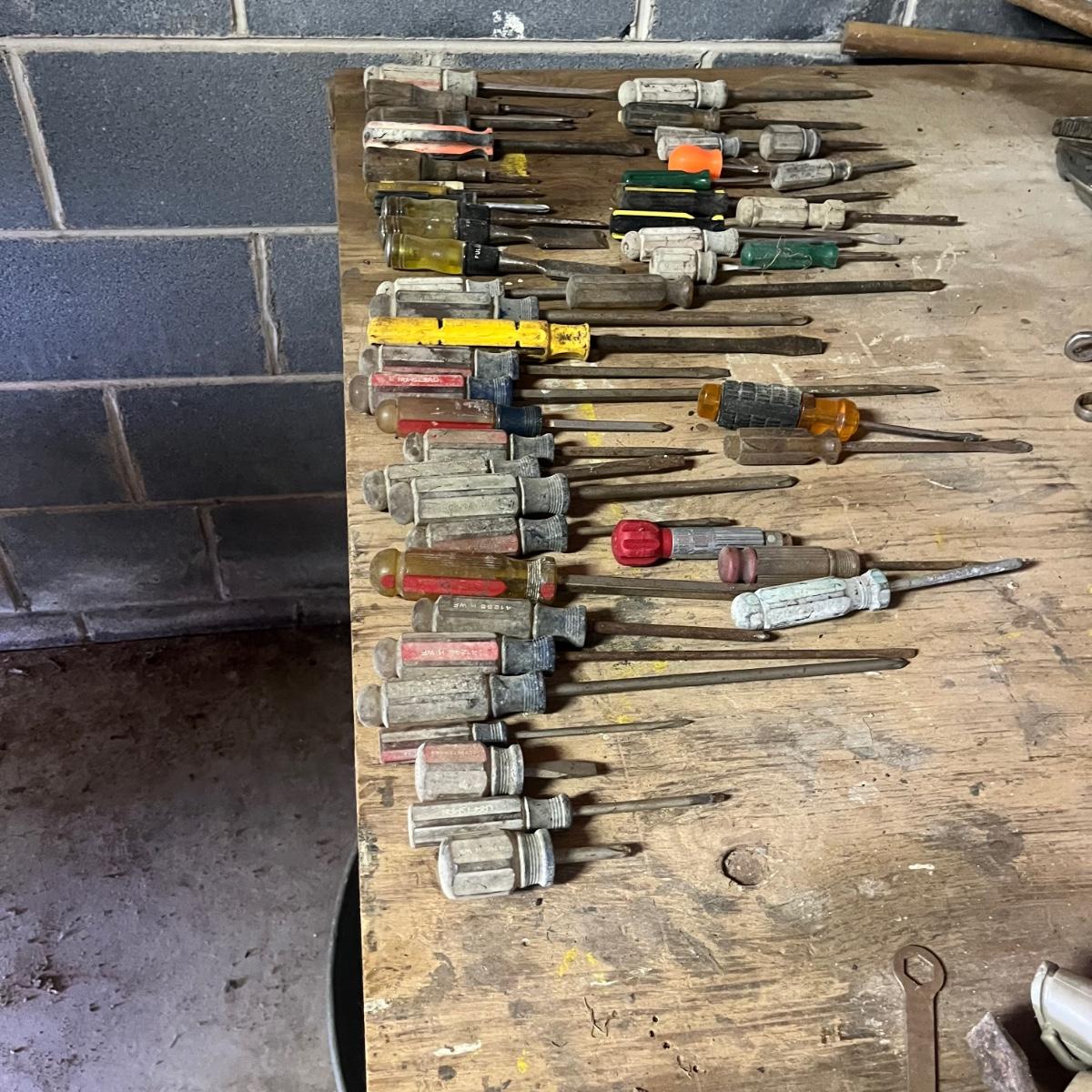 Lot includes 15 Craftsman screwdrivers with the longest screwdriver measuring 16” long. Also includes over twenty screwdrivers in flat and Phillips head and three Fuller chisels.