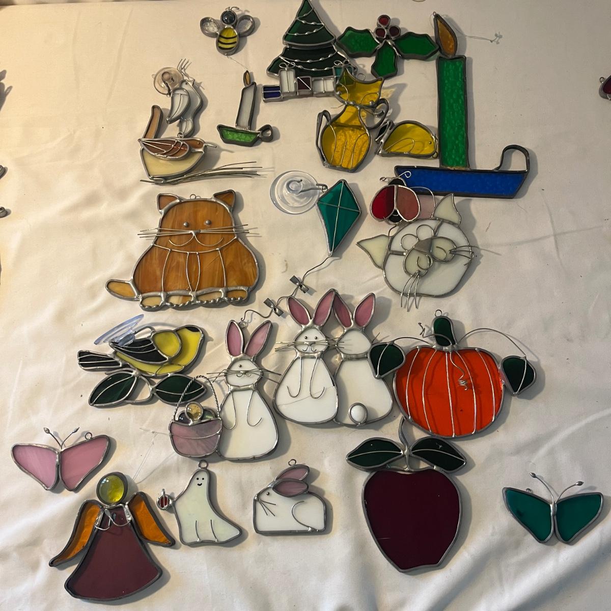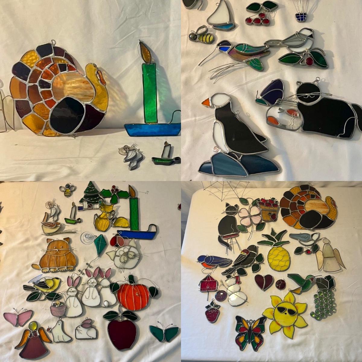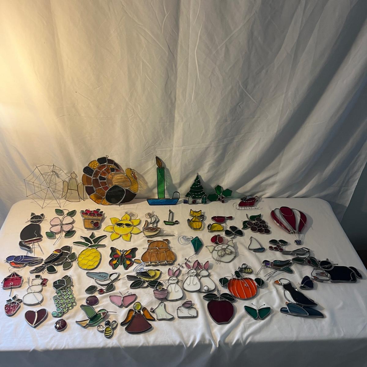 This collection of over 45 stained glass sun catchers are in a variety of designs and sizes. Largest piece measures 8” x 8”.