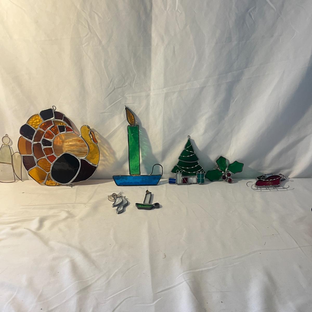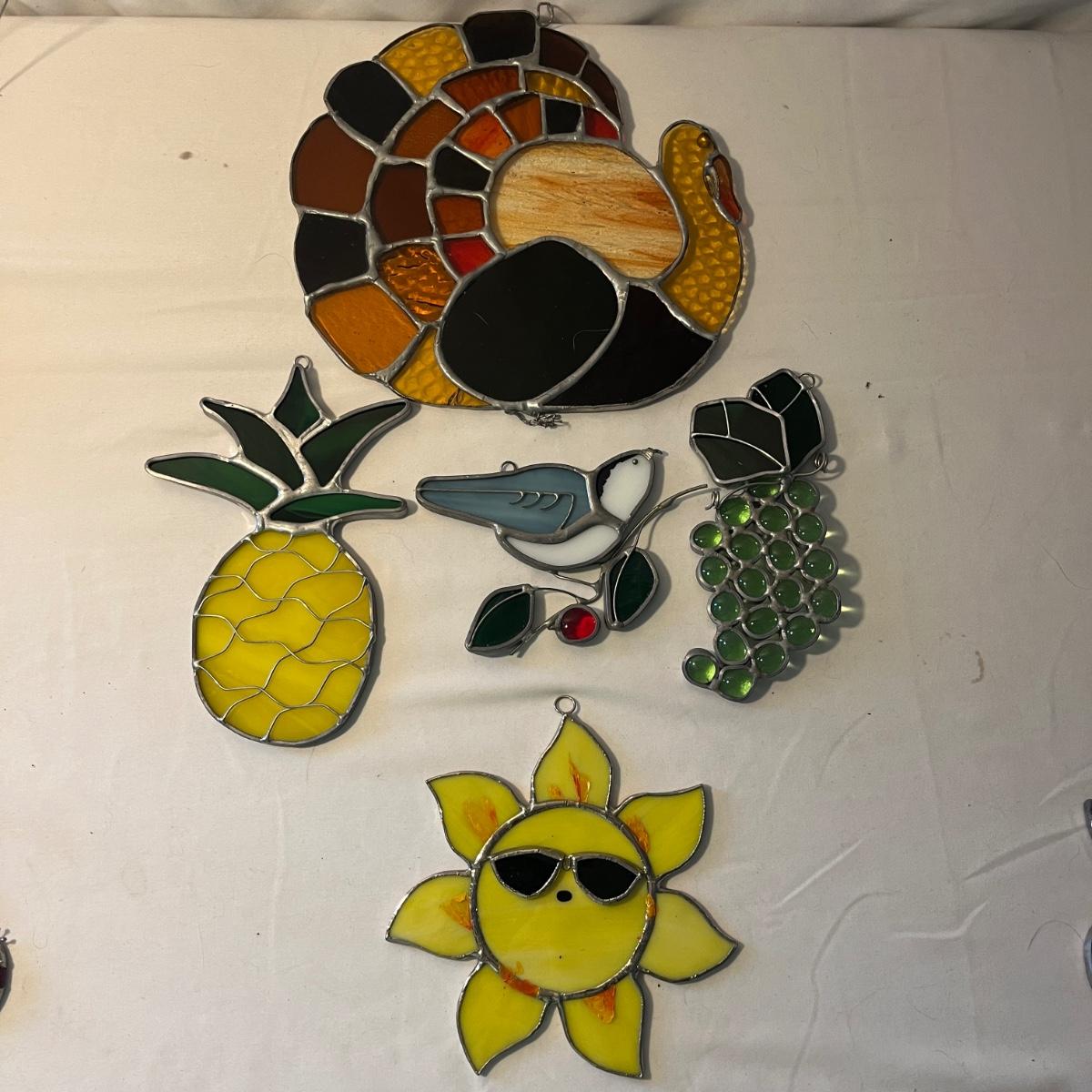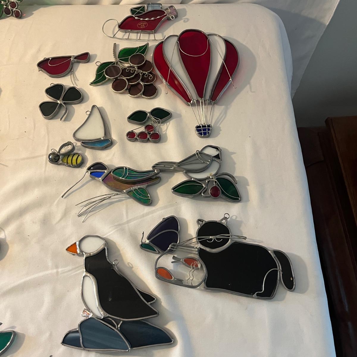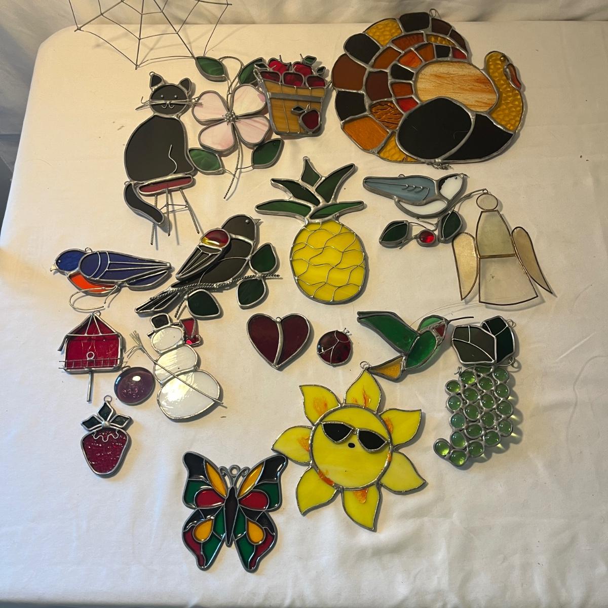 This collection of over 45 stained glass sun catchers are in a variety of designs and sizes. Largest piece measures 8” x 8”.