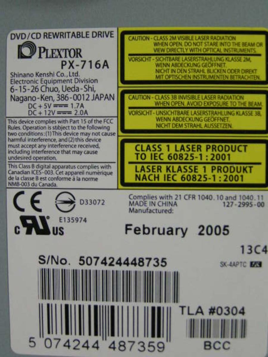 Plextor DVD/CD drive R/RW, mod# PX-716A. Came from a working PC that was replaced by newer model. Not recently tested.