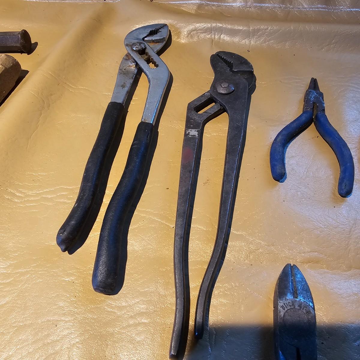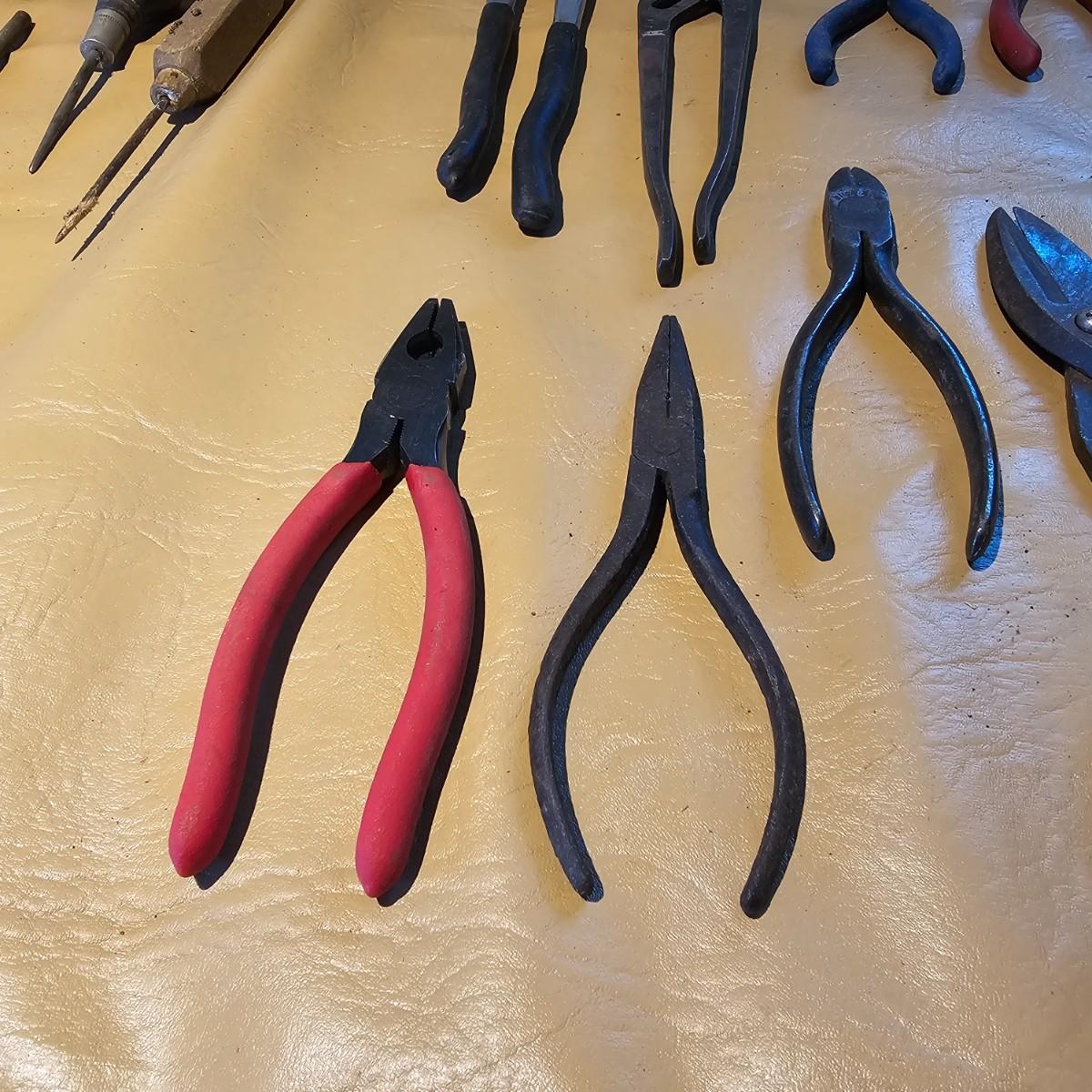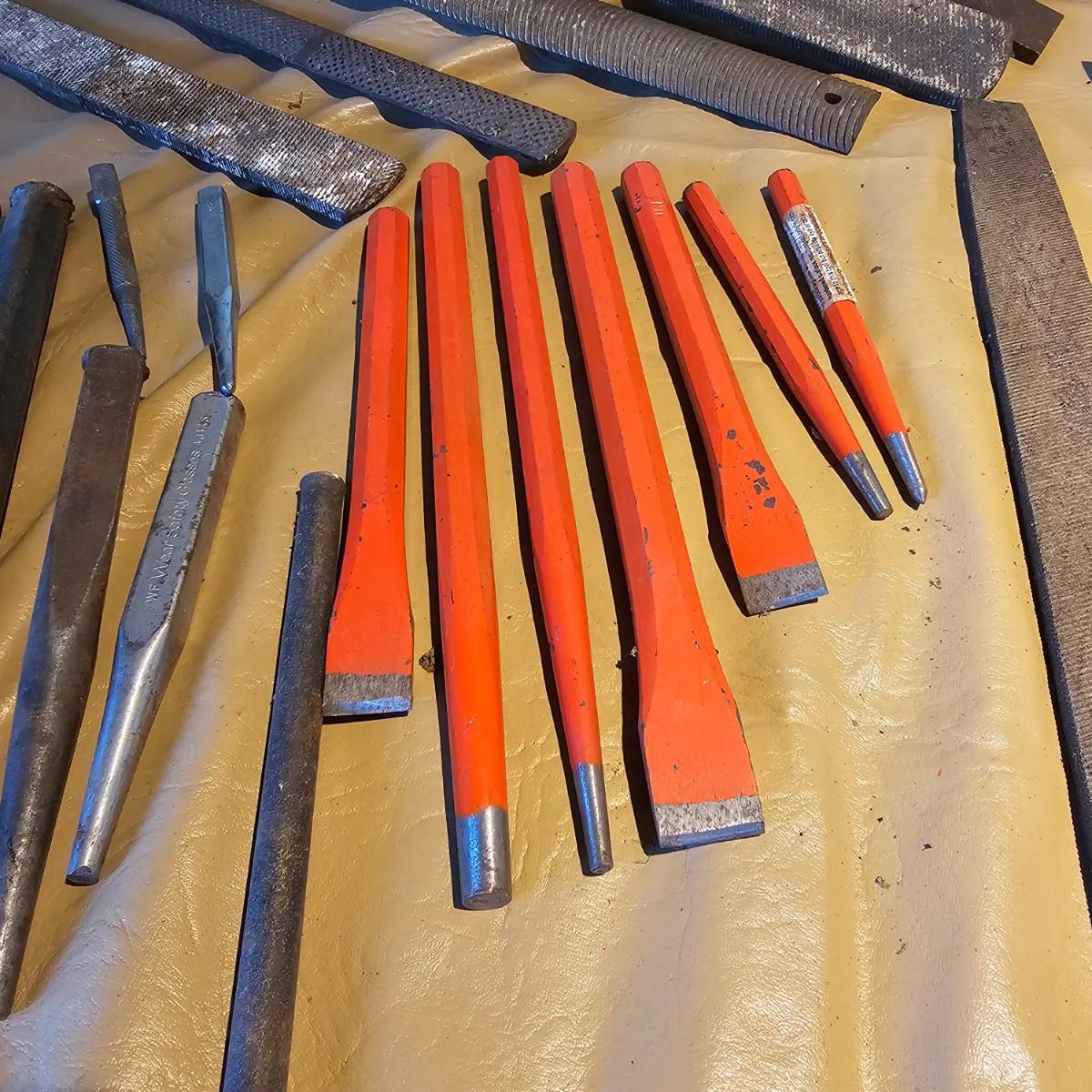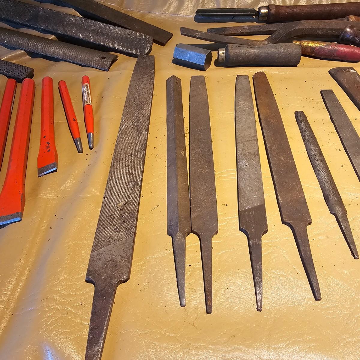 More hand tools, this time assortments of pliers and more. Standard pliers, vice grips, needlenose, channel locks, more. Also includes standard files, wood rasps, drifts, punches, chisels, awls, more. Some items need tlc, see photos for details. Shipping available.