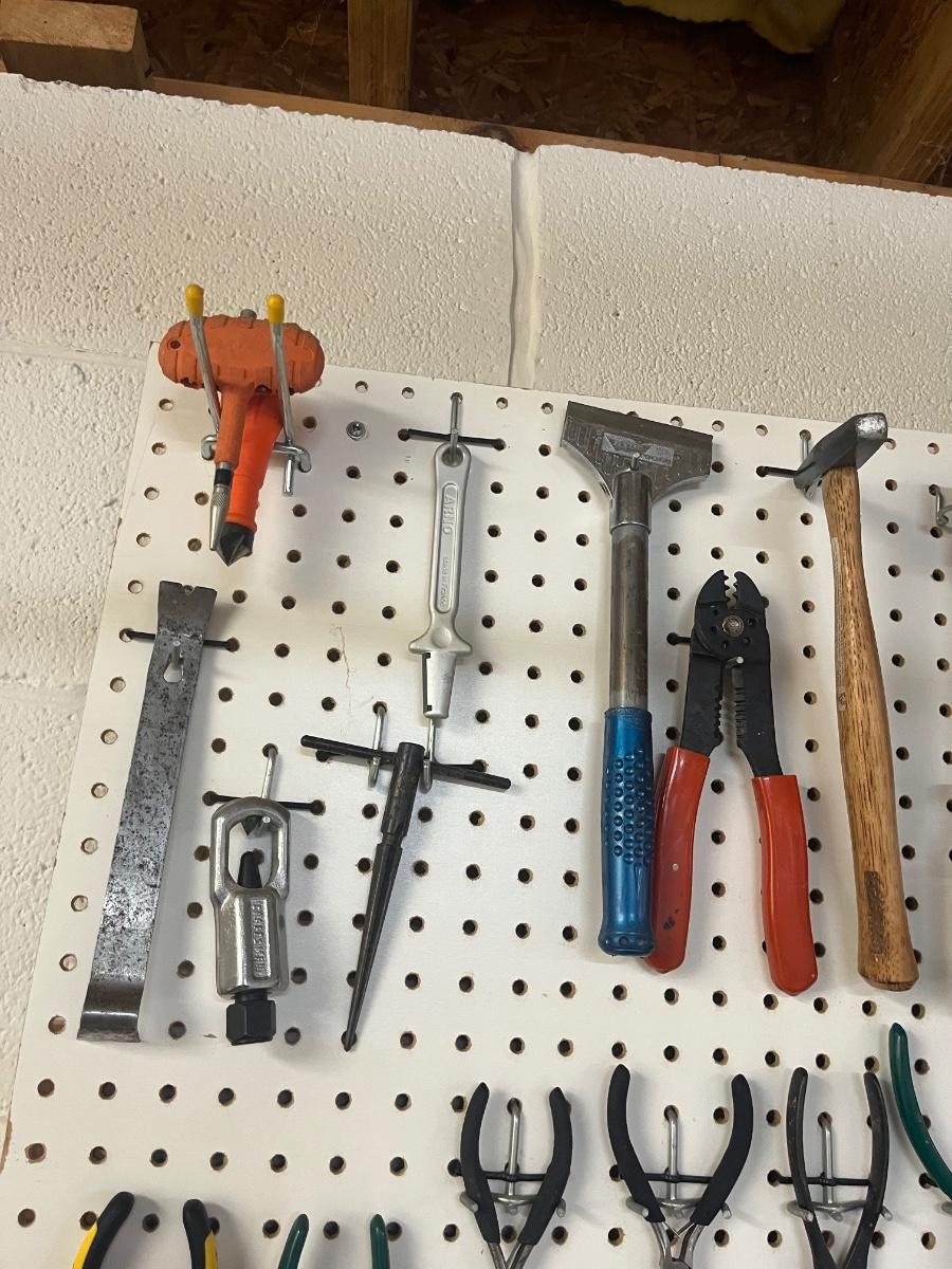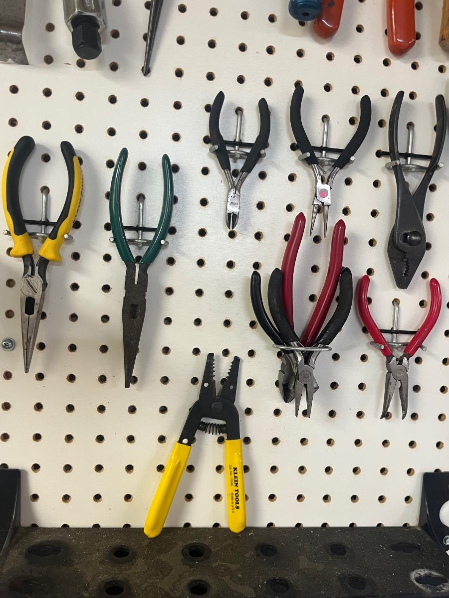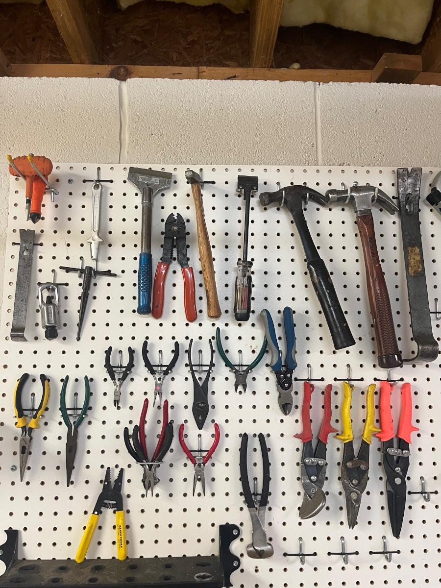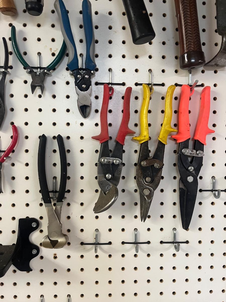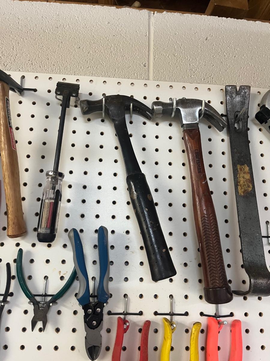 Lot includes over twenty five pliers in a variety of styles and sizes. Also includes hammers, chisels, saws, metal rulers staplers and more. Pegboard not included.