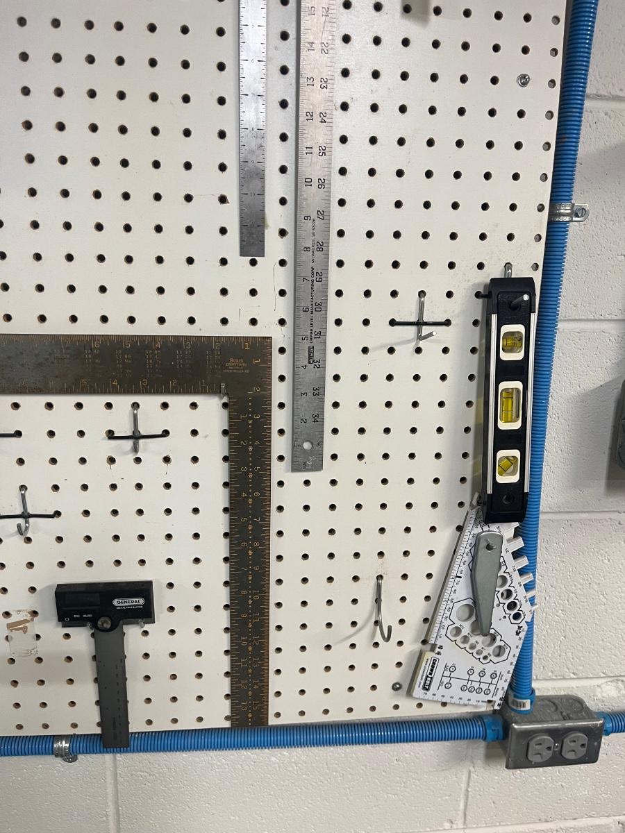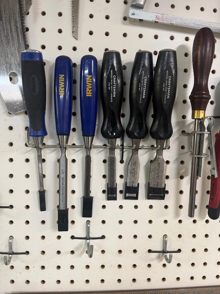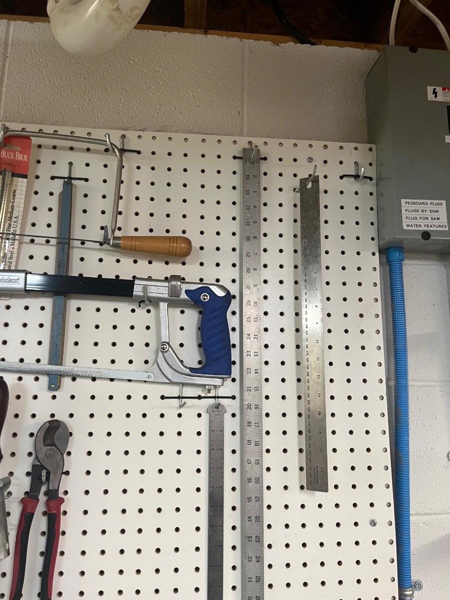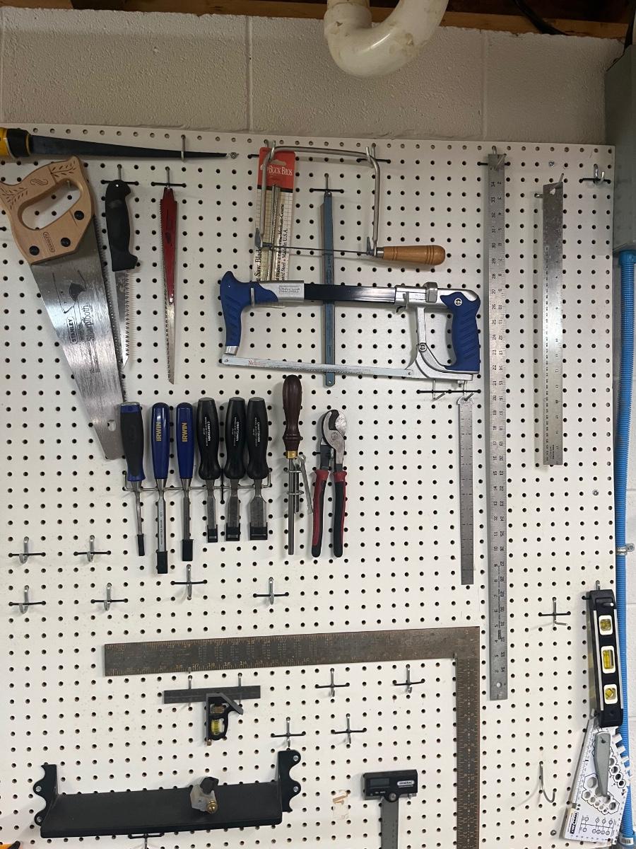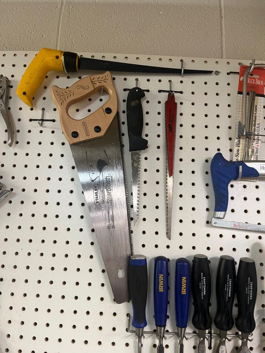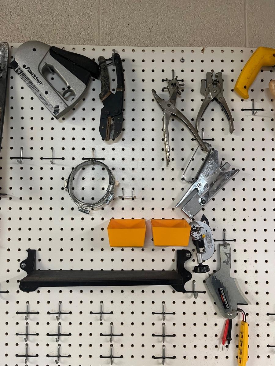 Lot includes over twenty five pliers in a variety of styles and sizes. Also includes hammers, chisels, saws, metal rulers staplers and more. Pegboard not included.