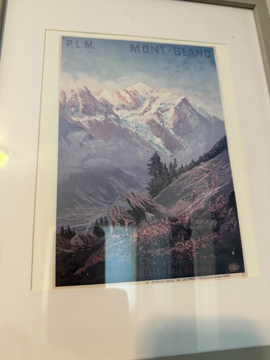 Classic travel print featuring Mont Blanc with floral foreground. Crisp and bright in a pale frame.