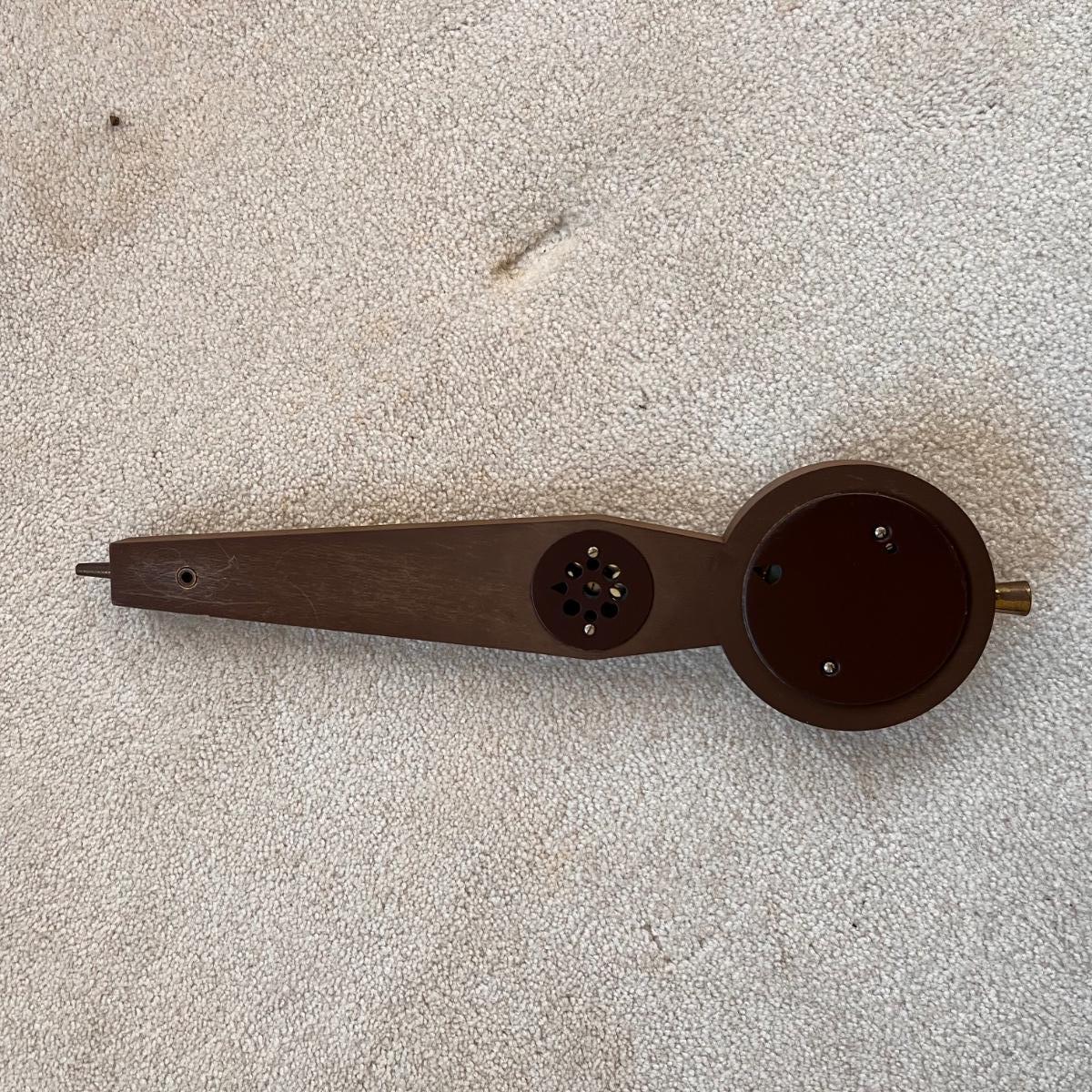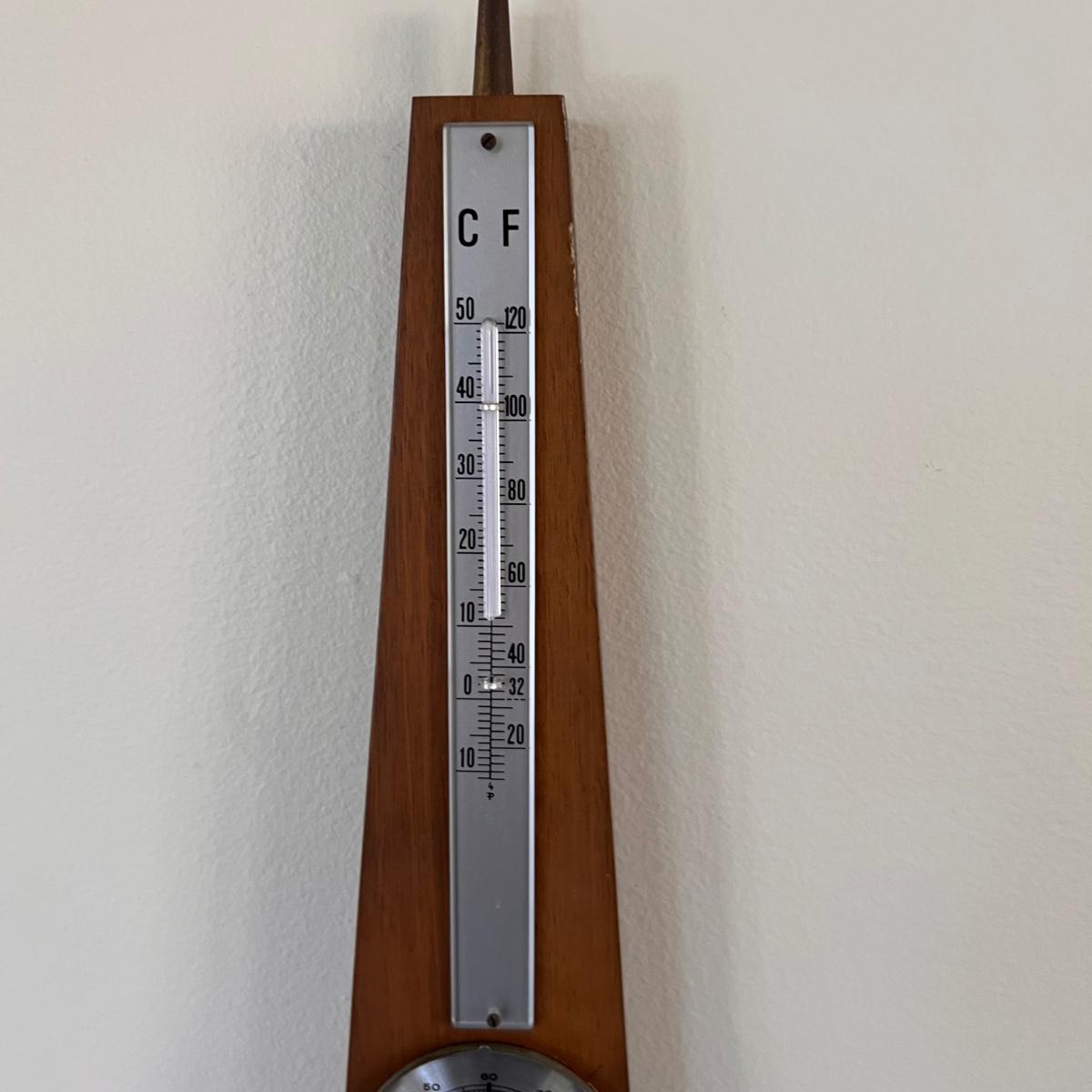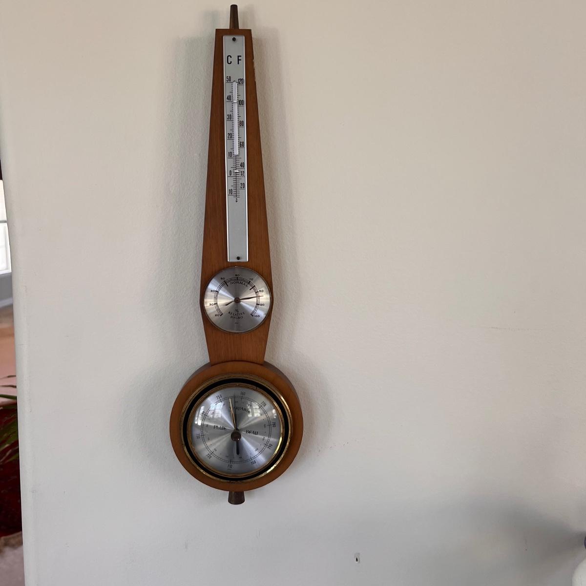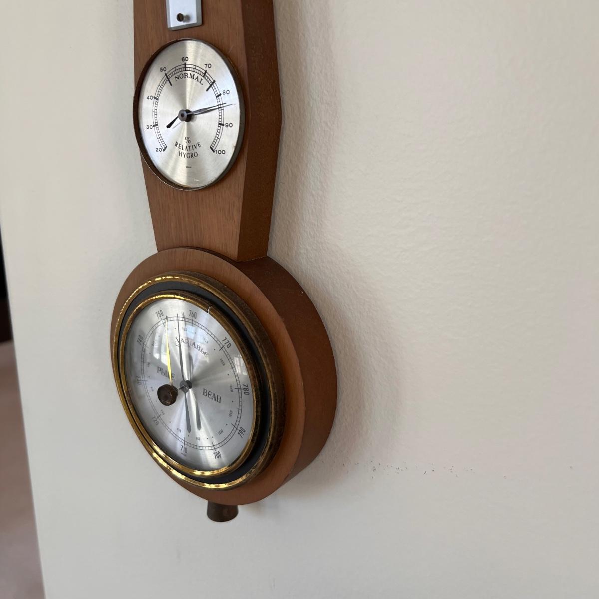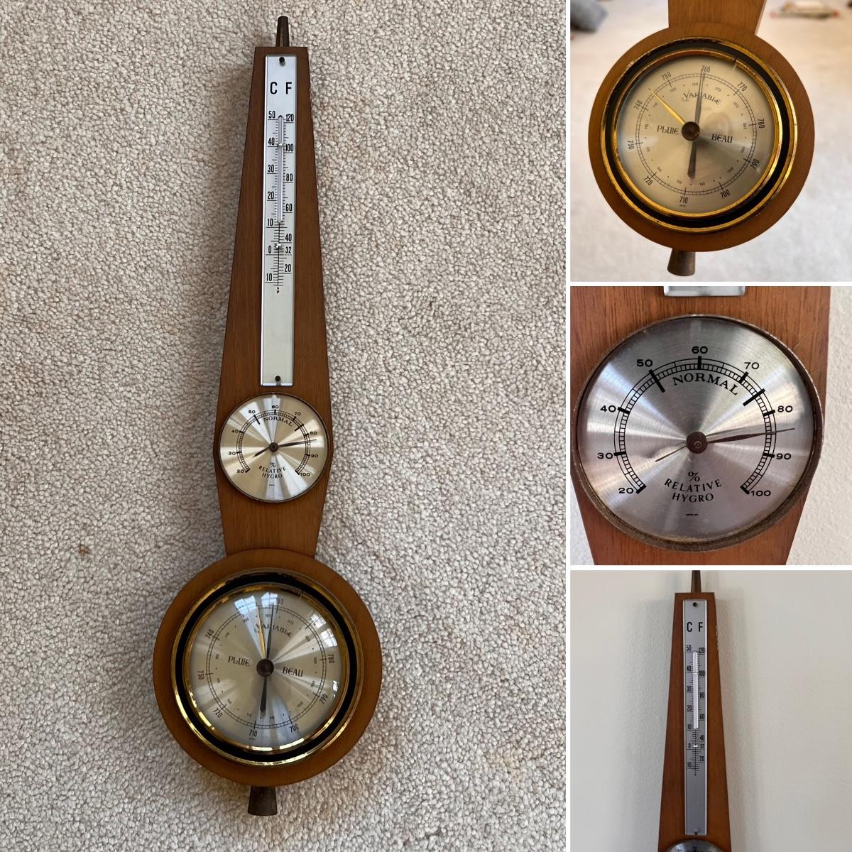 This barometer from Germany is Pluie Beau Variable. A good looking display piece only as it is not working; the thermometer glass is broken and the relative hydro dial is missing its glass cover and the lower dial has a crack in its brass colored surround, all shown in pics. It measures 5” x 1” x 16”H.