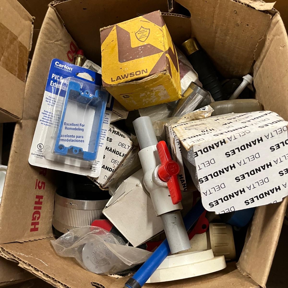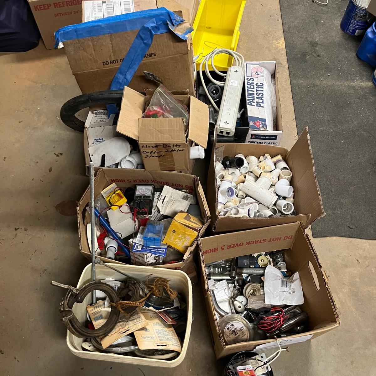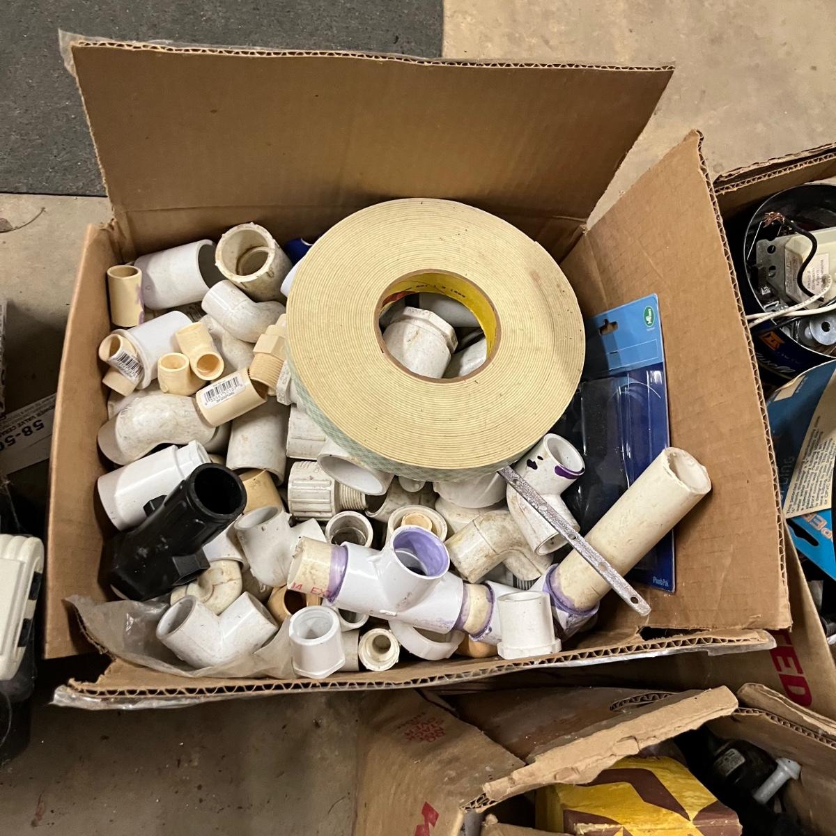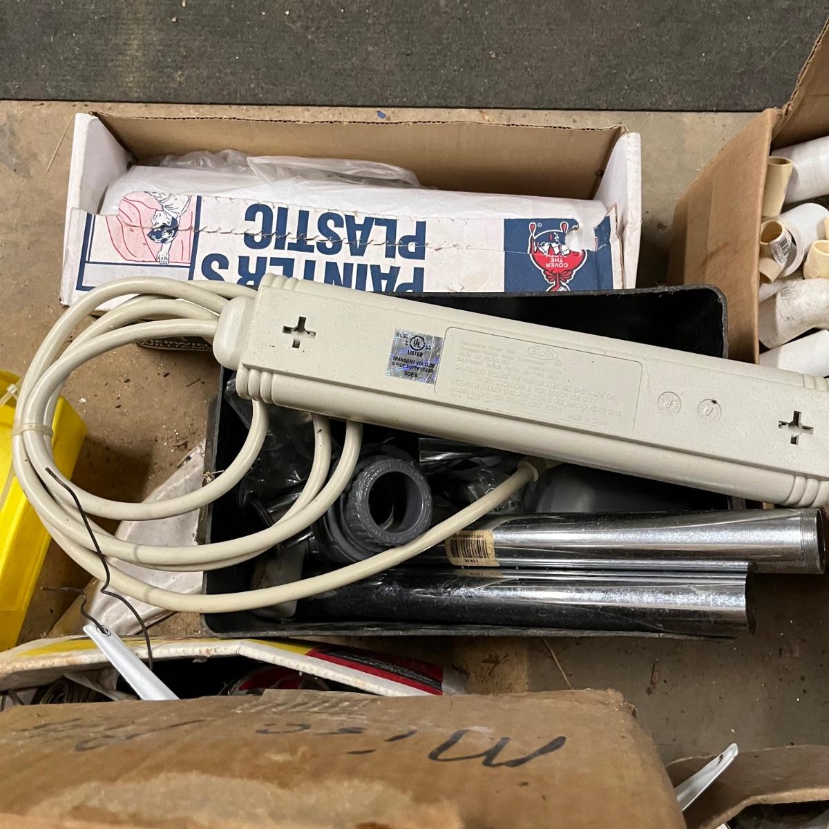 Lot contains a plethora of plumbing and electrical supplies including fish tape, multi meter, PVC fittings, plastic, new toilet seats, switches shelf supports and more.