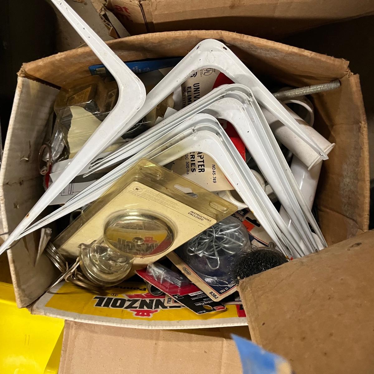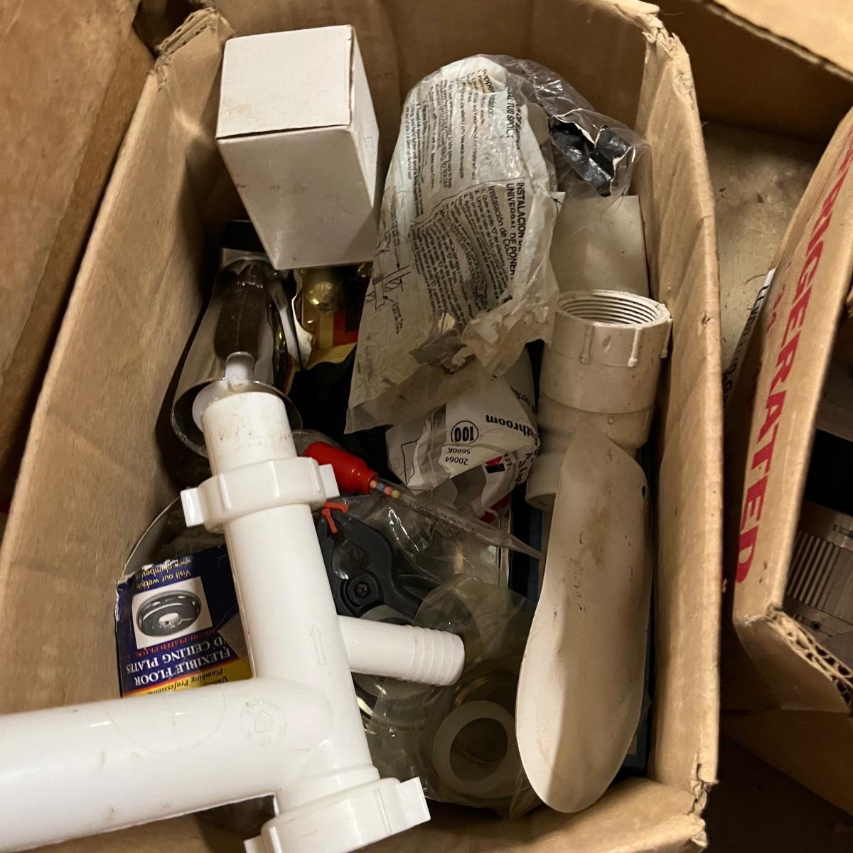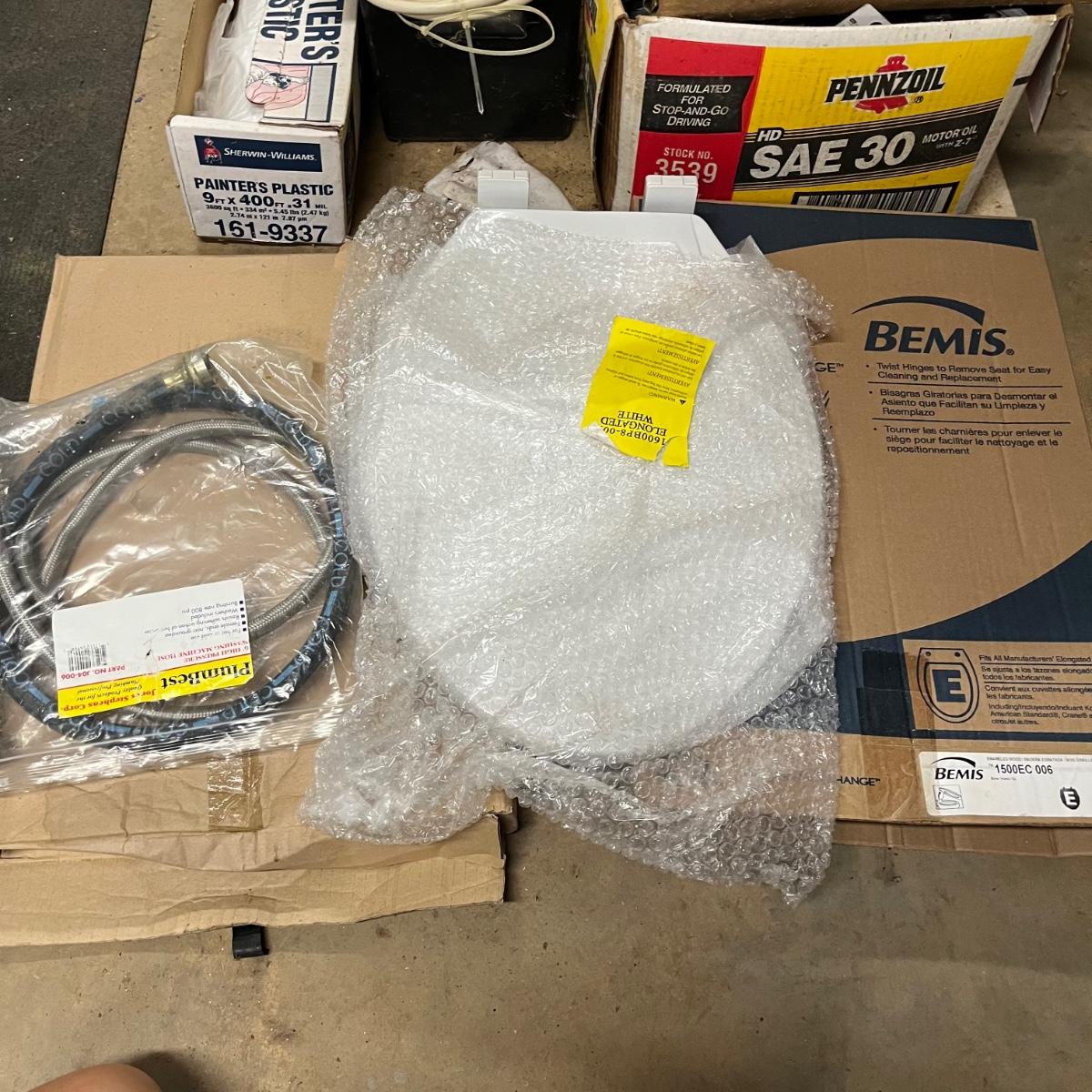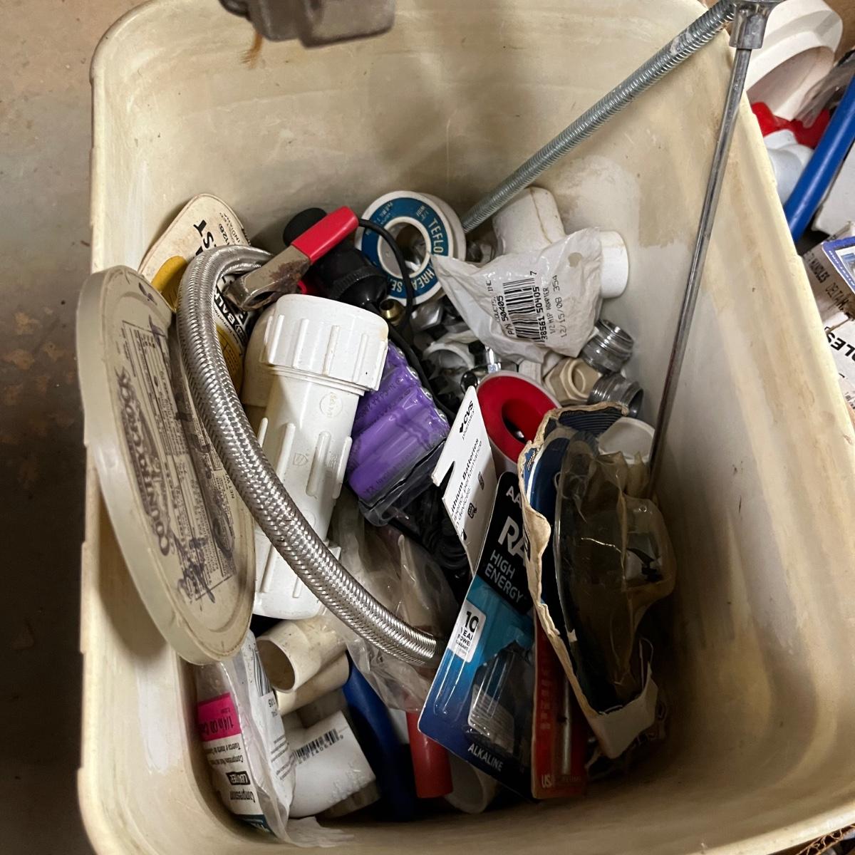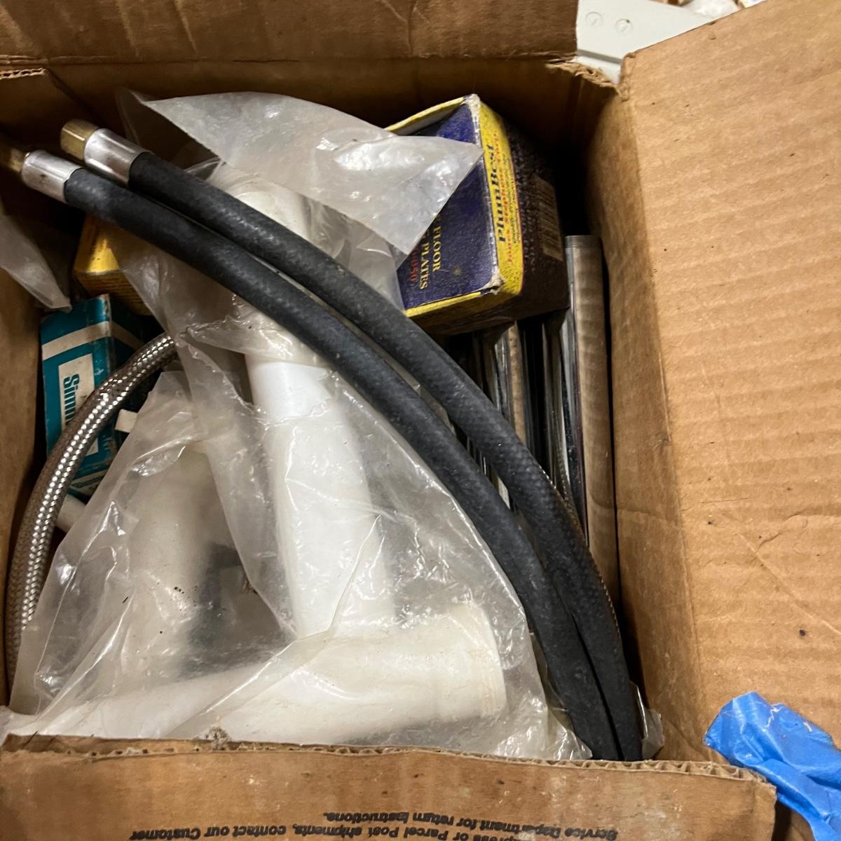 Lot contains a plethora of plumbing and electrical supplies including fish tape, multi meter, PVC fittings, plastic, new toilet seats, switches shelf supports and more.