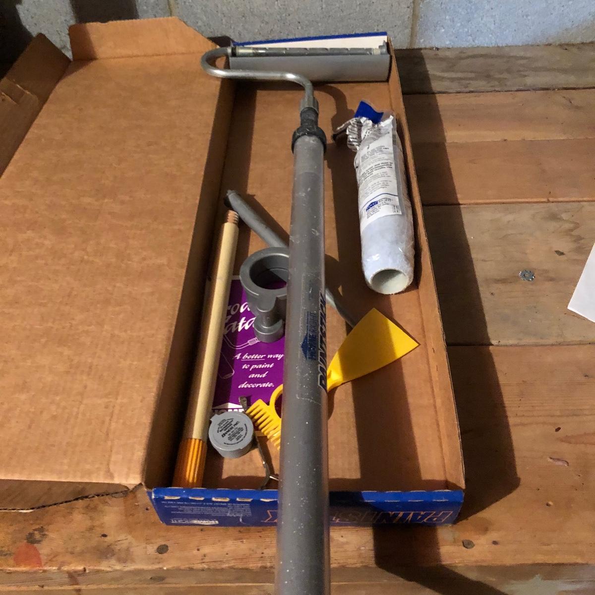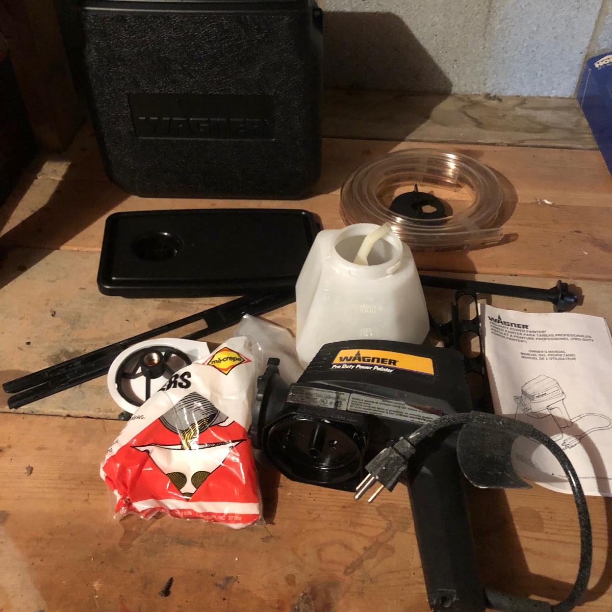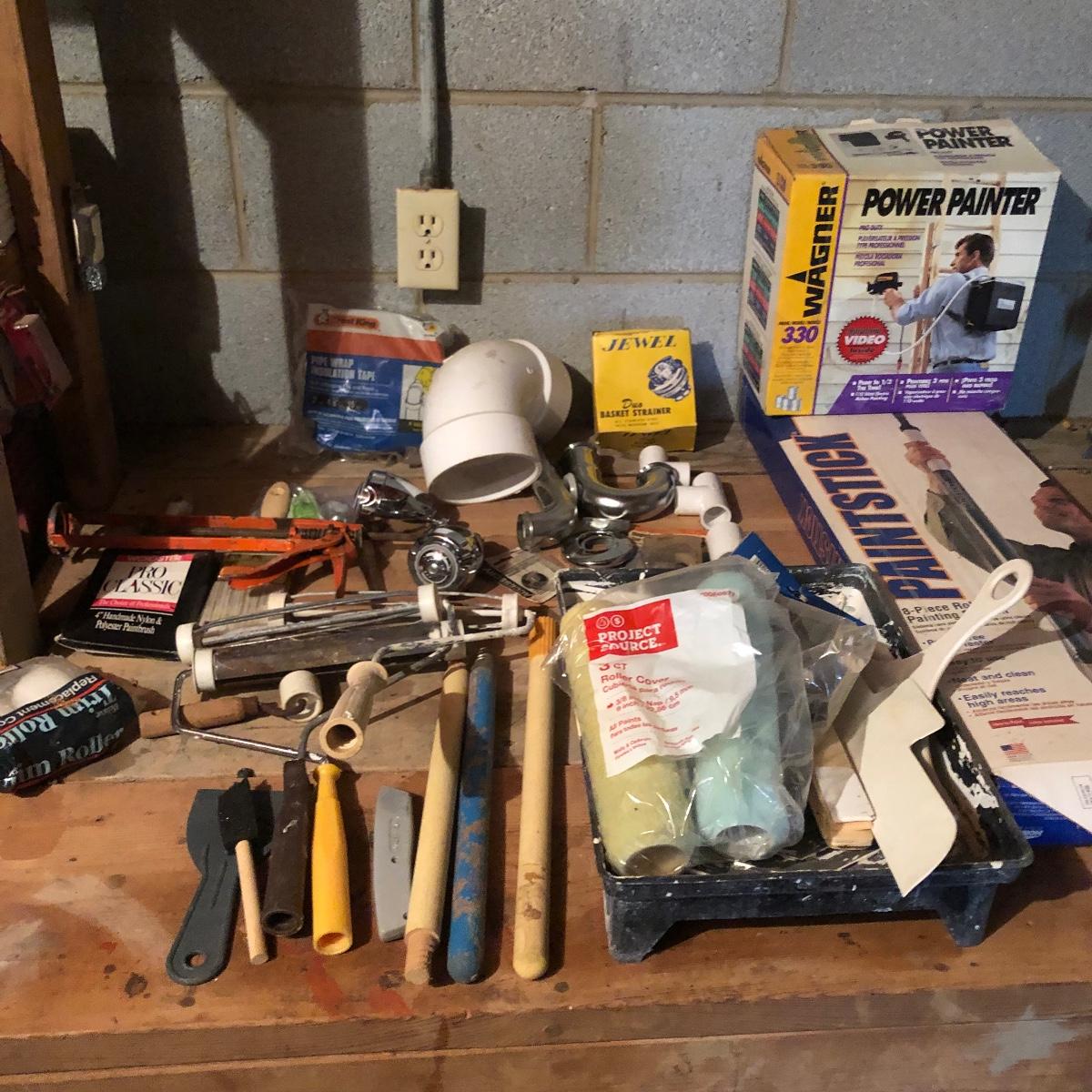 Lot includes a Wagner model# 330 power painter, Paintstick, brushes, rollers, paint tray, caulking gun, utility knife, pvc fittings, shower heads, pipe wrap and more.