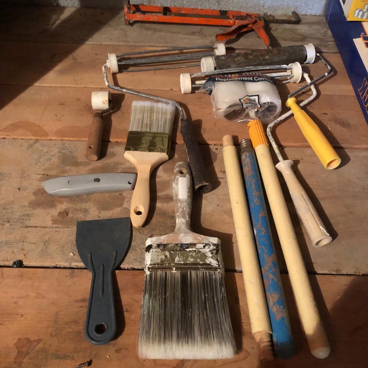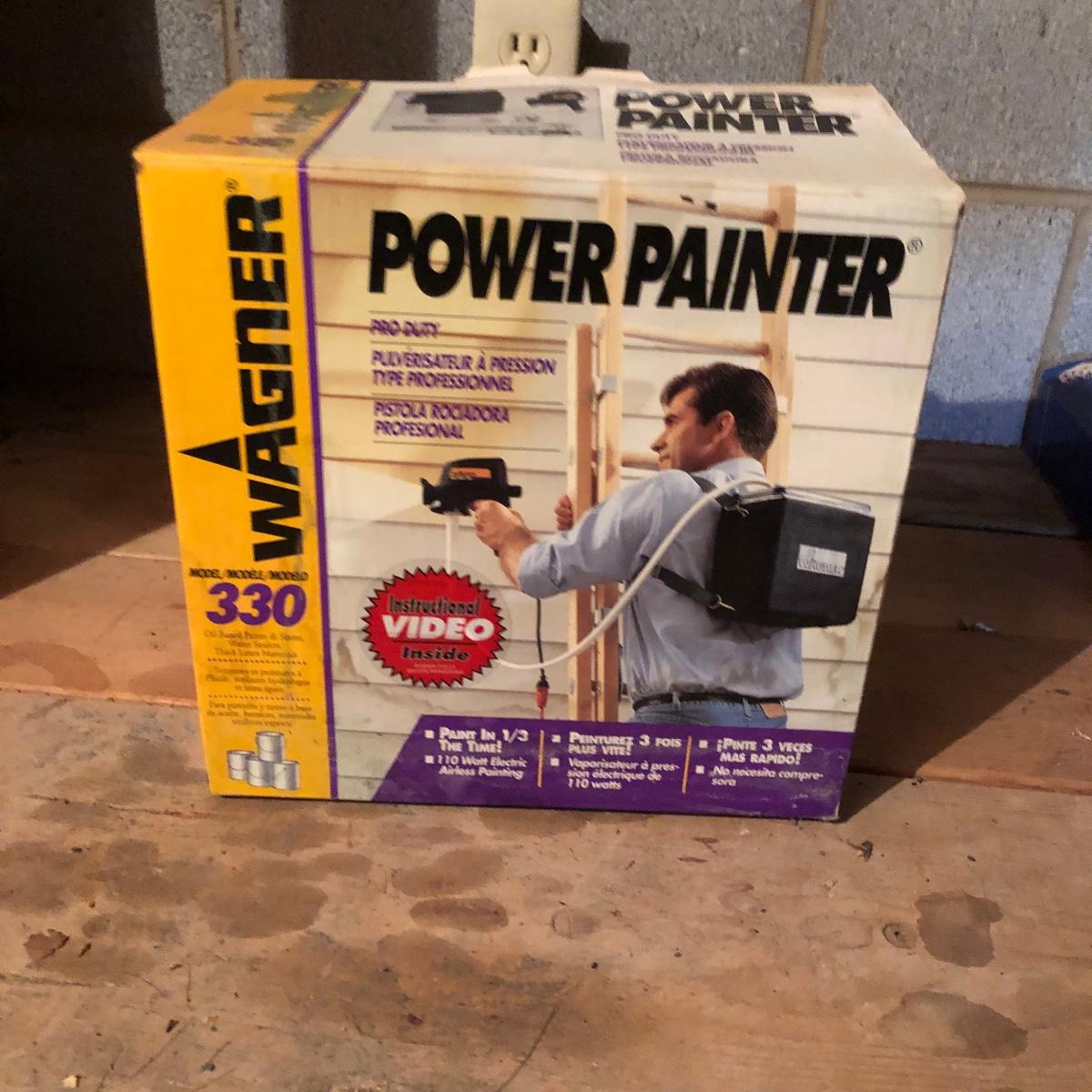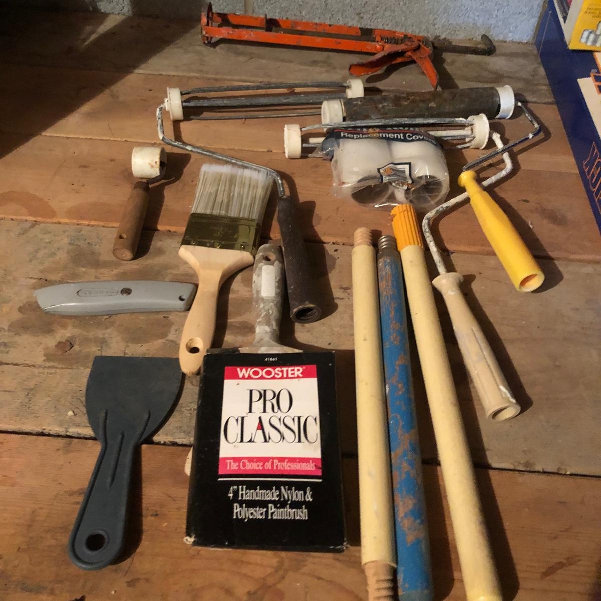 Lot includes a Wagner model# 330 power painter, Paintstick, brushes, rollers, paint tray, caulking gun, utility knife, pvc fittings, shower heads, pipe wrap and more.