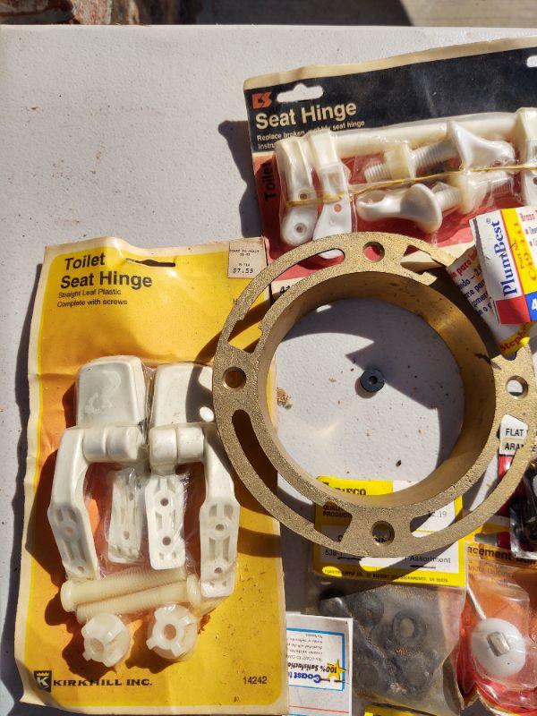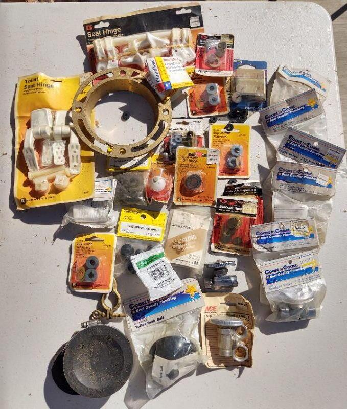 lot 11 - Plumbing parts, brass flange, toilet ball, hinges, joints, washers, valves, etc.