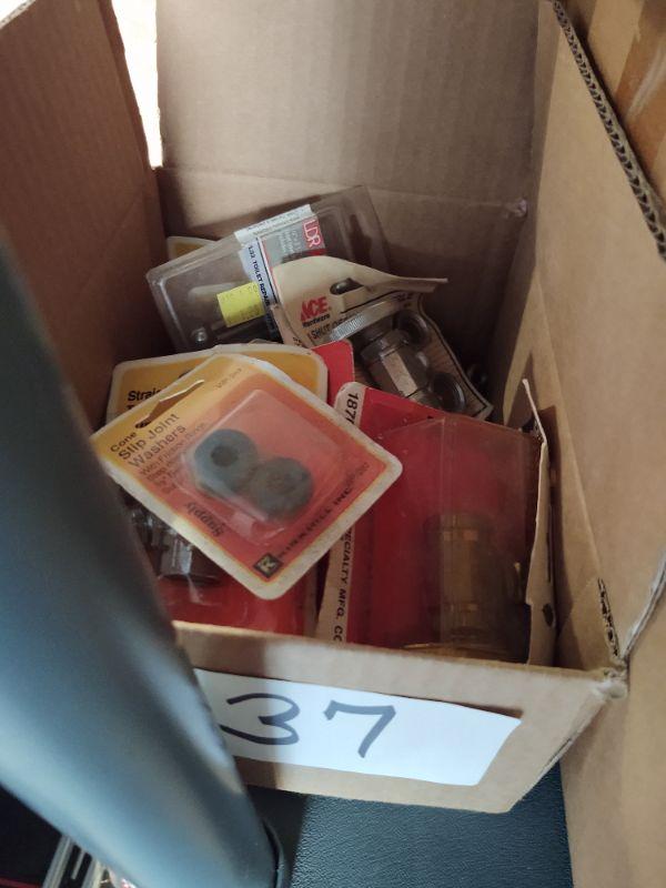 Brass water hose, water heater parts, valves, pipe measure, washers, asstd parts as shown