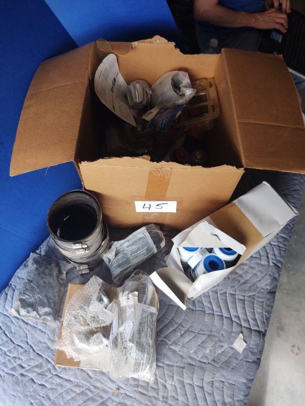 LOT 45 - Plumbing parts, Case of teflon tape, hose clamps, washers, p-trap, tub spout, faucet knobs, etc. as shown