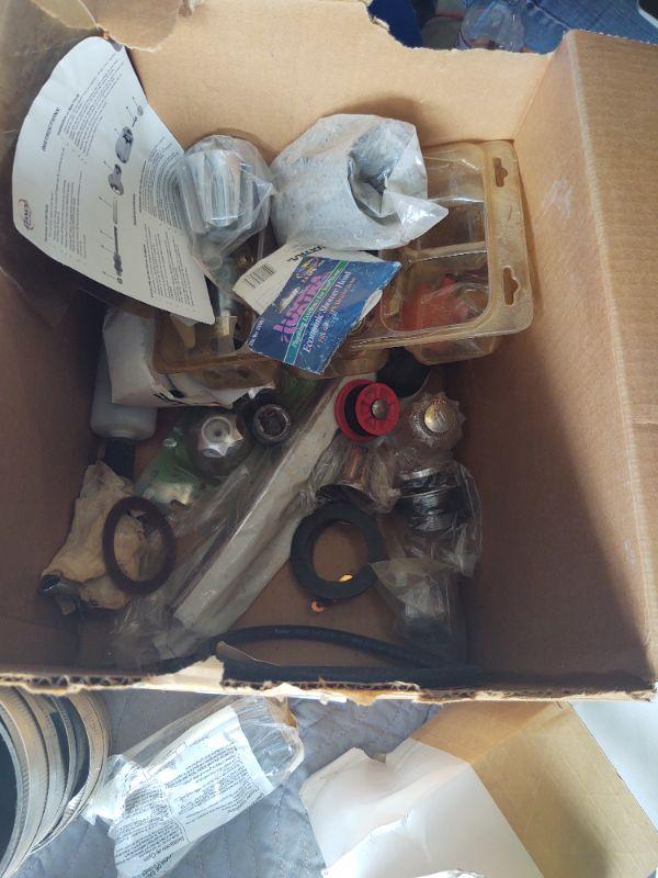 Plumbing parts, Case of teflon tape, hose clamps, washers, p-trap, tub spout, faucet knobs, etc. as shown