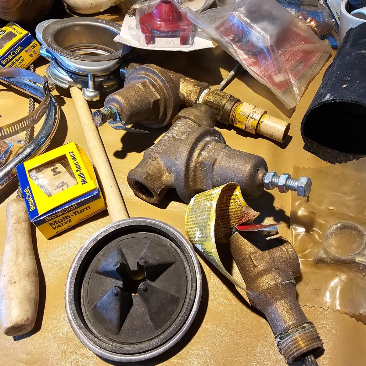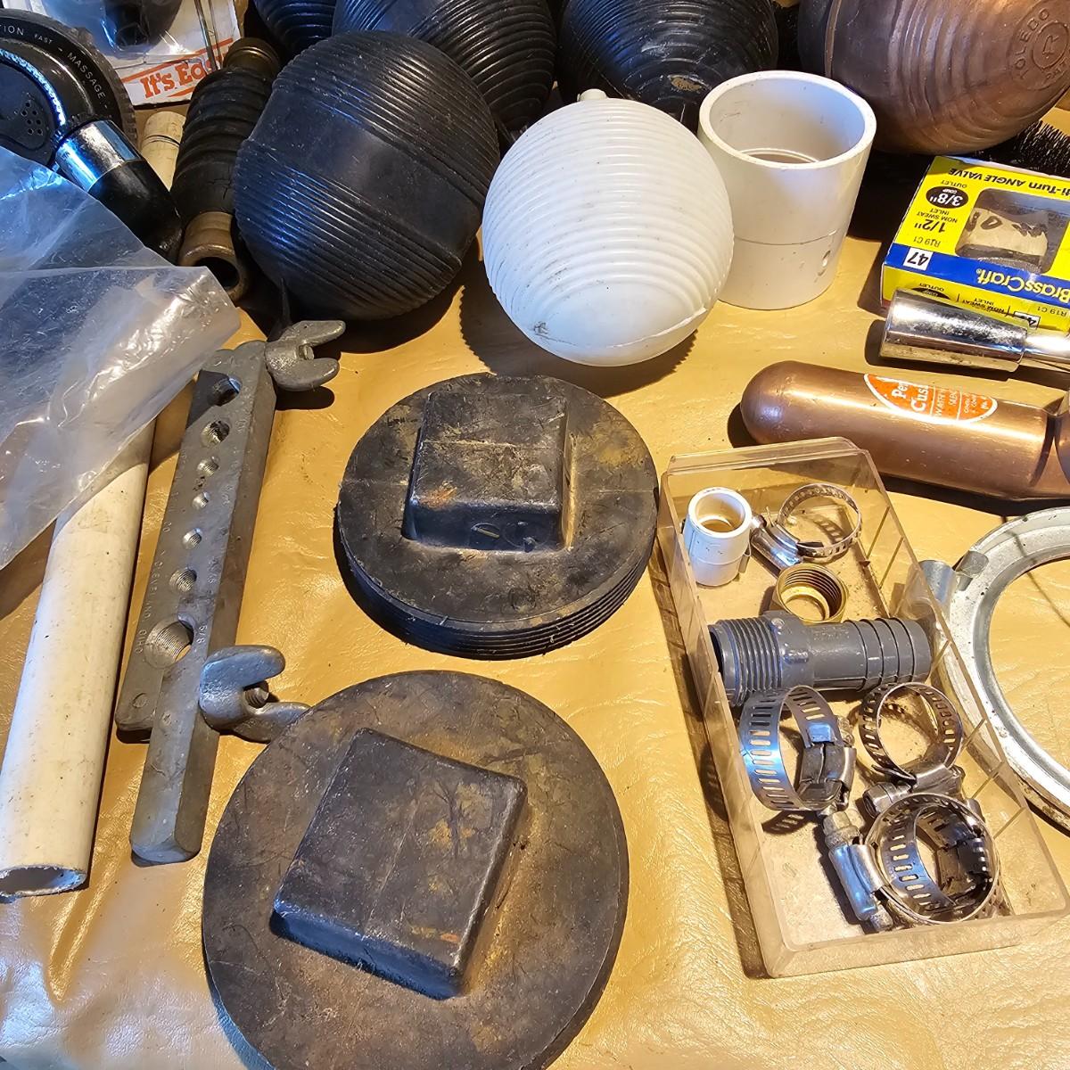 Floats, valves, clamps, couplings, bowl rings, more. Many miscellaneous parts and fittings, some new and some used. Also includes several pieces of PVC pipe. See photos for details. Local pickup only.