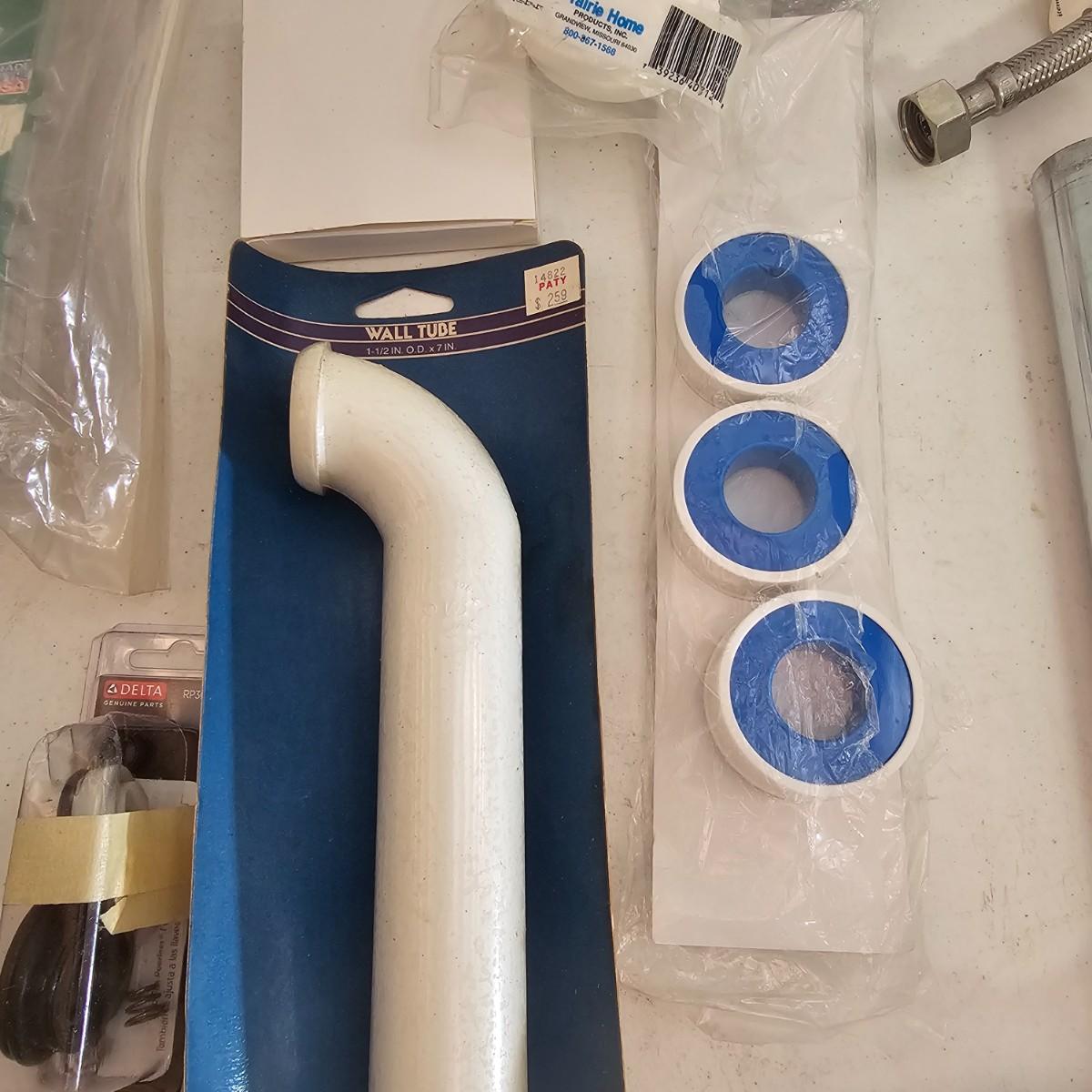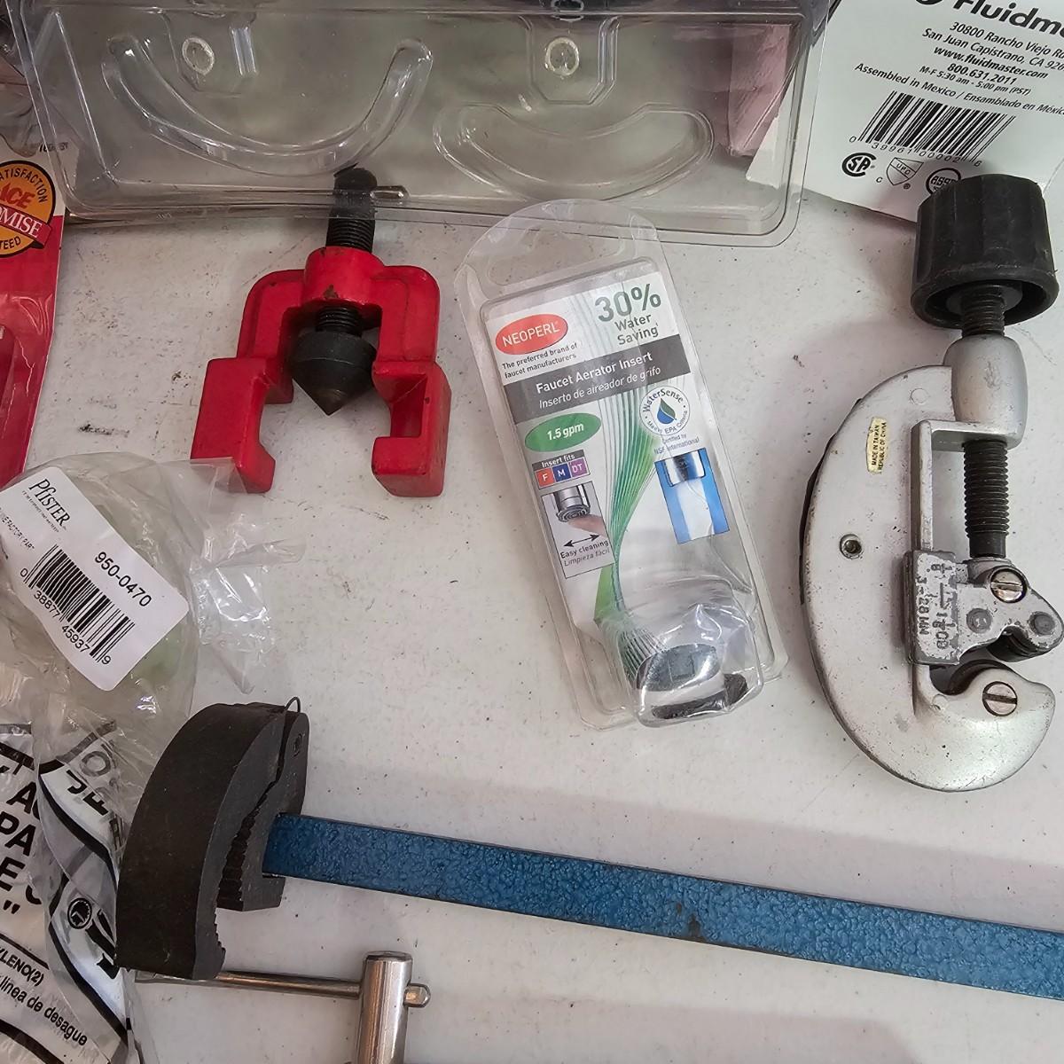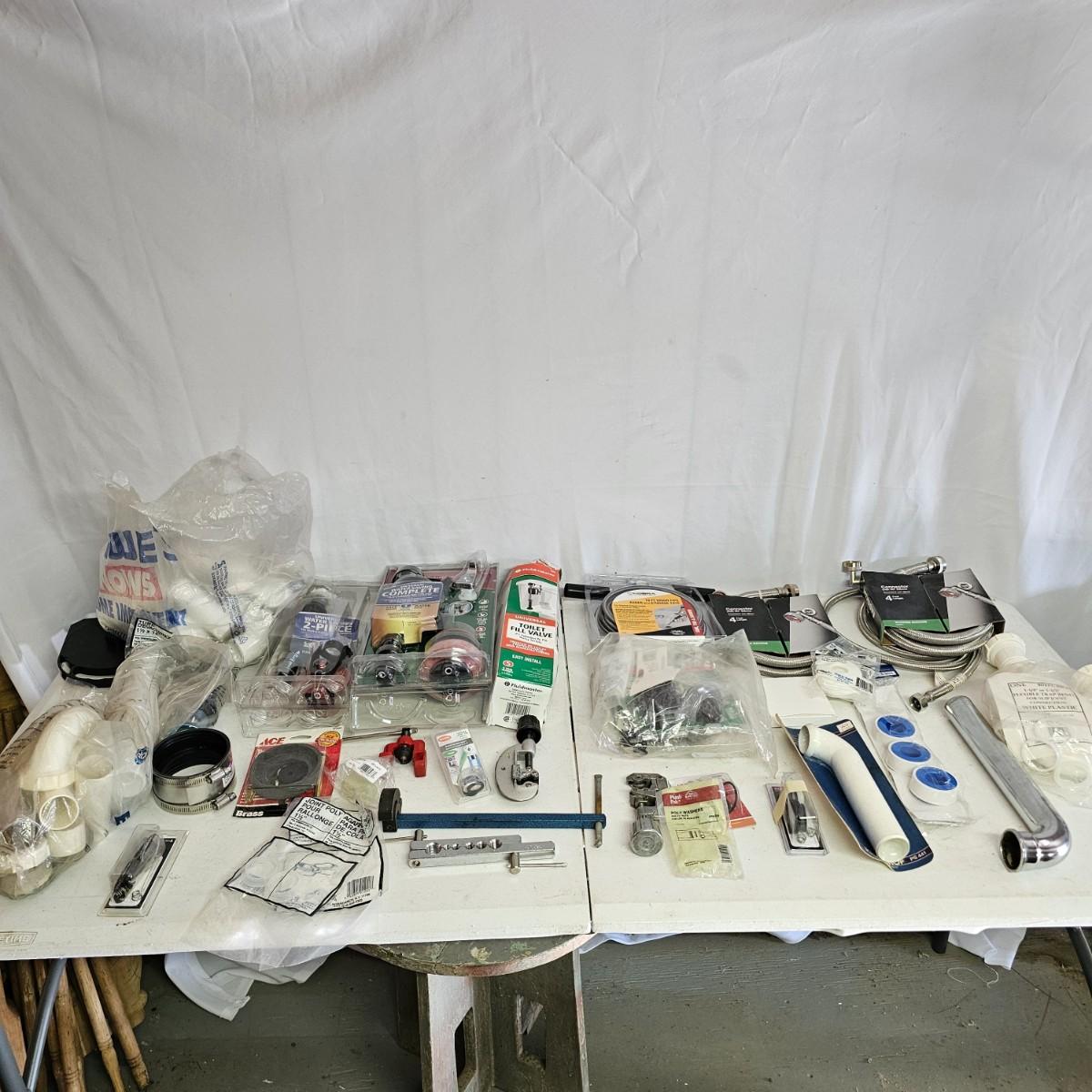 Valve repair kits, assorted pieces of PVC pipe in different sizes, tools and more. Teflon tape for wrapping joints, pipe cutters, flaring tools, basin wrench. Several new stainless supply line pieces. Washers, fittings, etc. See photos for details. Shipping available.