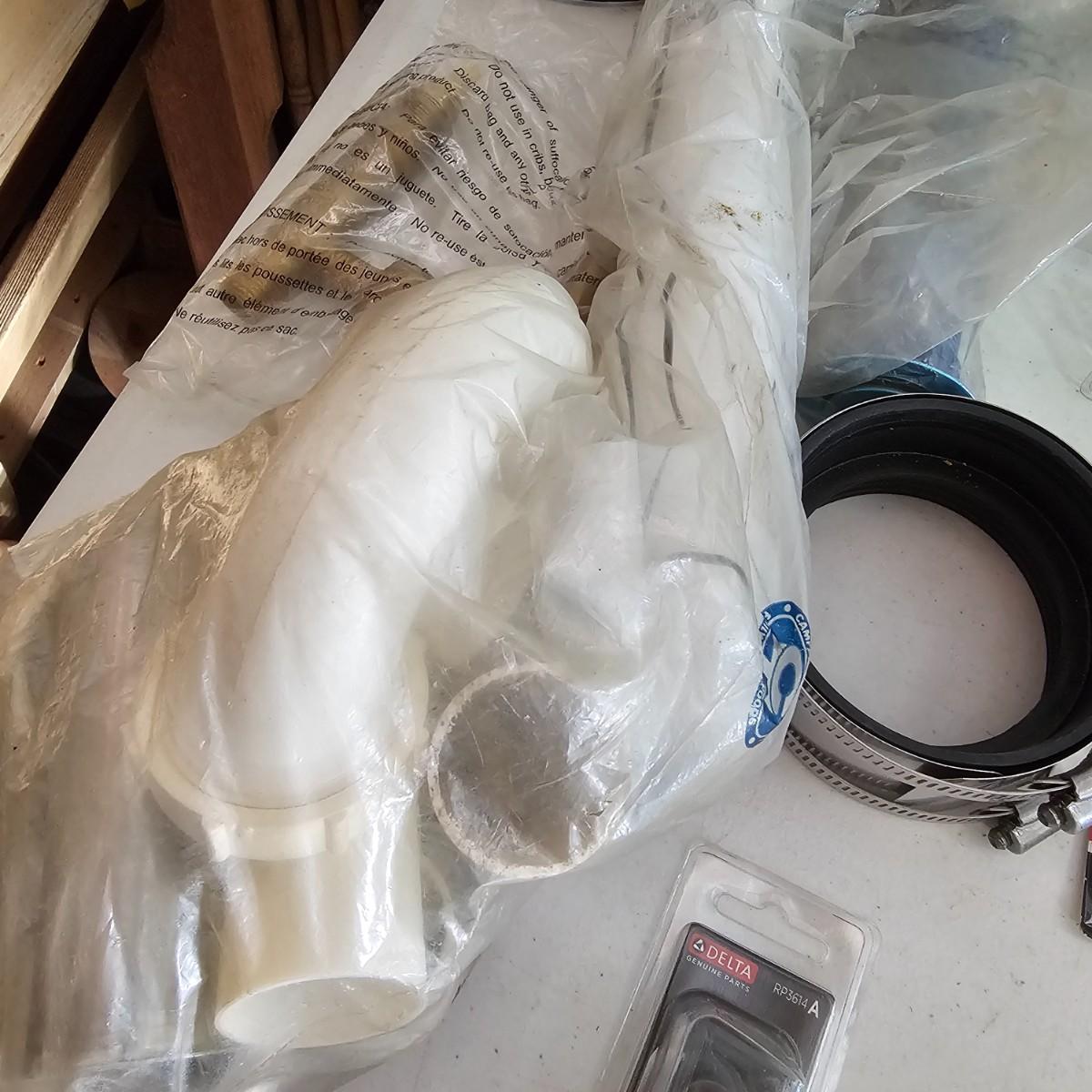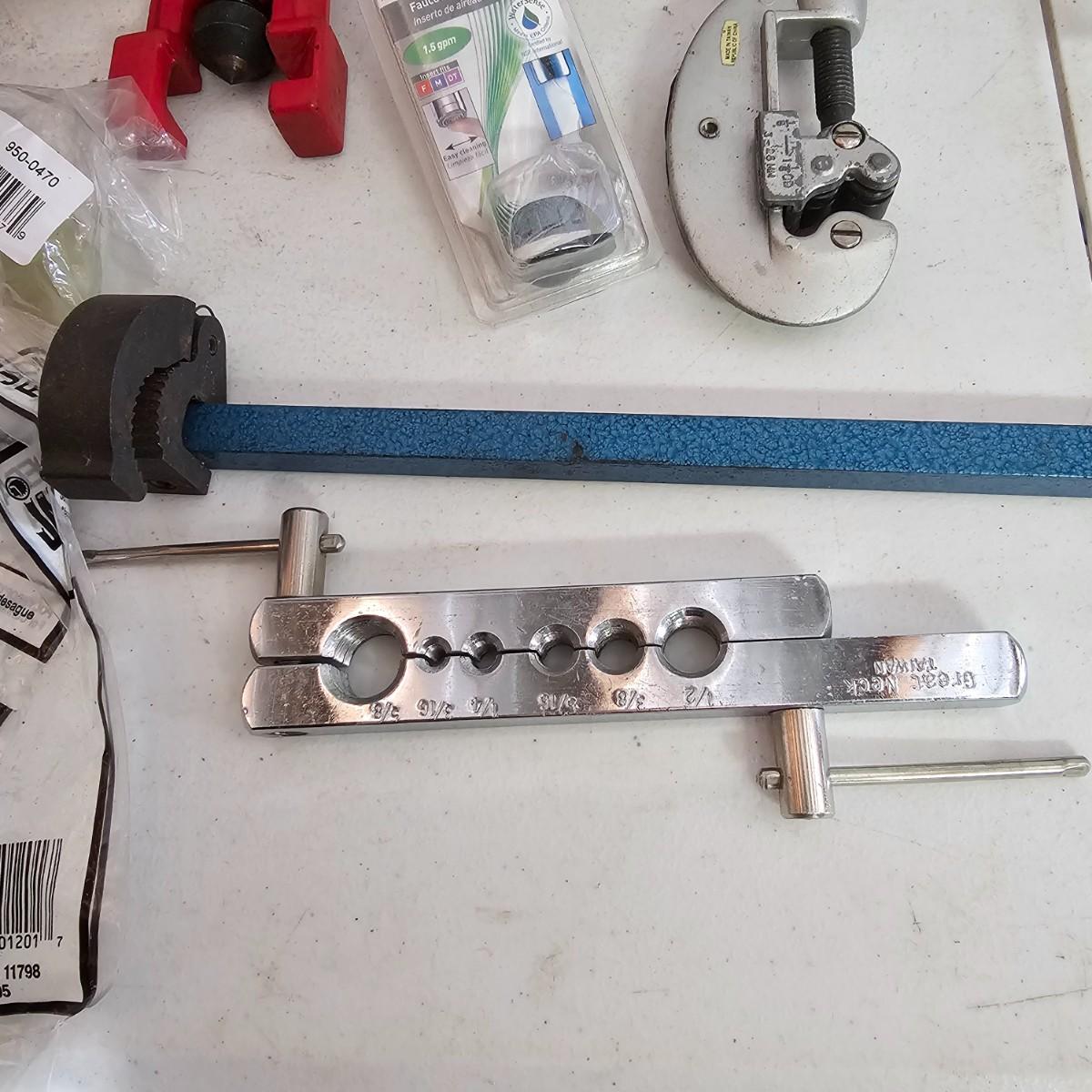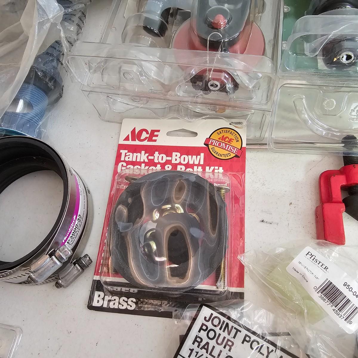 Valve repair kits, assorted pieces of PVC pipe in different sizes, tools and more. Teflon tape for wrapping joints, pipe cutters, flaring tools, basin wrench. Several new stainless supply line pieces. Washers, fittings, etc. See photos for details. Shipping available.