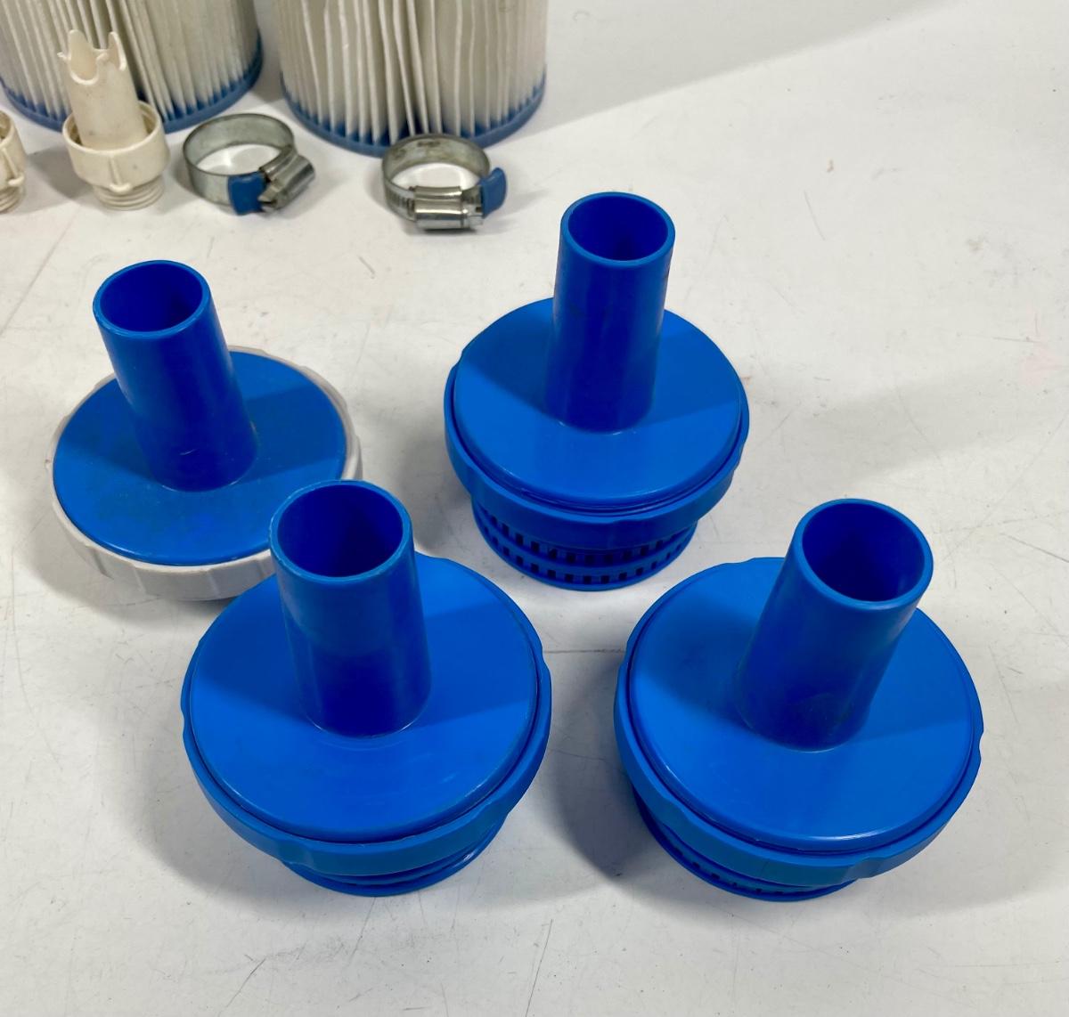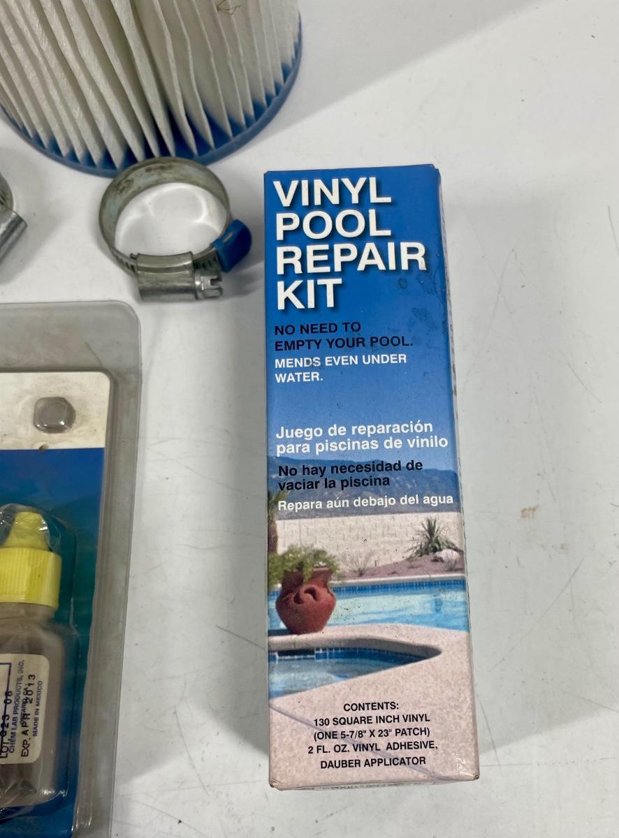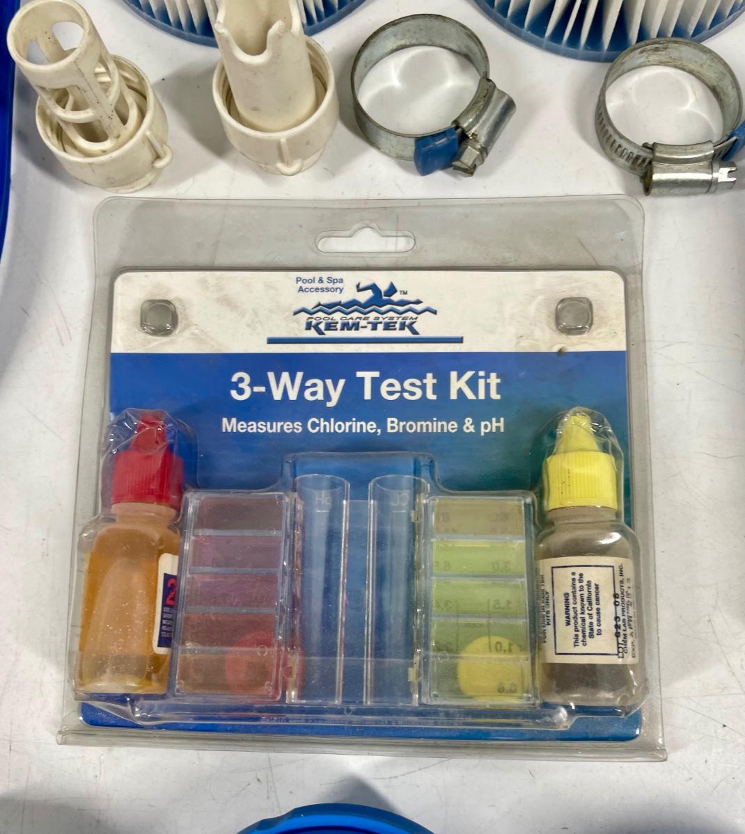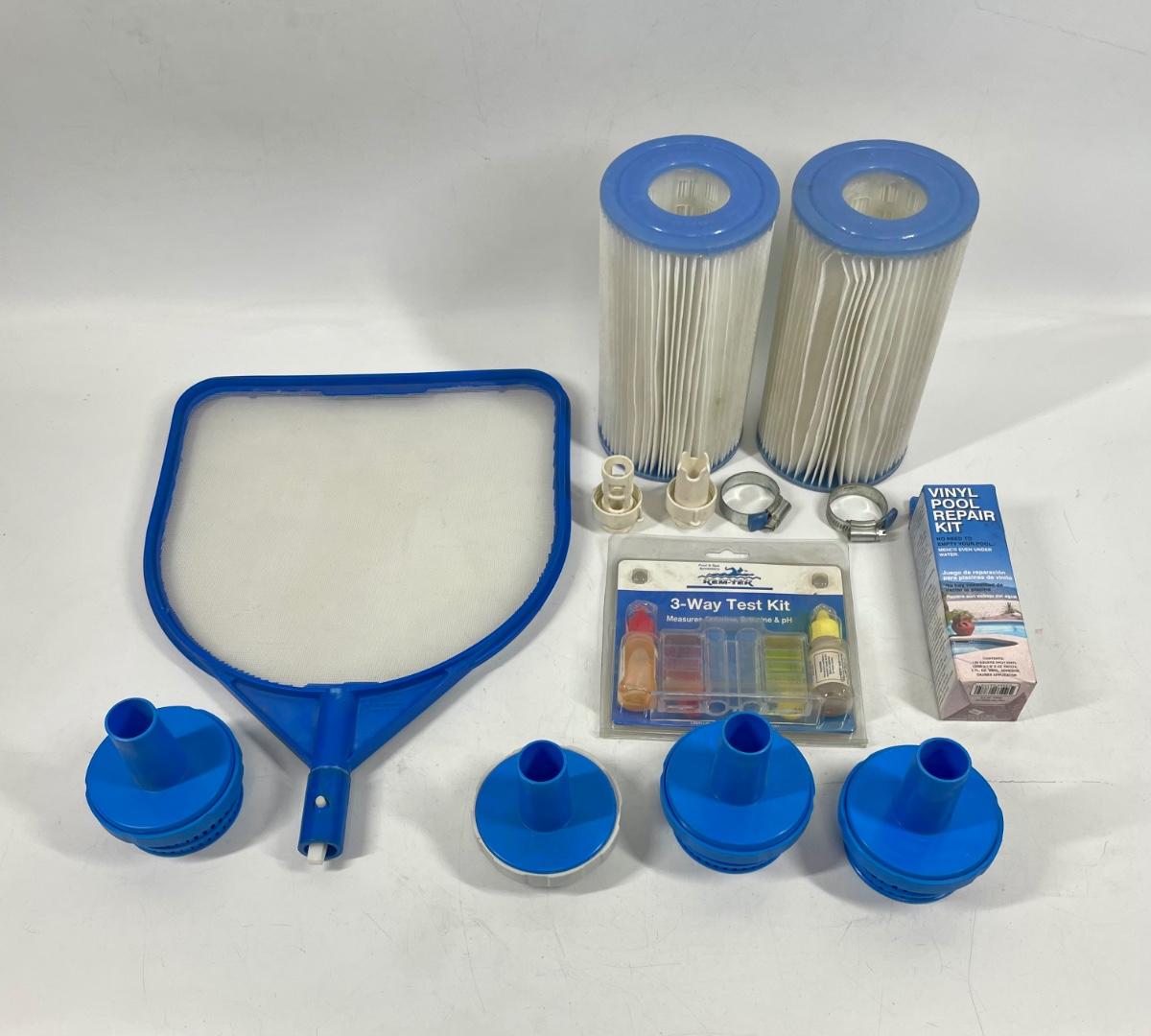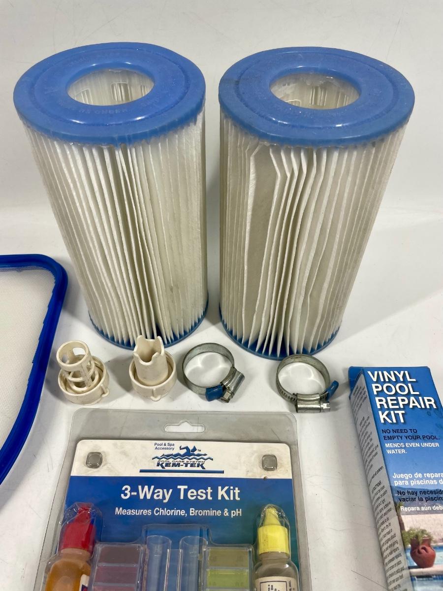 Small leaf net, filter cartridges, chemical test kit, vinyl patch kit, and more. See photos for what’s included.