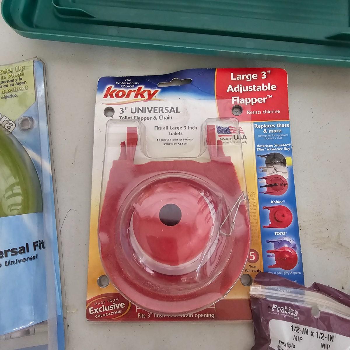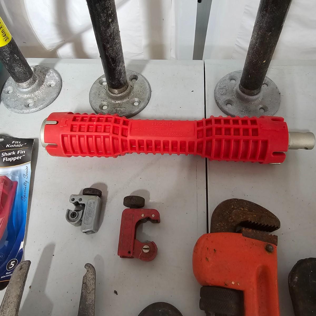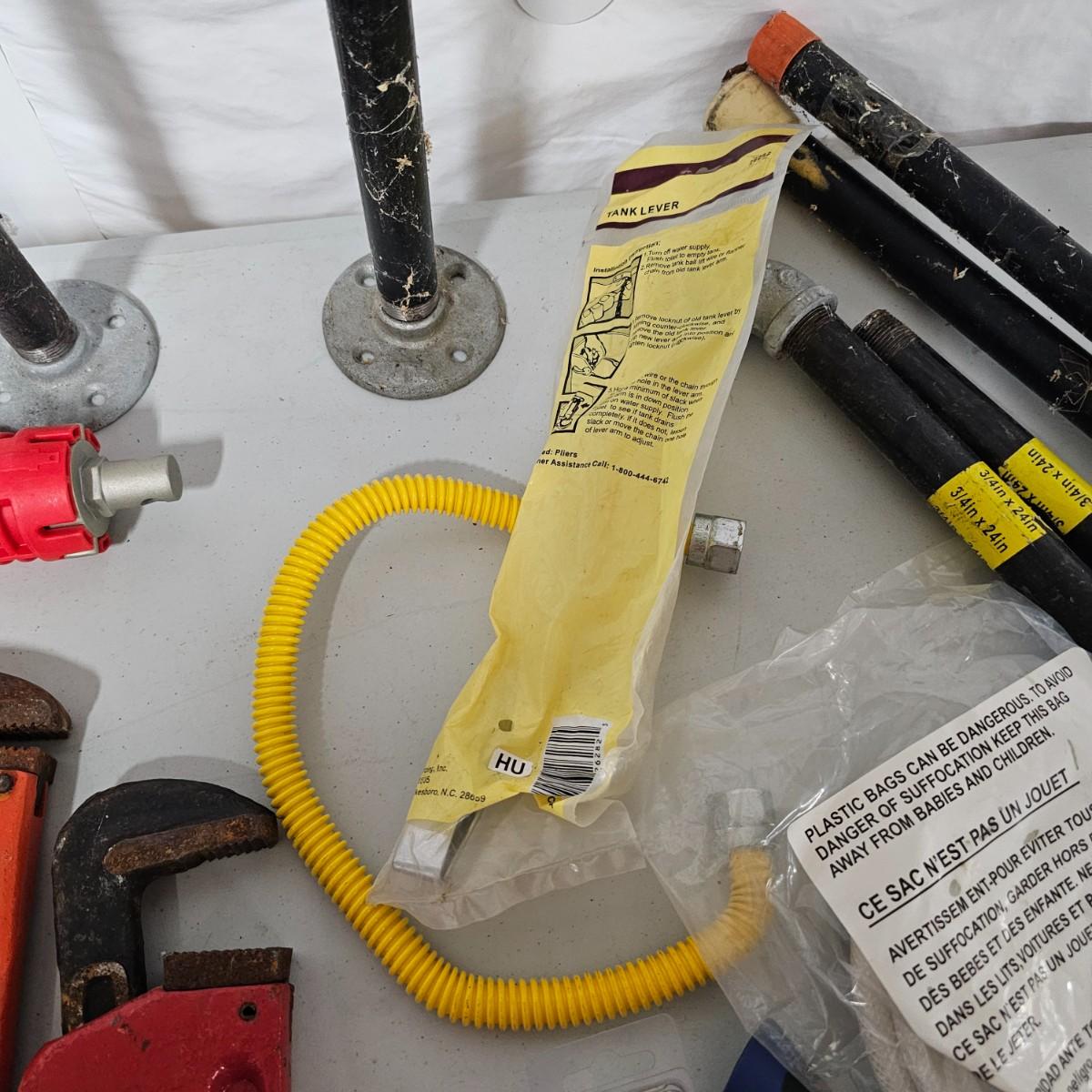 Wrenches, fittings, toilet parts and more. One snake/auger to attach to a drill. Tubing cutters, slip nut wrenches. One 14" and one 18" pipe wrench. Several pieces of 3/4" threaded black pipe for gas work or other, some with flanges to use as legs. A box of PVC pieces and fittings. See photos for details. Local pickup only.
