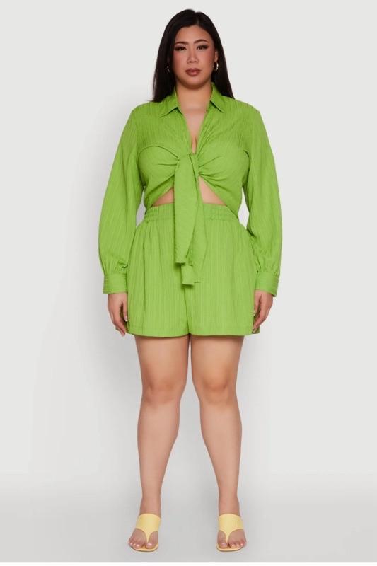 Plus Size Textured Knit Tie Front Crop Top - Green - 3X