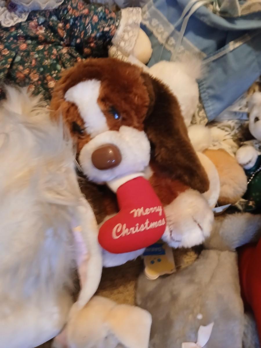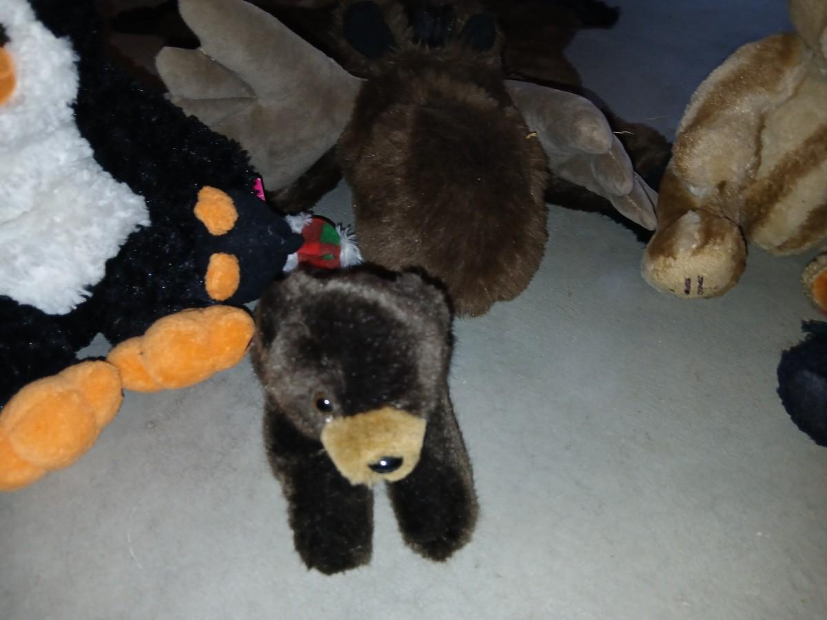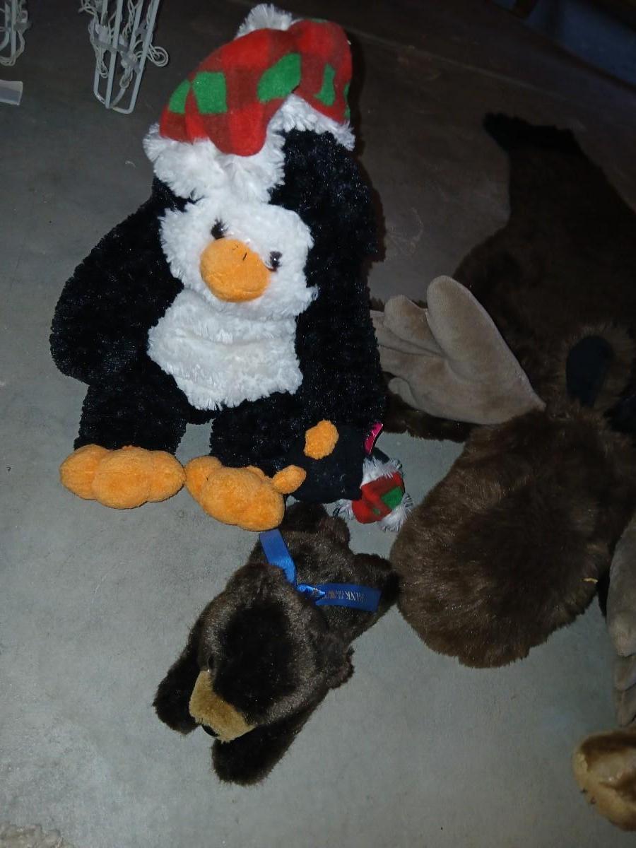 Charming assortment of plush animals including a whimsical faux moose rug, a holiday penguin, jointed teddy bear, red and green dressed mini bear, small brown bear, and a unique moose head design rug that doubles as playful décor. Great for a cabin, nursery, or whimsical holiday display. Comes with a bunch of other vintage plush friends!
