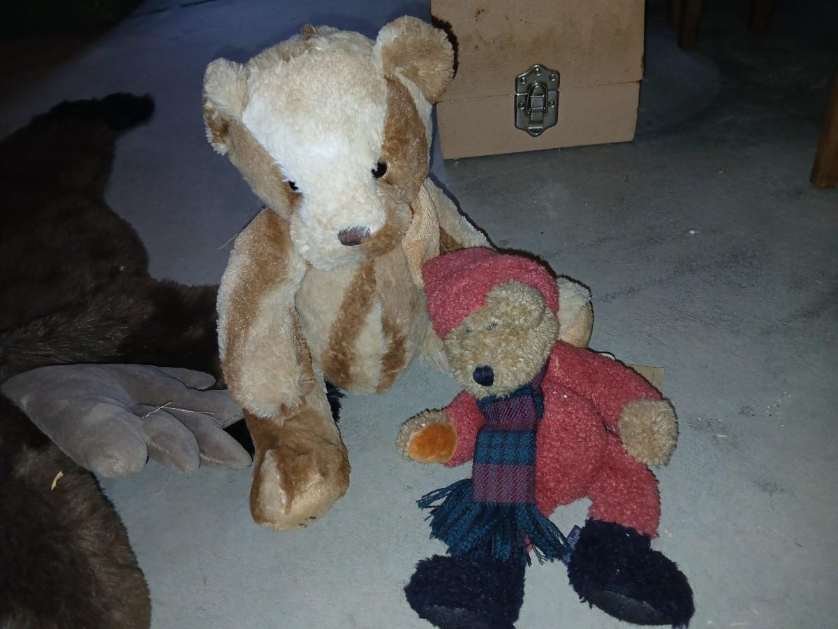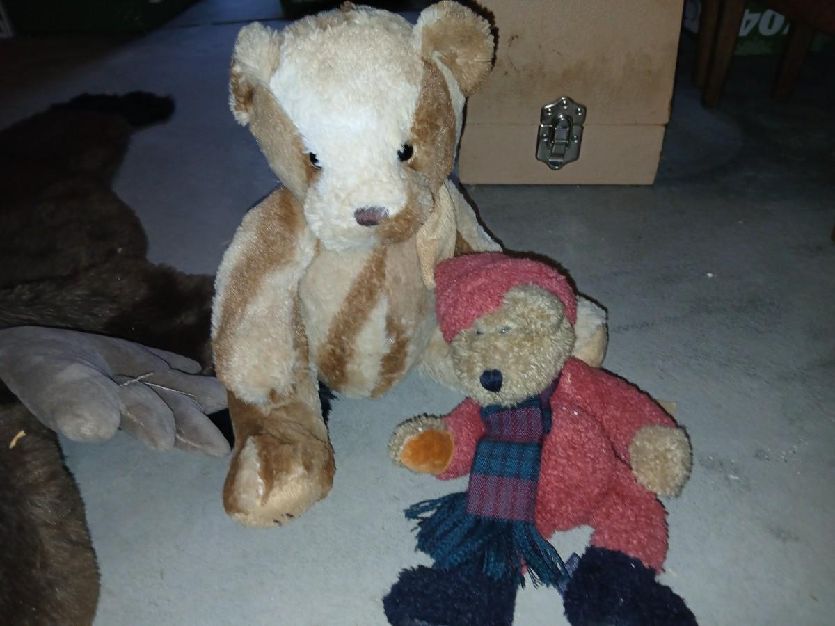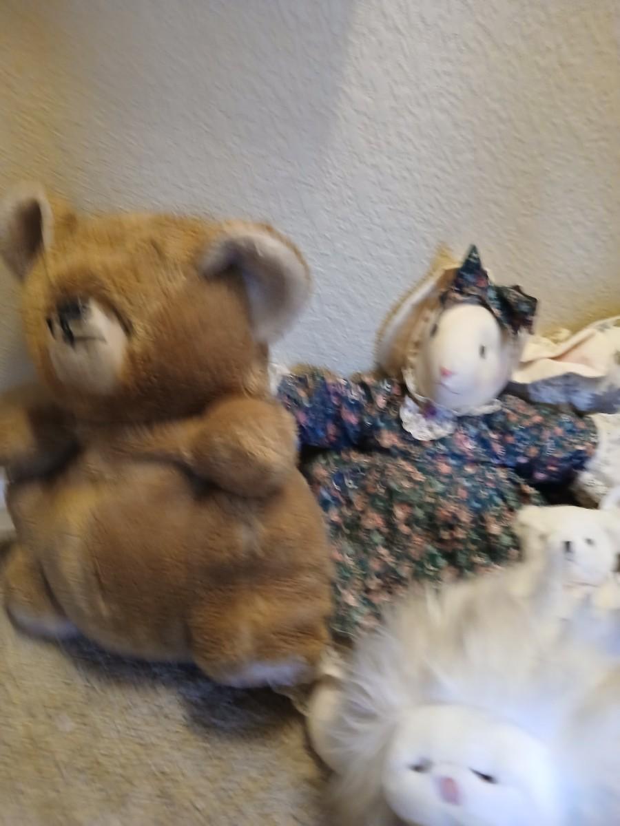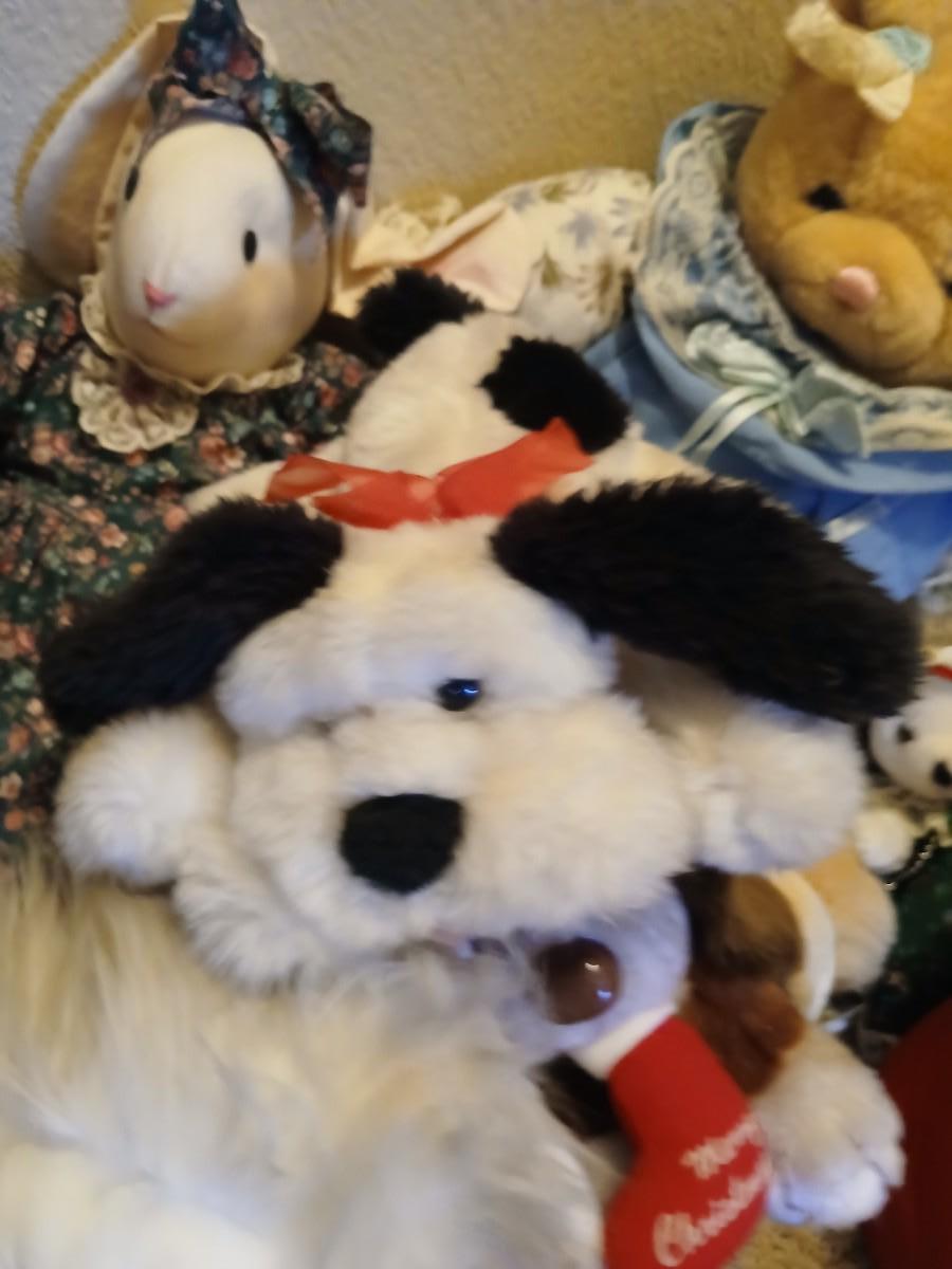 Charming assortment of plush animals including a whimsical faux moose rug, a holiday penguin, jointed teddy bear, red and green dressed mini bear, small brown bear, and a unique moose head design rug that doubles as playful décor. Great for a cabin, nursery, or whimsical holiday display. Comes with a bunch of other vintage plush friends!