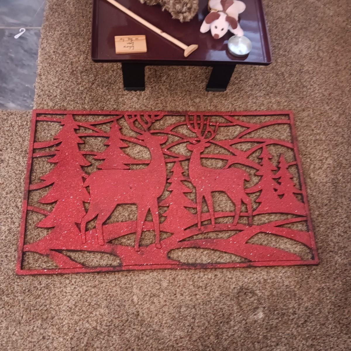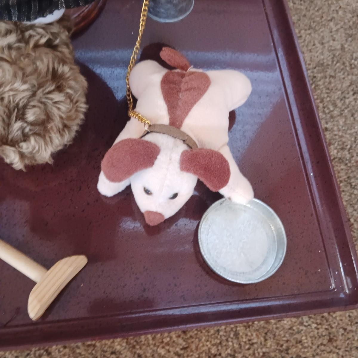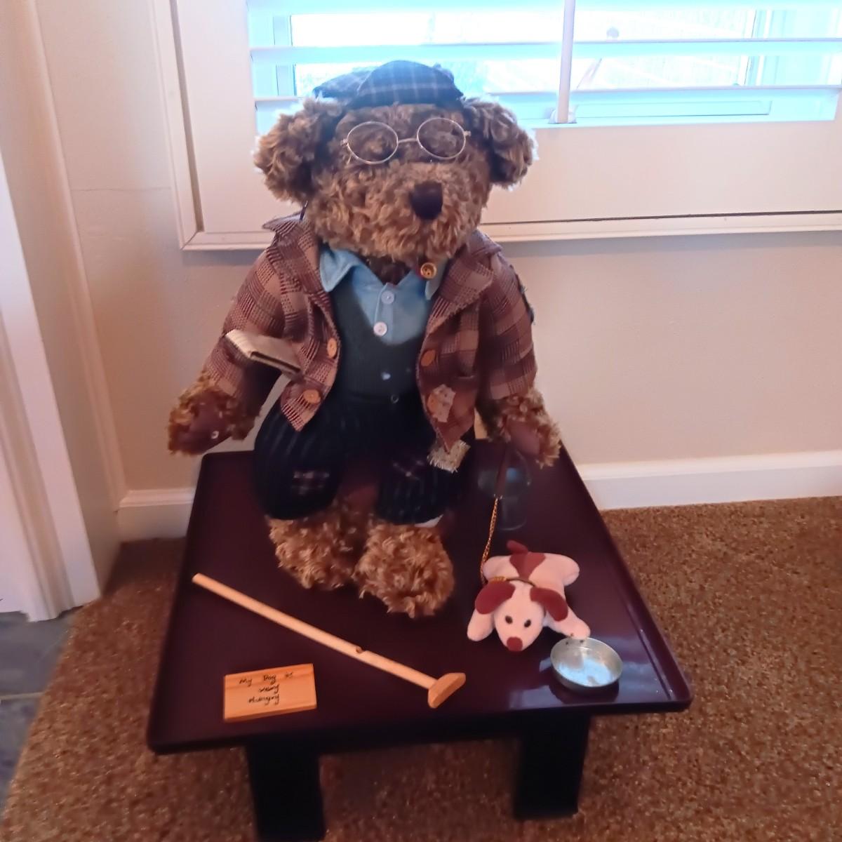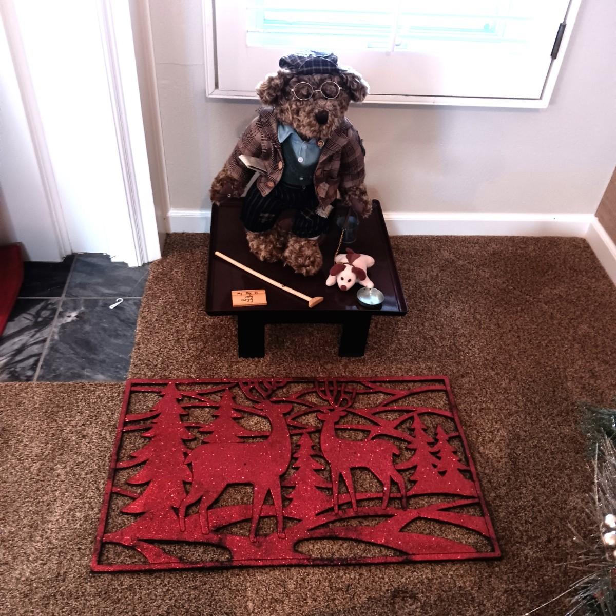 PLUSH BEAR WITH HIS HUNGRY DOG ON A MIKASA 4 LEGGED TRAY & A THICK RUBBER DOOR MAT