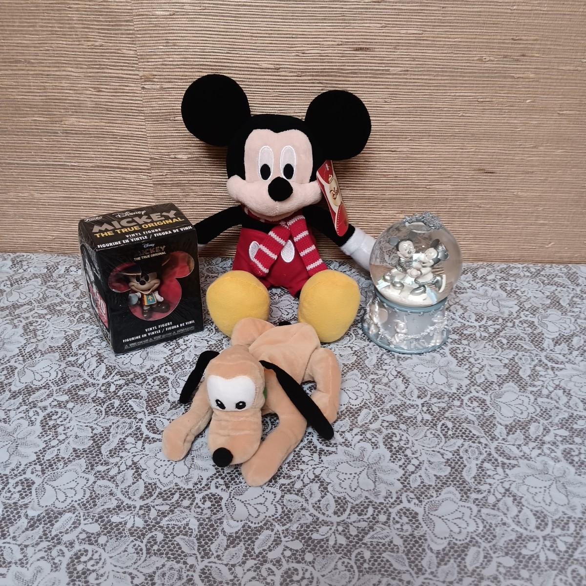 PLUSH DISNEY MICKEY MOUSE AND PLUTO, SNOWGLOBE AND VINYL FIGURE