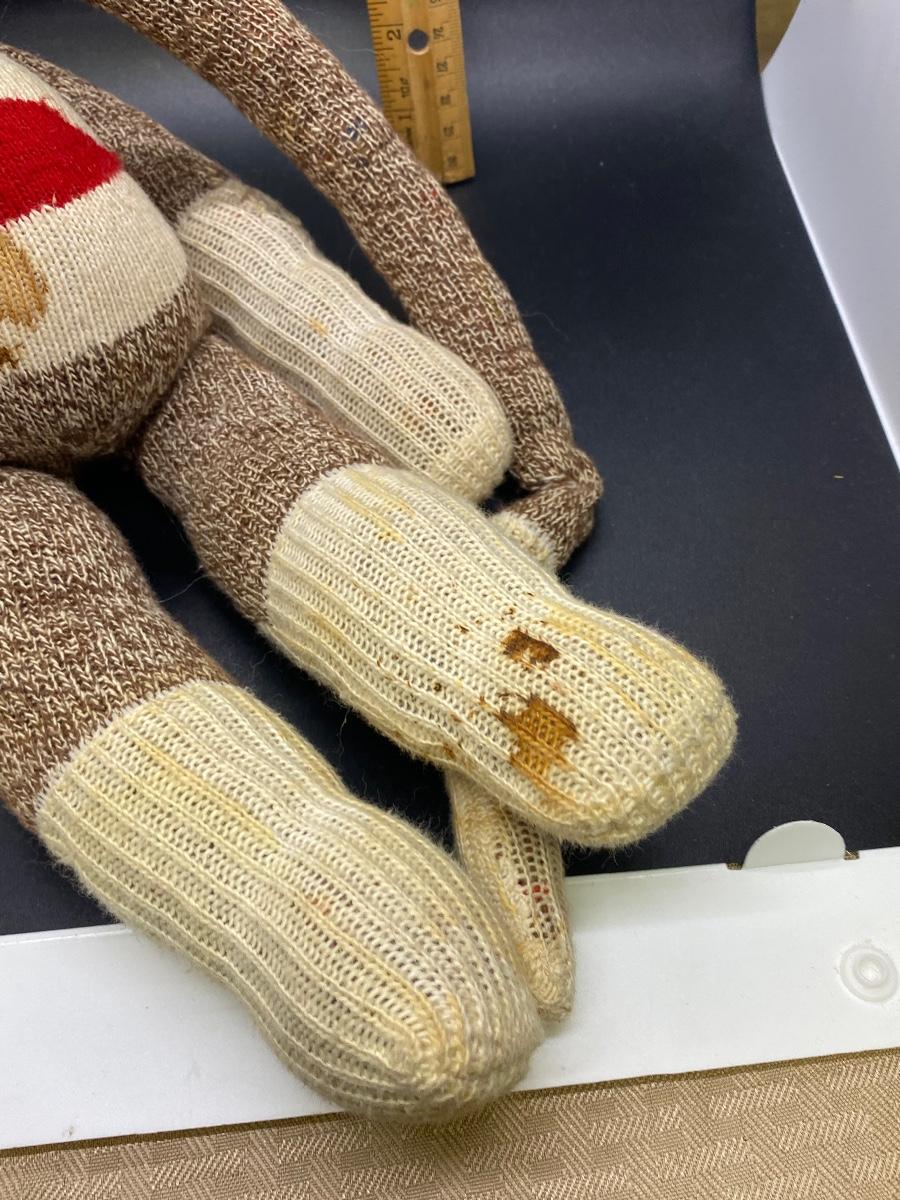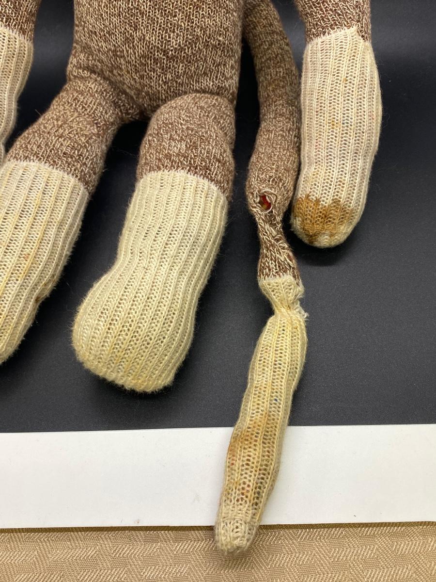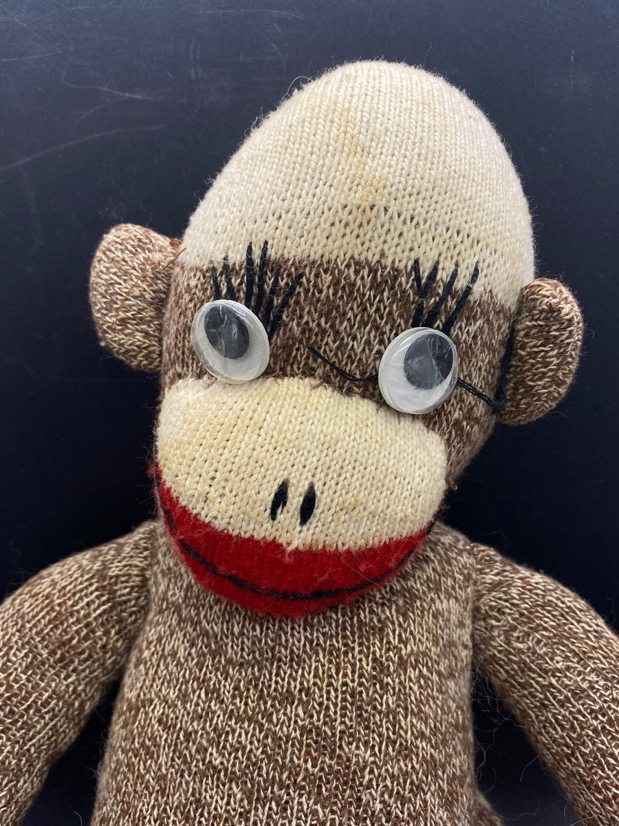 Plush sock monkey in need of some TLC. Has some spots and stains, tail needs repair. Good size over 15". No tags.