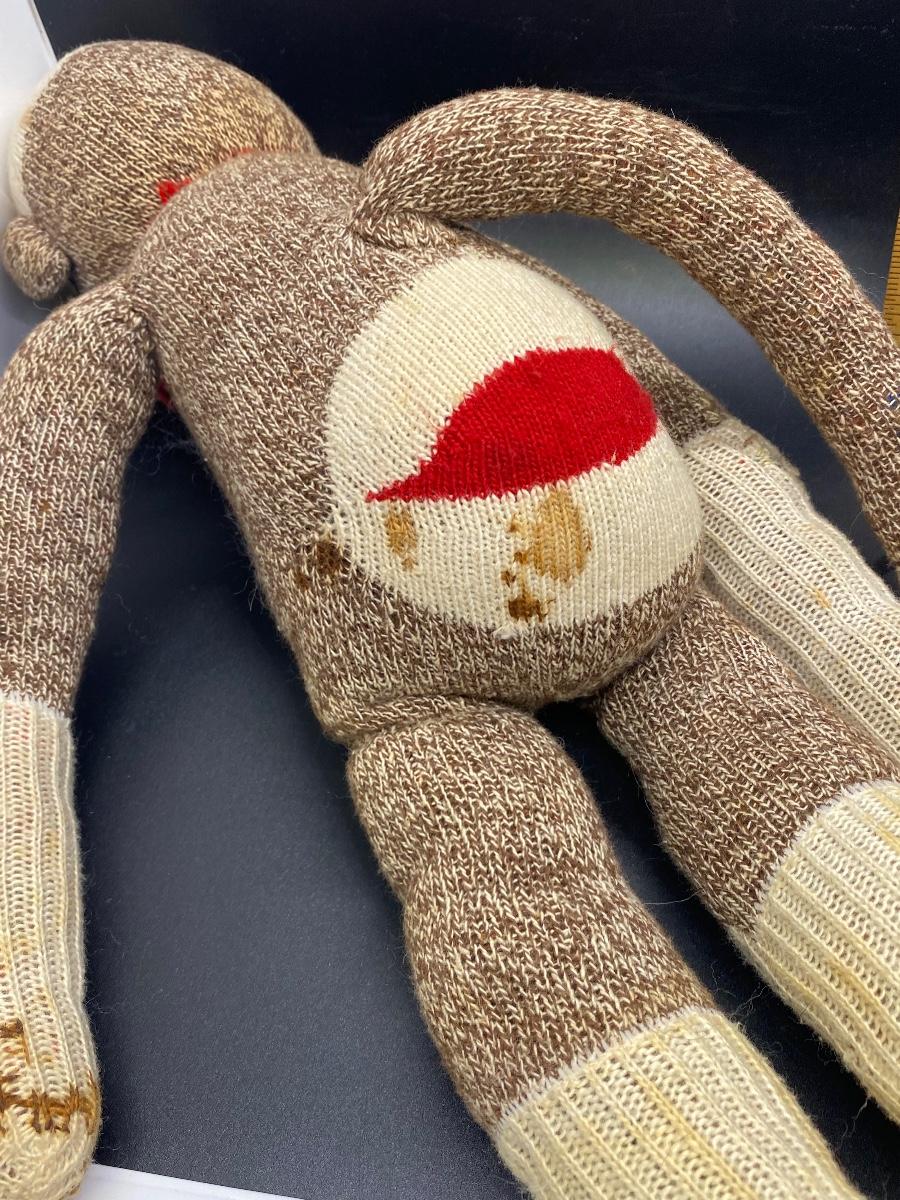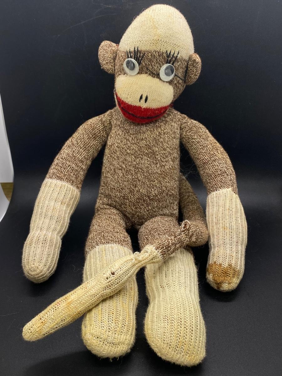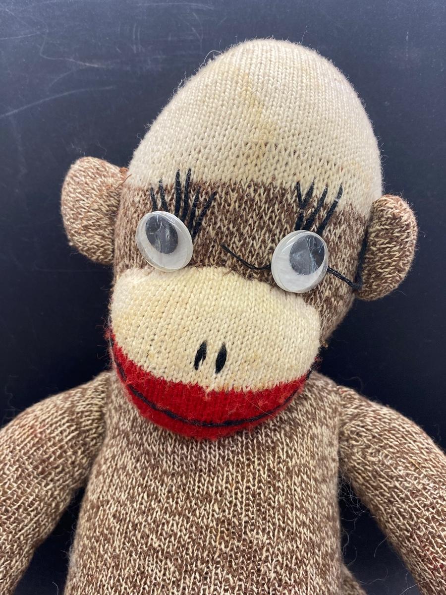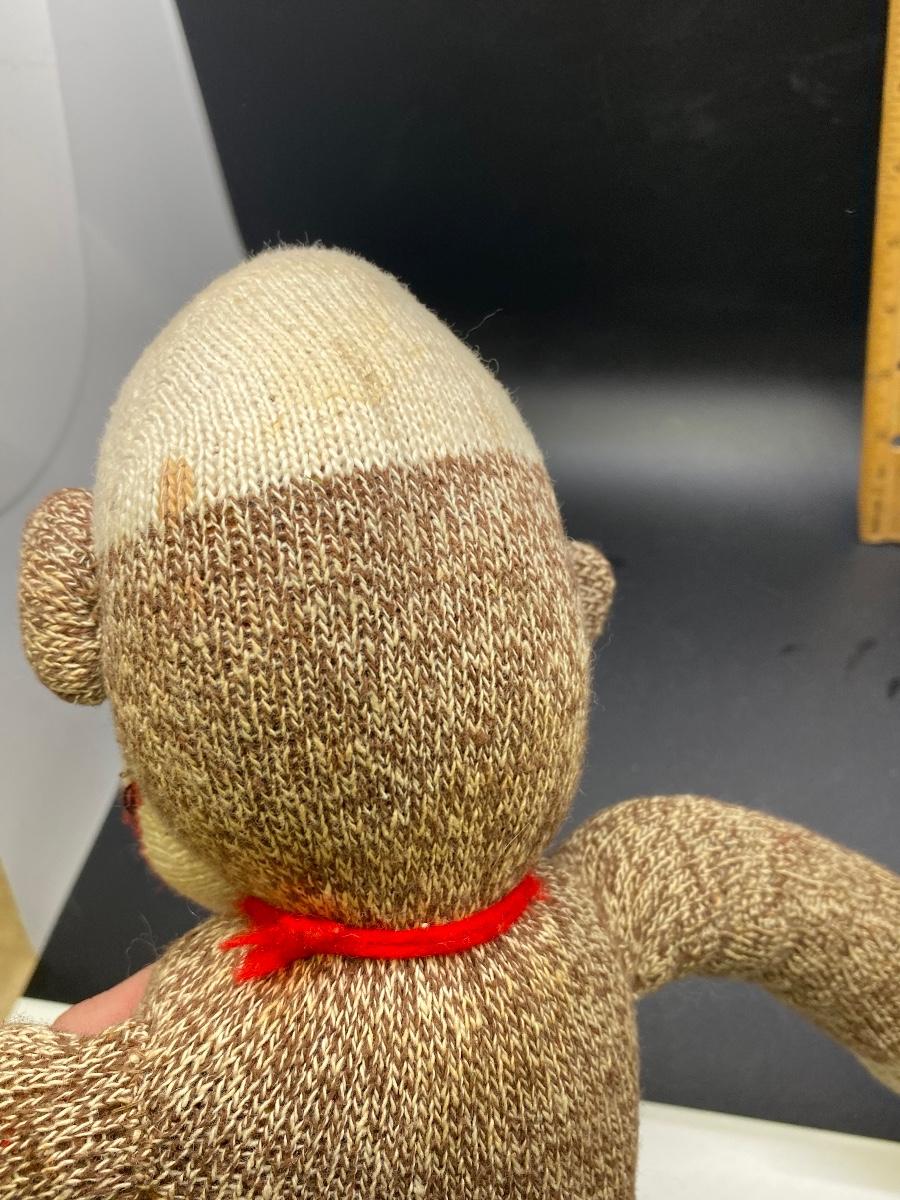 Plush sock monkey in need of some TLC. Has some spots and stains, tail needs repair. Good size over 15". No tags.