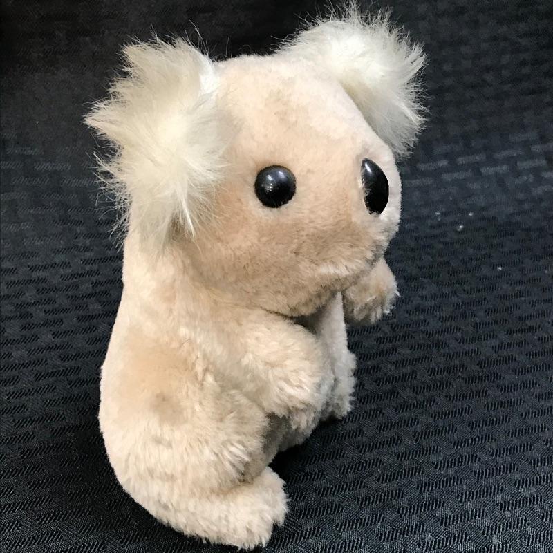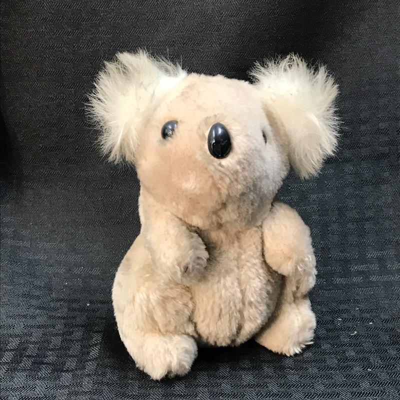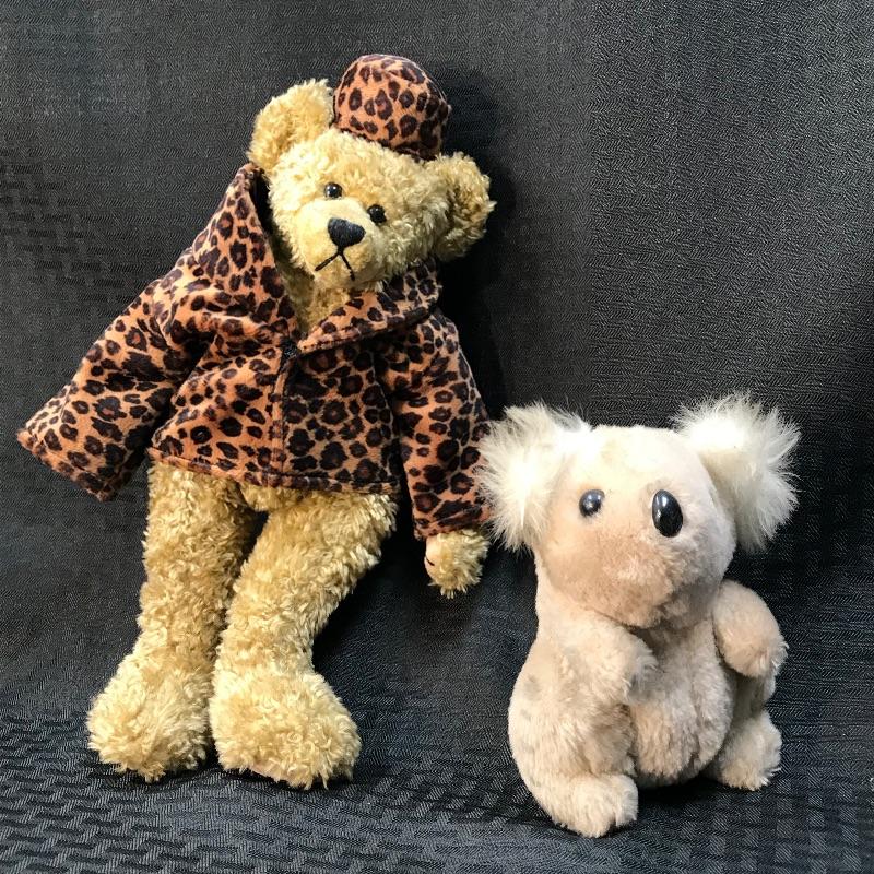 Both plushes are unmarked, and without tags. The teddy bear is wearing a cheetah print coat and hat, and the other is a fuzzy koala. The koala is slightly dirty from storage; see pictures.