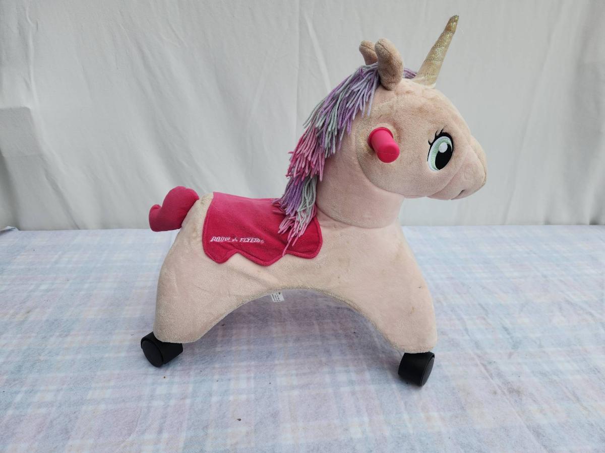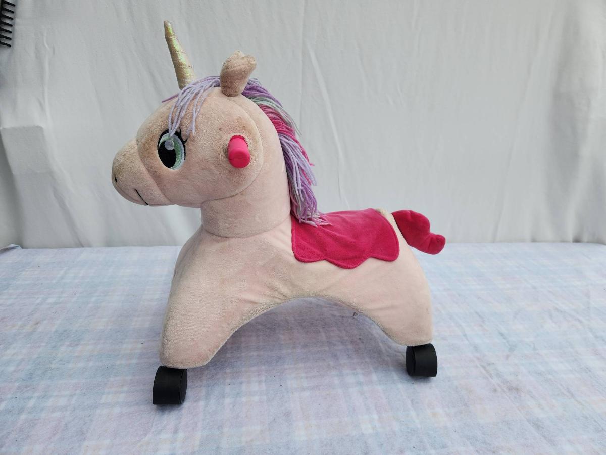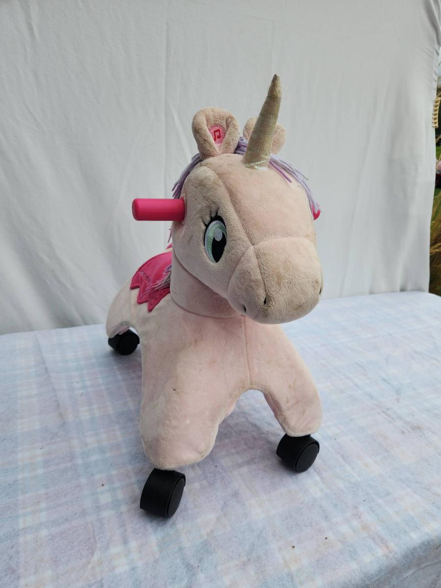 Plush unicorn rocker featuring a beige body with a pink saddle detail and purple hair. Includes a golden horn, pink ears, and green eyes for a playful design. Equipped with four sturdy wheels and two pink handles, it provides both rocking and mobility functions. Condition shows minor wear, suitable for children's use.