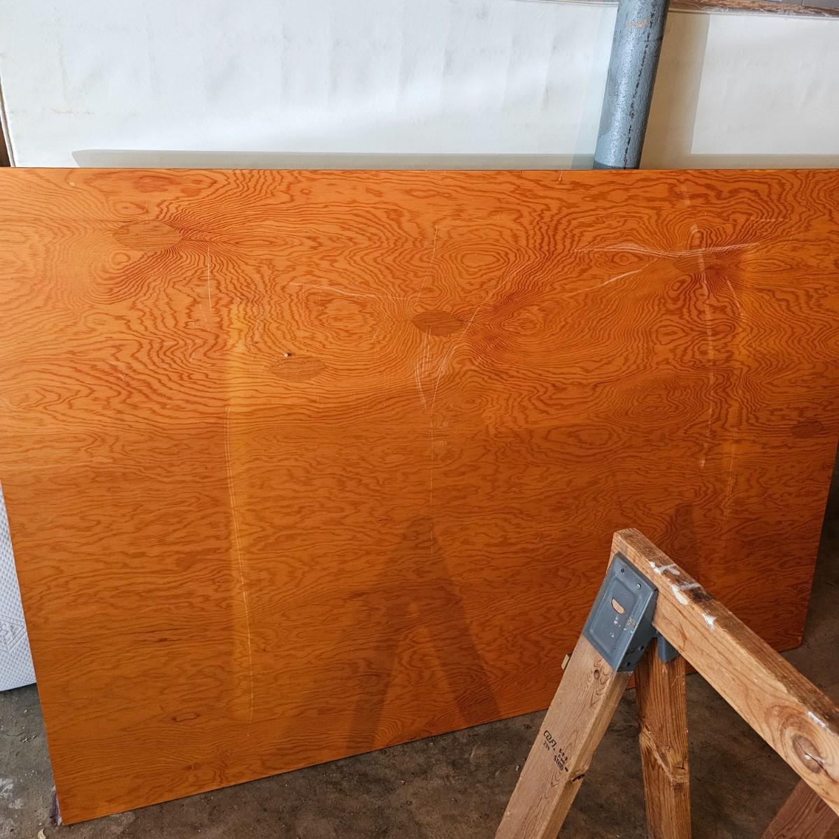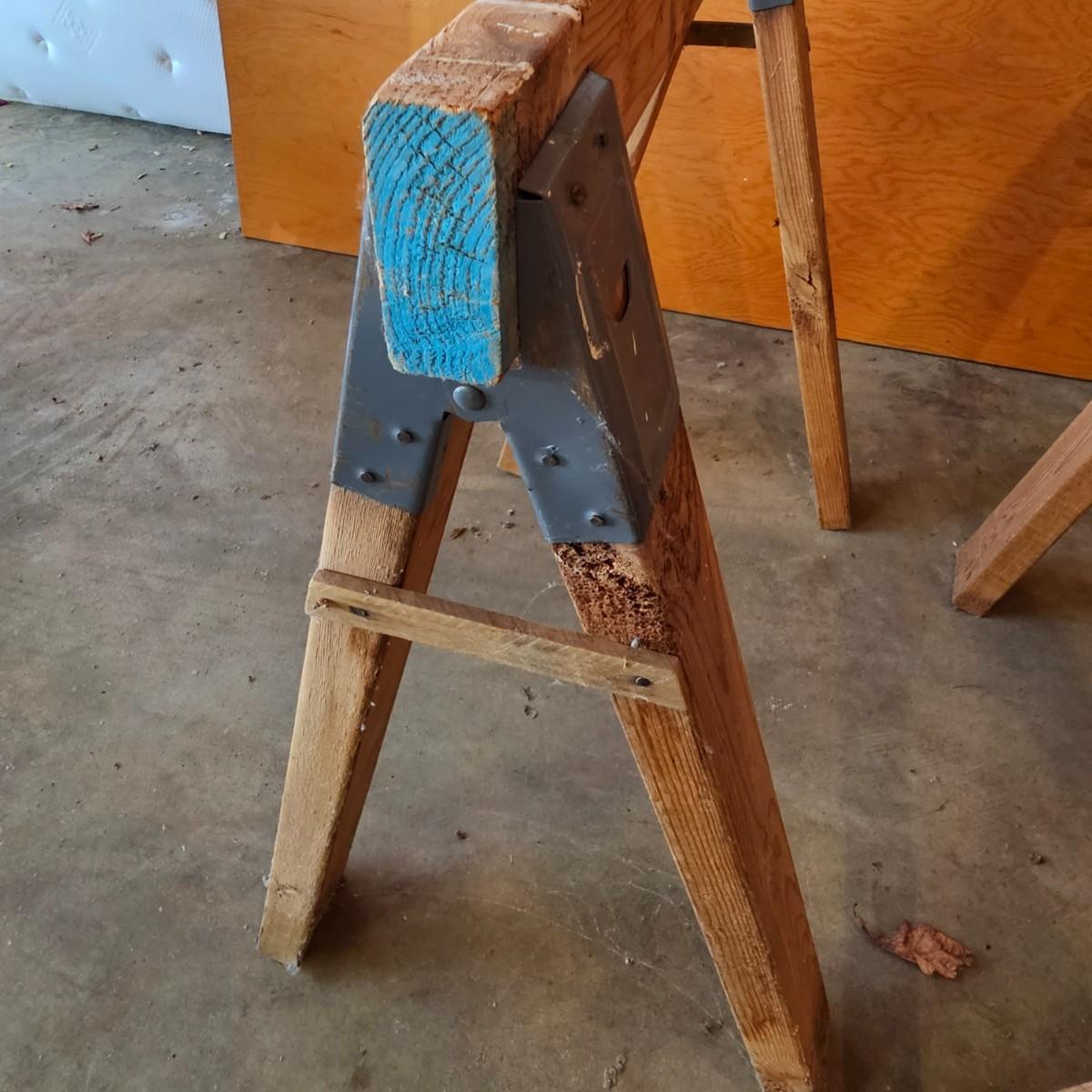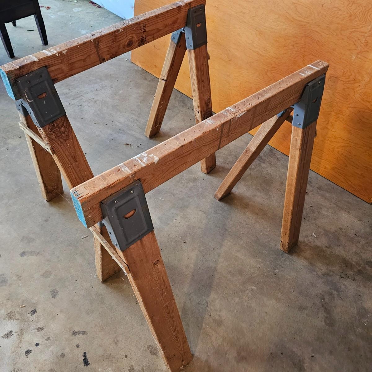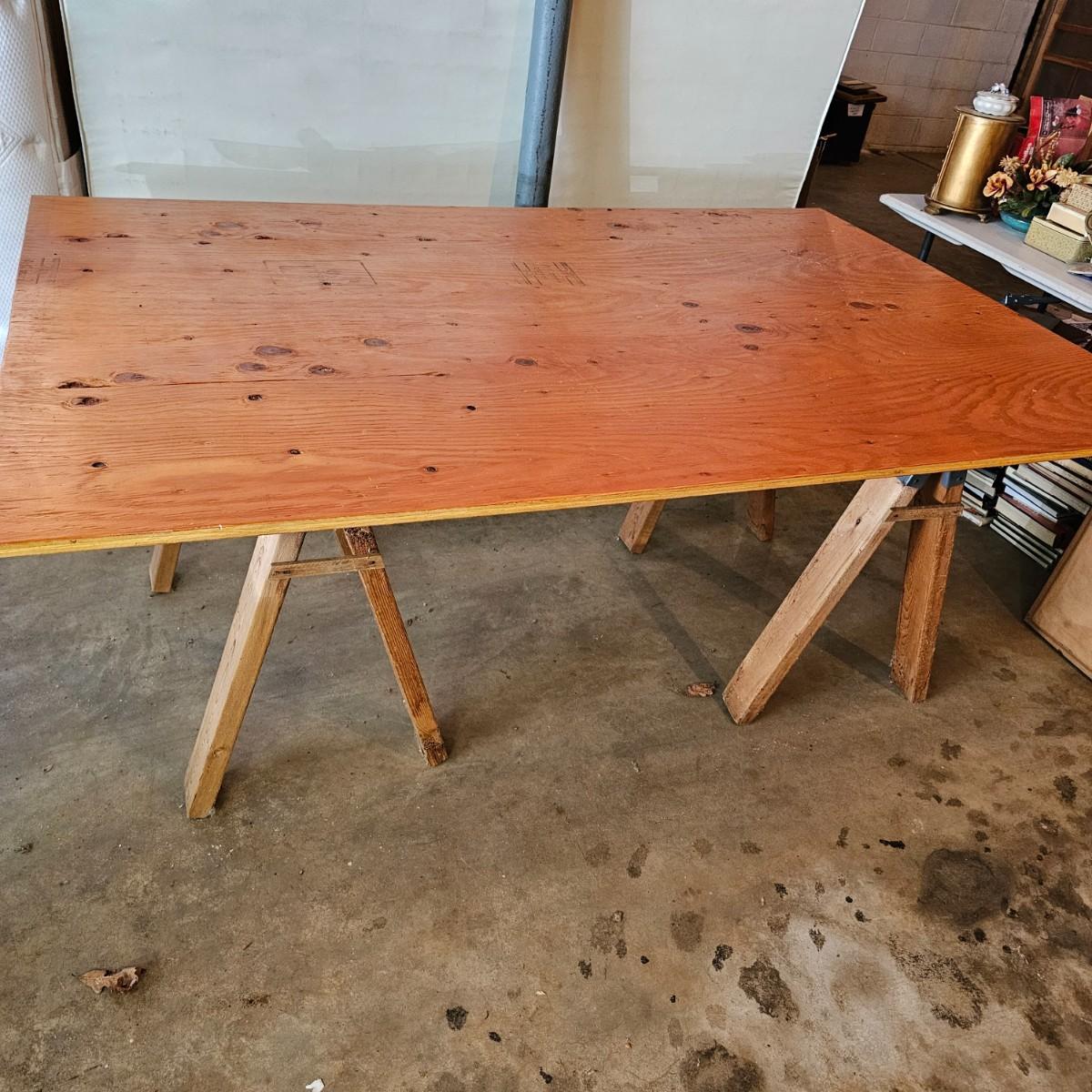 4' x 6' sheet of 3/4" plywood, finished both sides. Also two sawhorses, 2" x 4" construction with metal brackets, each 18" x 33" x 30"H. See photos for details. Local pickup only.