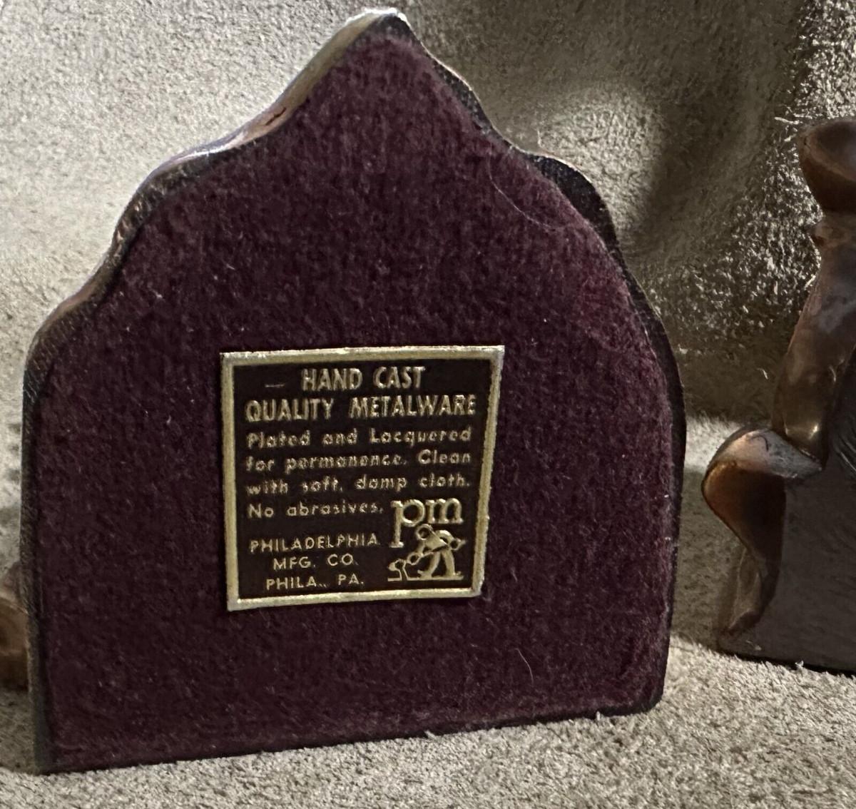 a pair of hand cast quality metalware bookends from the Philadelphia Manufacturing Company...in a classical leaf pattern plated and lacquered bronze finish...They stand 5.75" high by 4" wide..3.5" deep...Stock number 92B...Nicely weighted..These vintage PM Craftsman bookends were cast prior to the company moving to Florida in 1970..Felt bottomed..as shown.