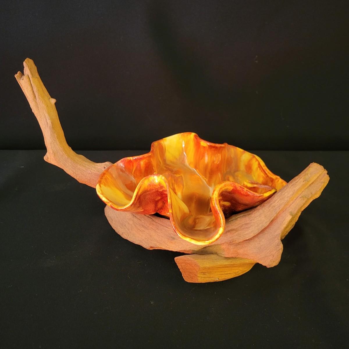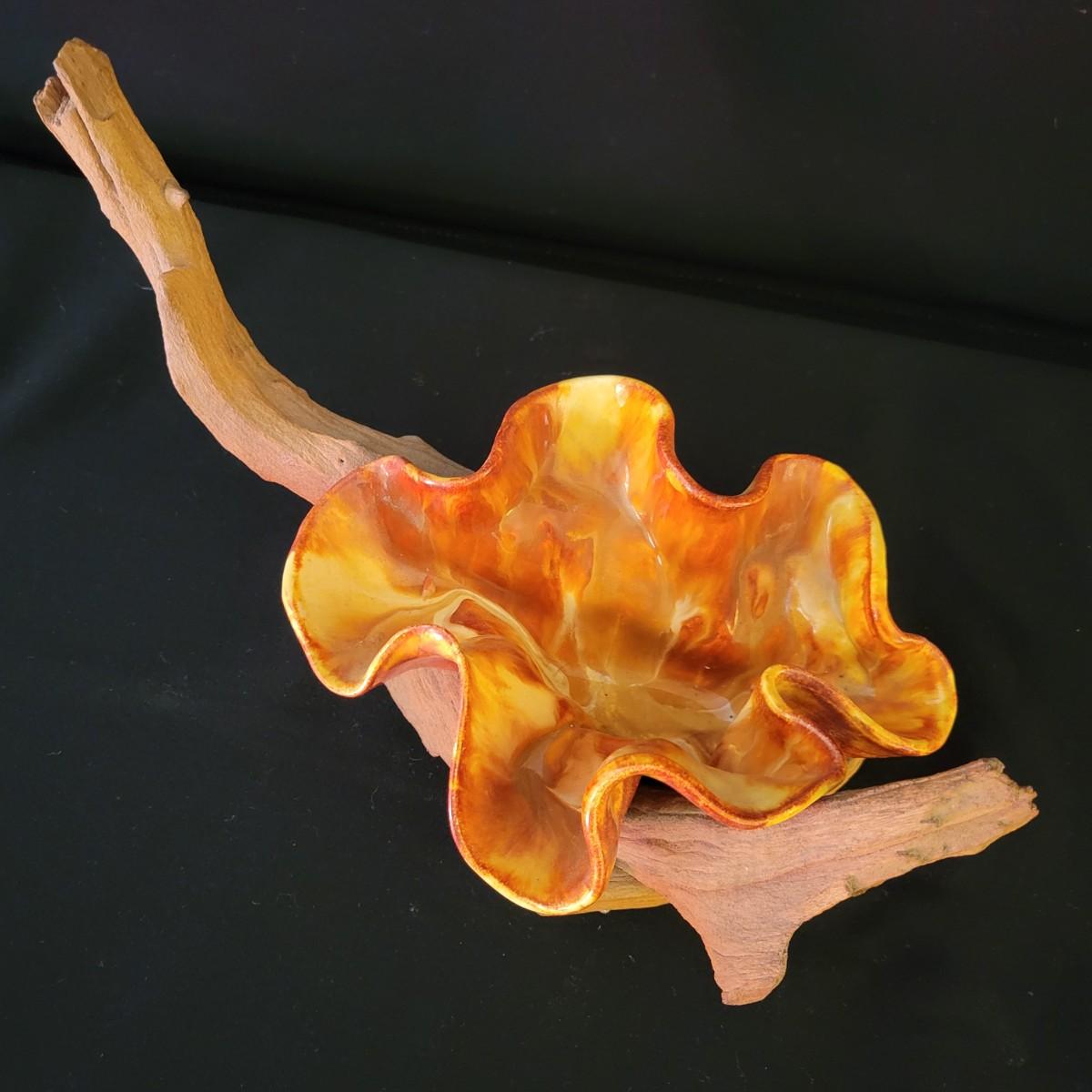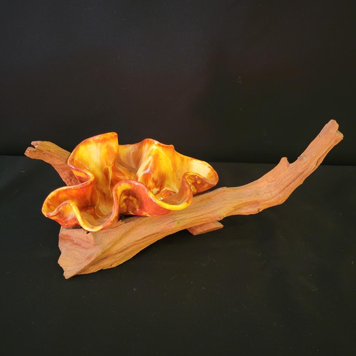 A piece of handmade pottery from the Florida Keys made by PM Longo. It has a free form folded design with rich glazing in yellow and orange. It rests securely on a driftwood base and measures approximately 12" x 6.5" x 6.5"H. Shipping available