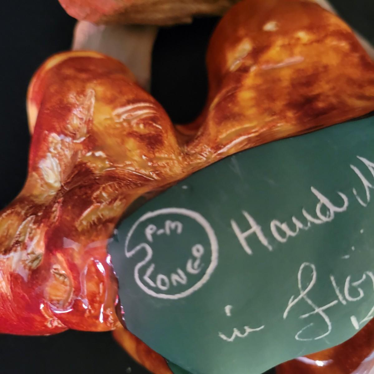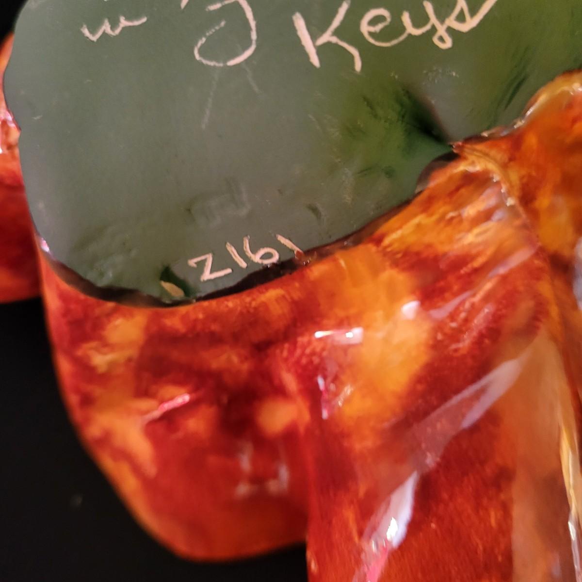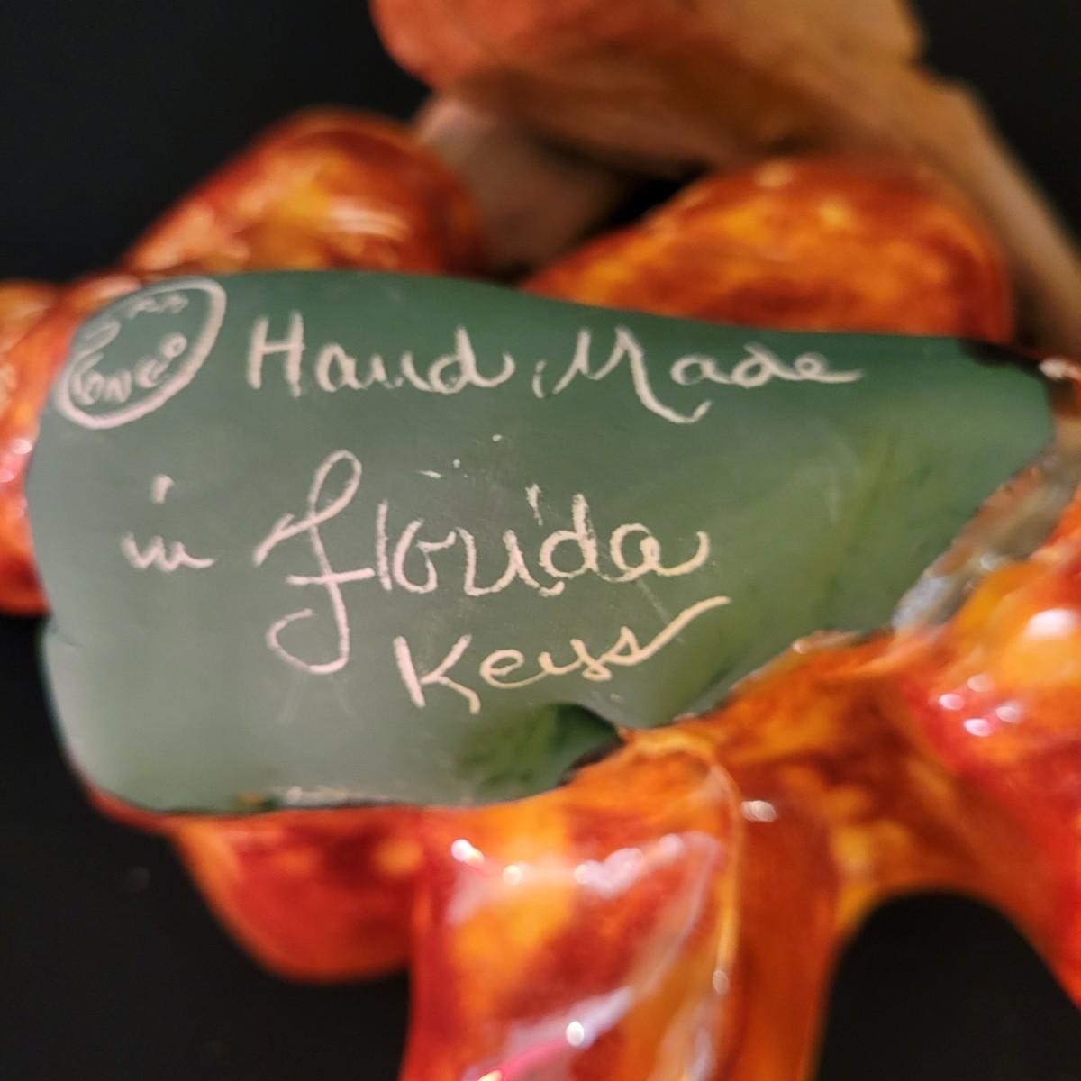 A piece of handmade pottery from the Florida Keys made by PM Longo. It has a free form folded design with rich glazing in yellow and orange. It rests securely on a driftwood base and measures approximately 12" x 6.5" x 6.5"H. Shipping available