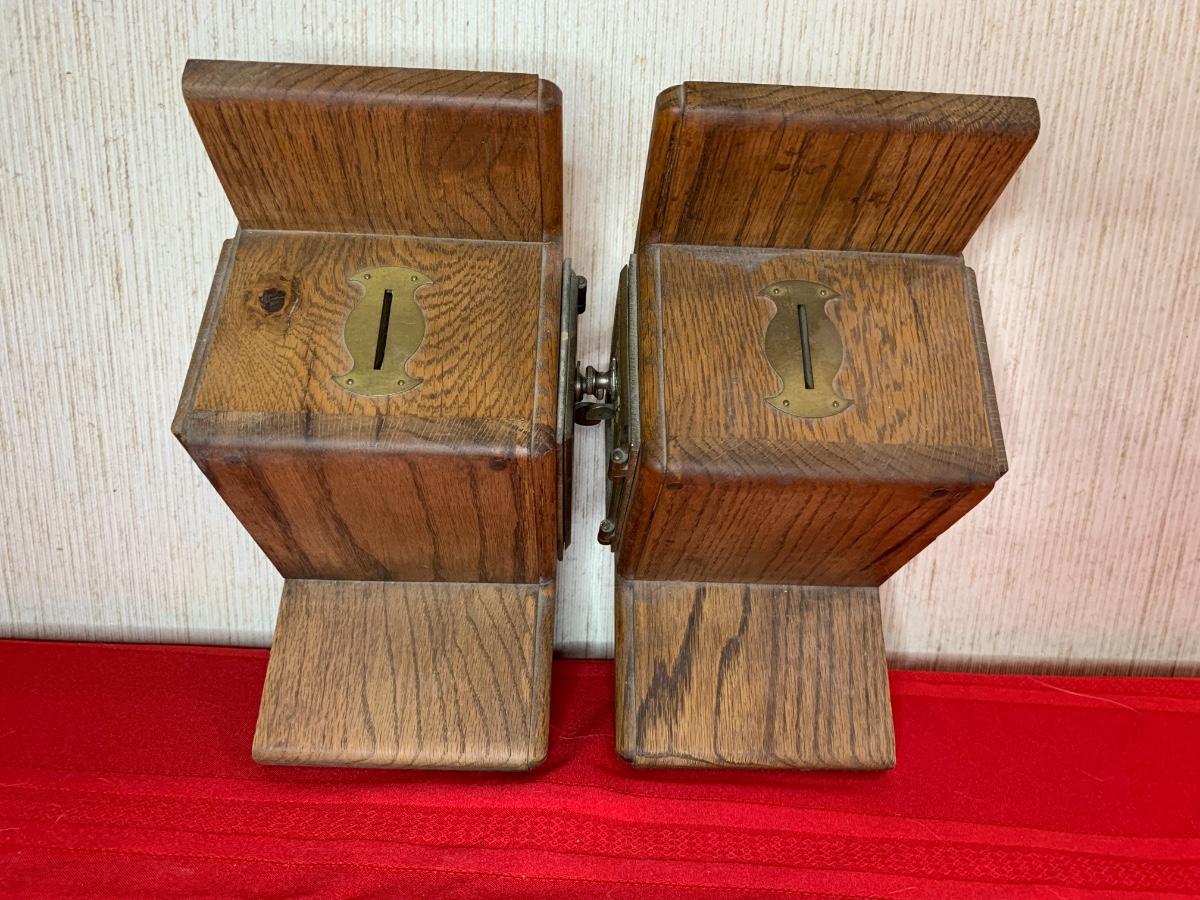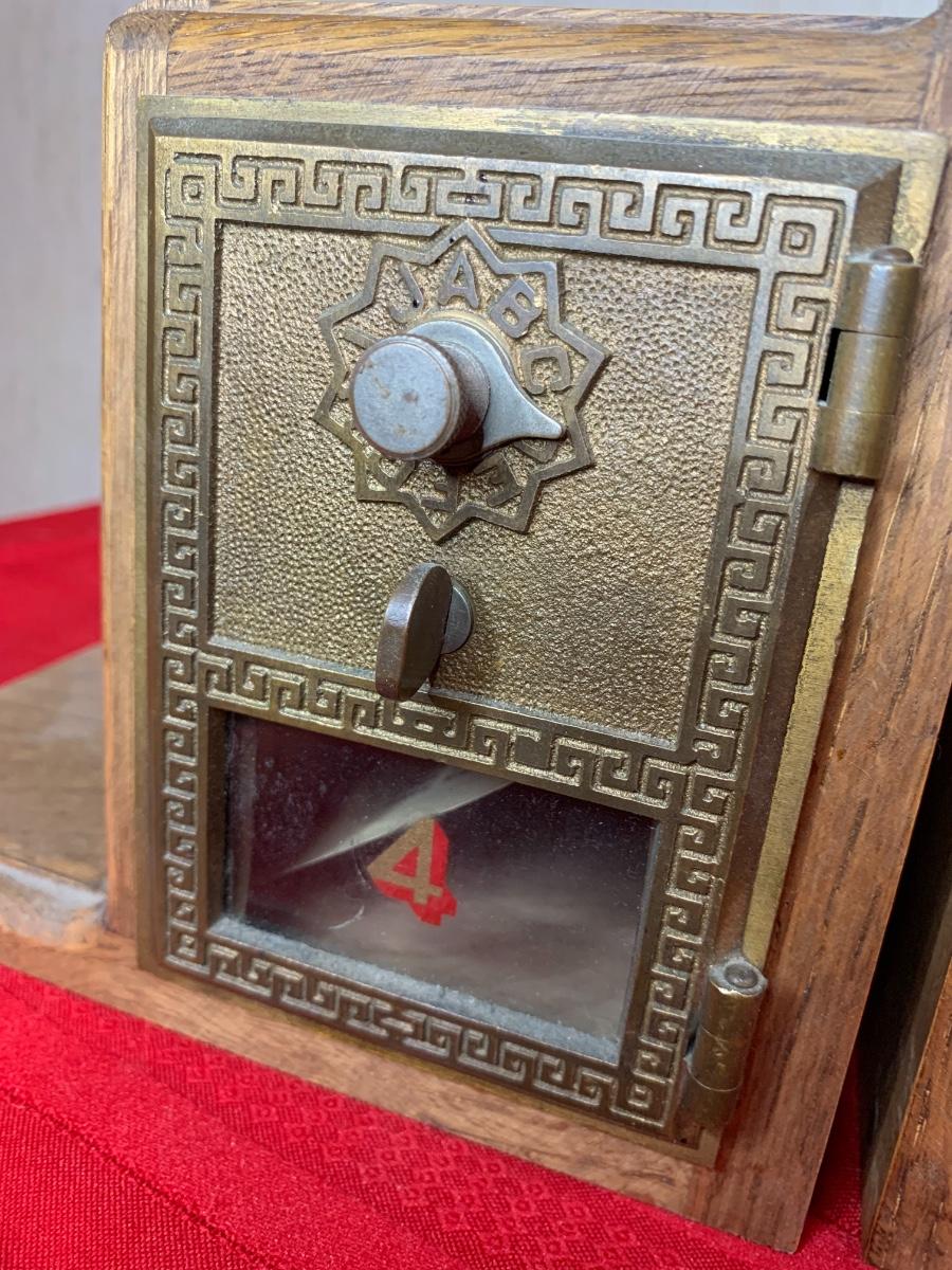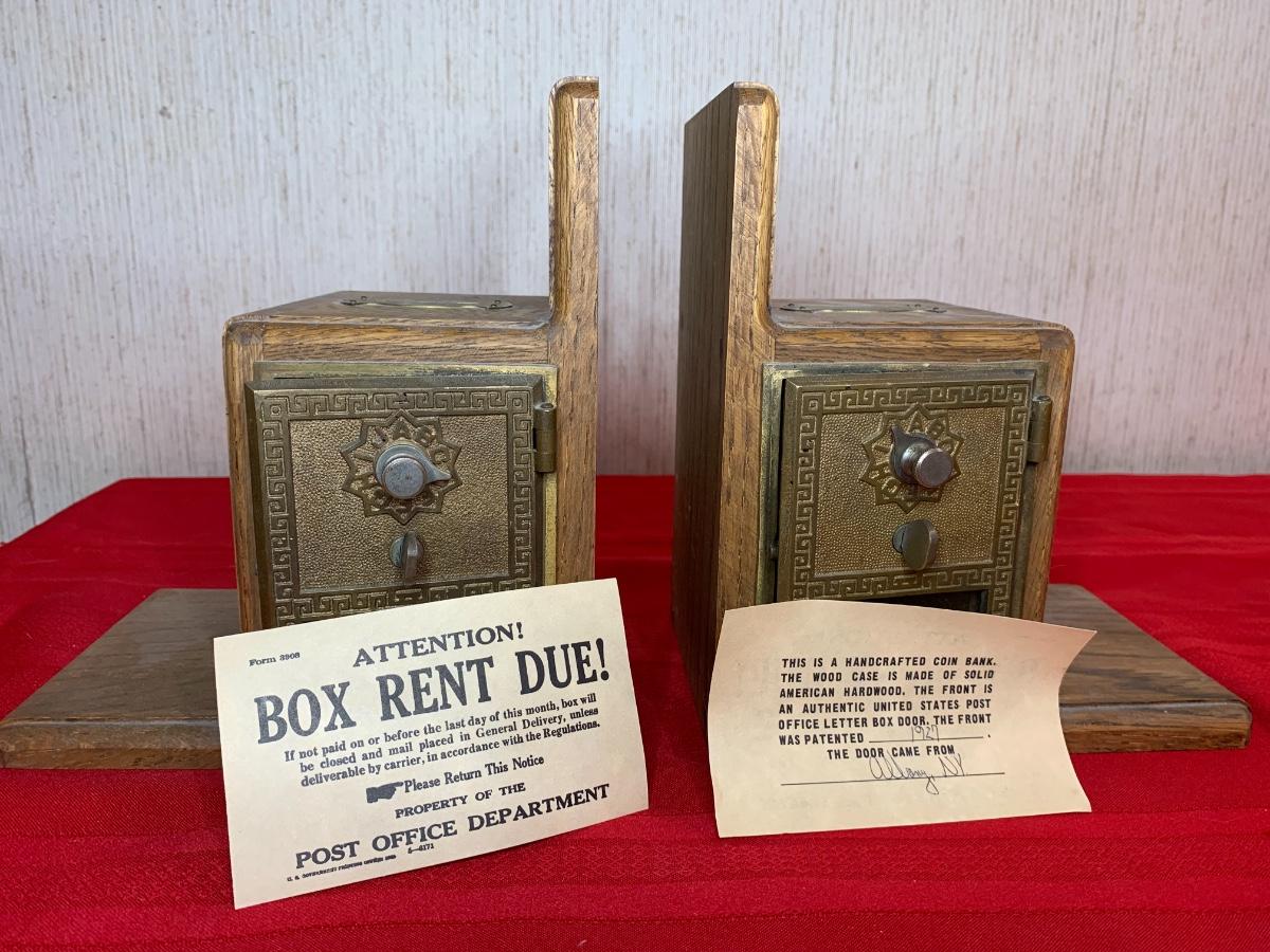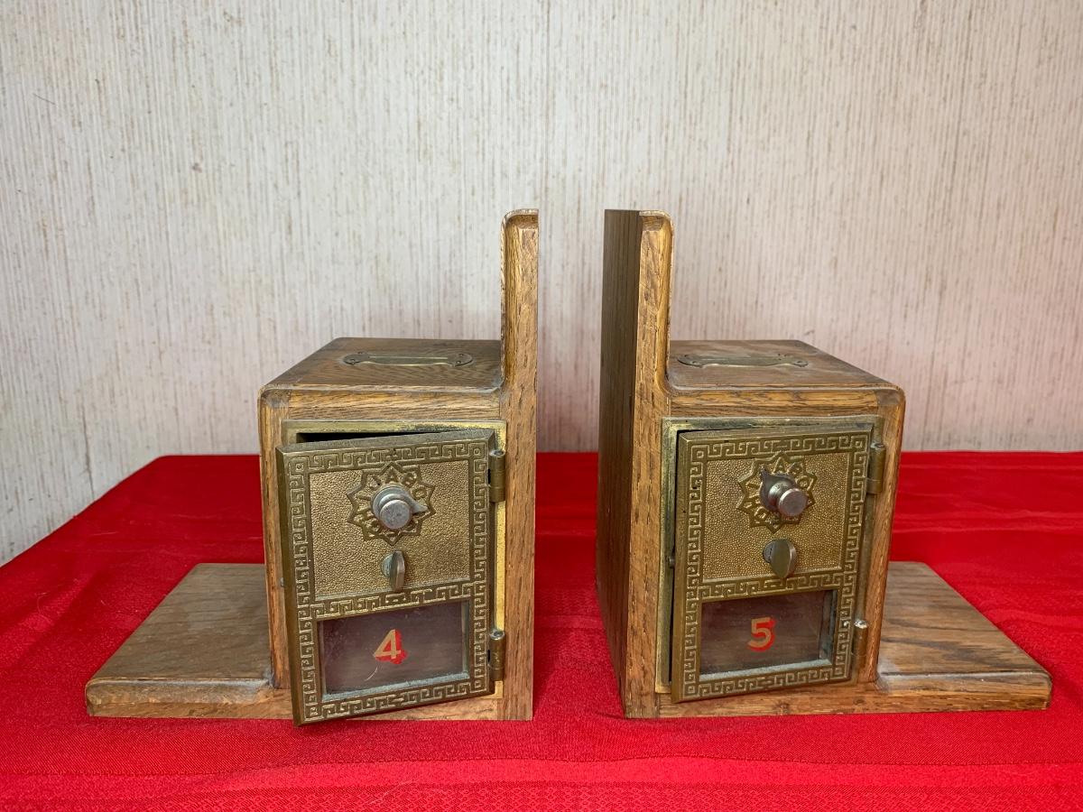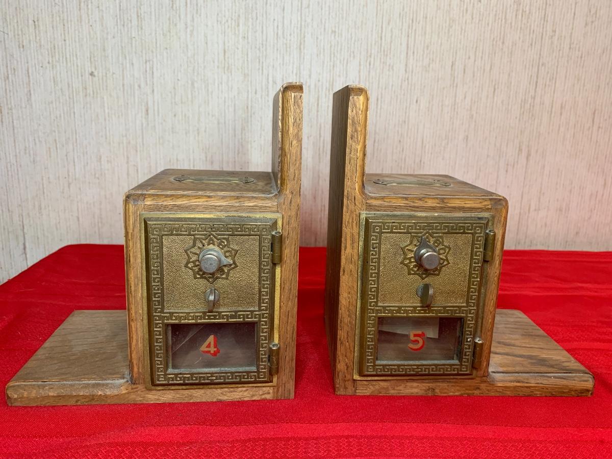 Post Office bank bookends with combination locks. Combination to open boxes is known. Slot at the top, assumed it was used to put in coins to make the ends heavier.