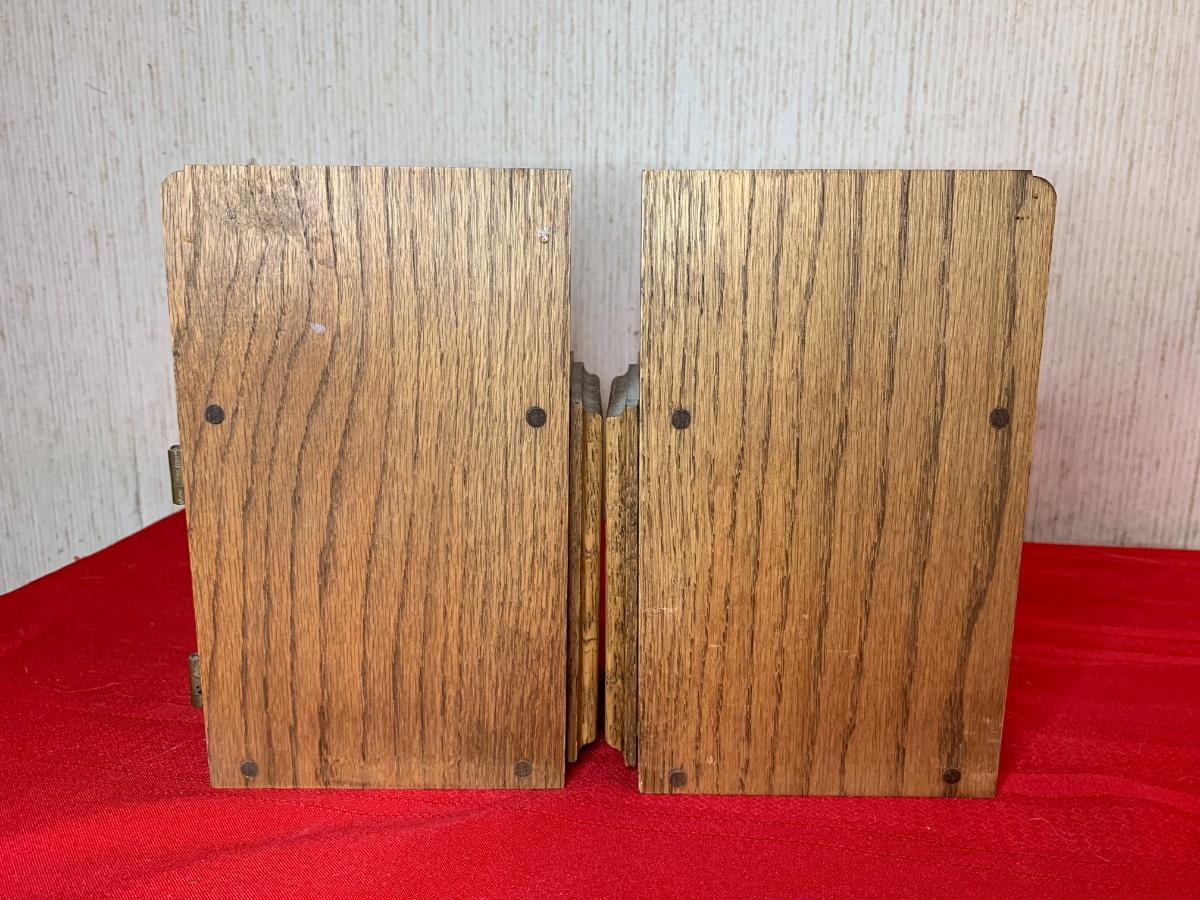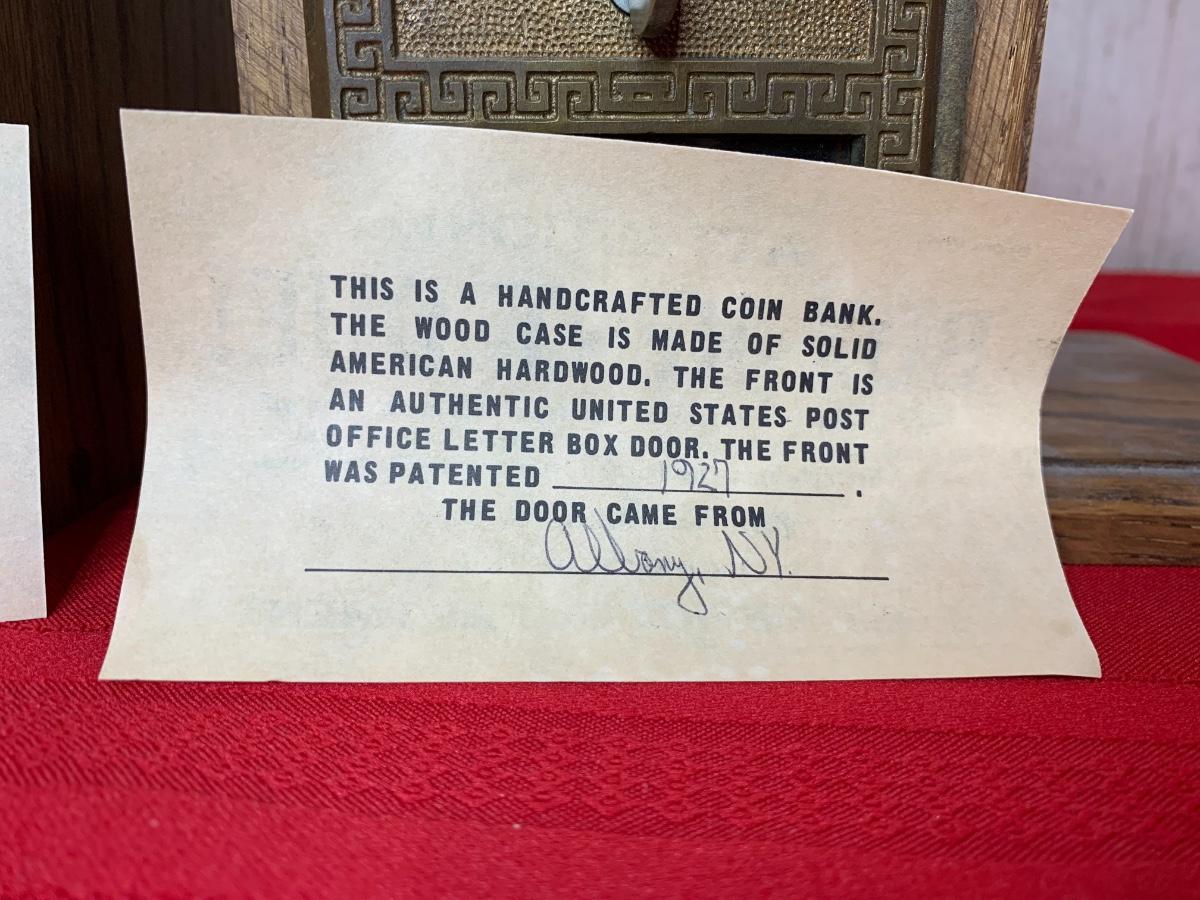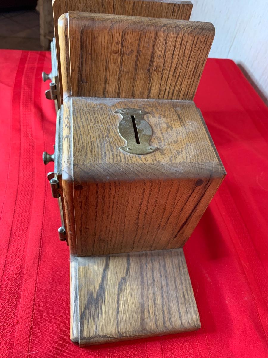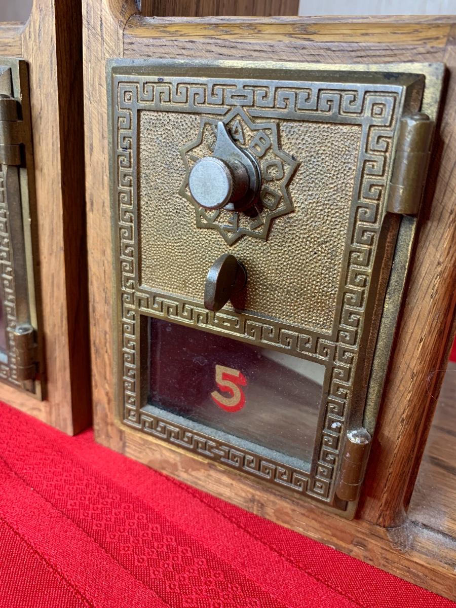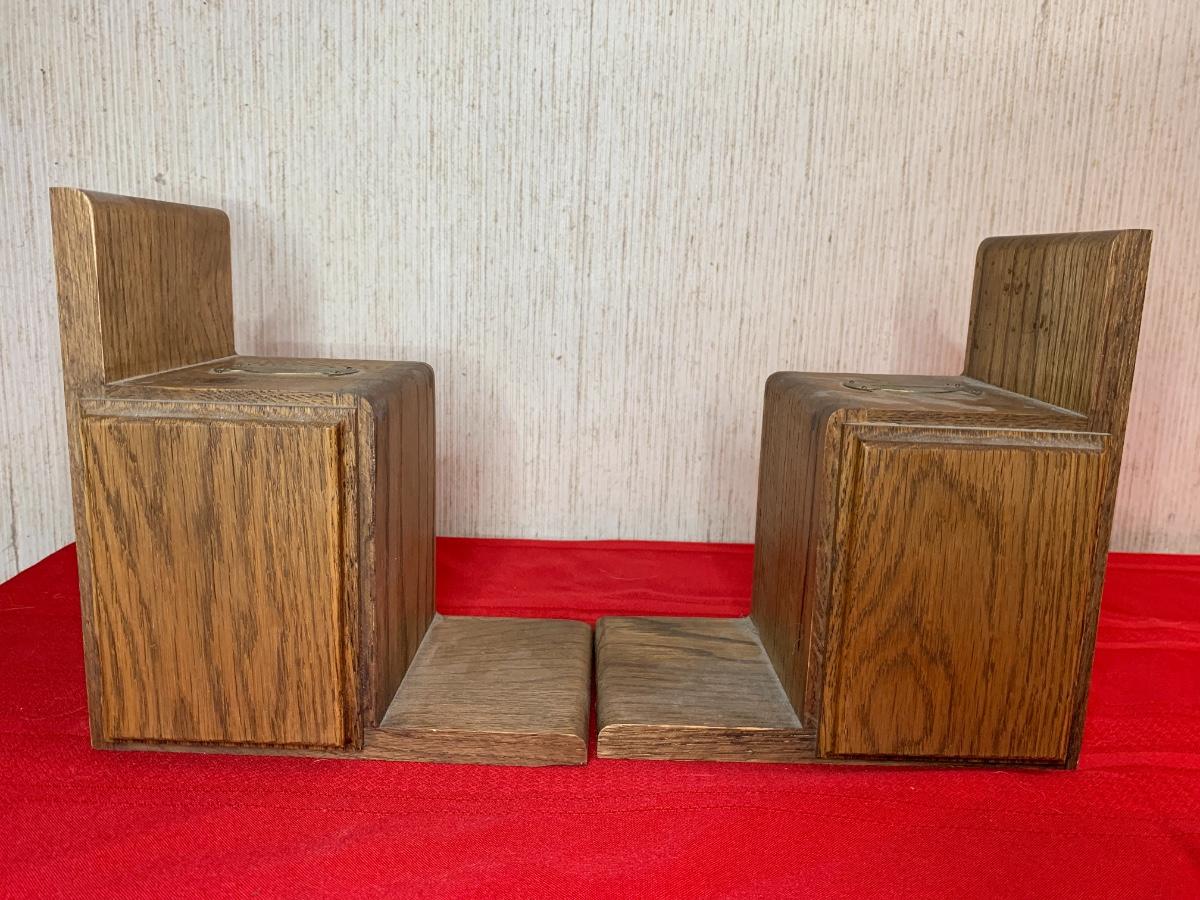 Post Office bank bookends with combination locks. Combination to open boxes is known. Slot at the top, assumed it was used to put in coins to make the ends heavier.