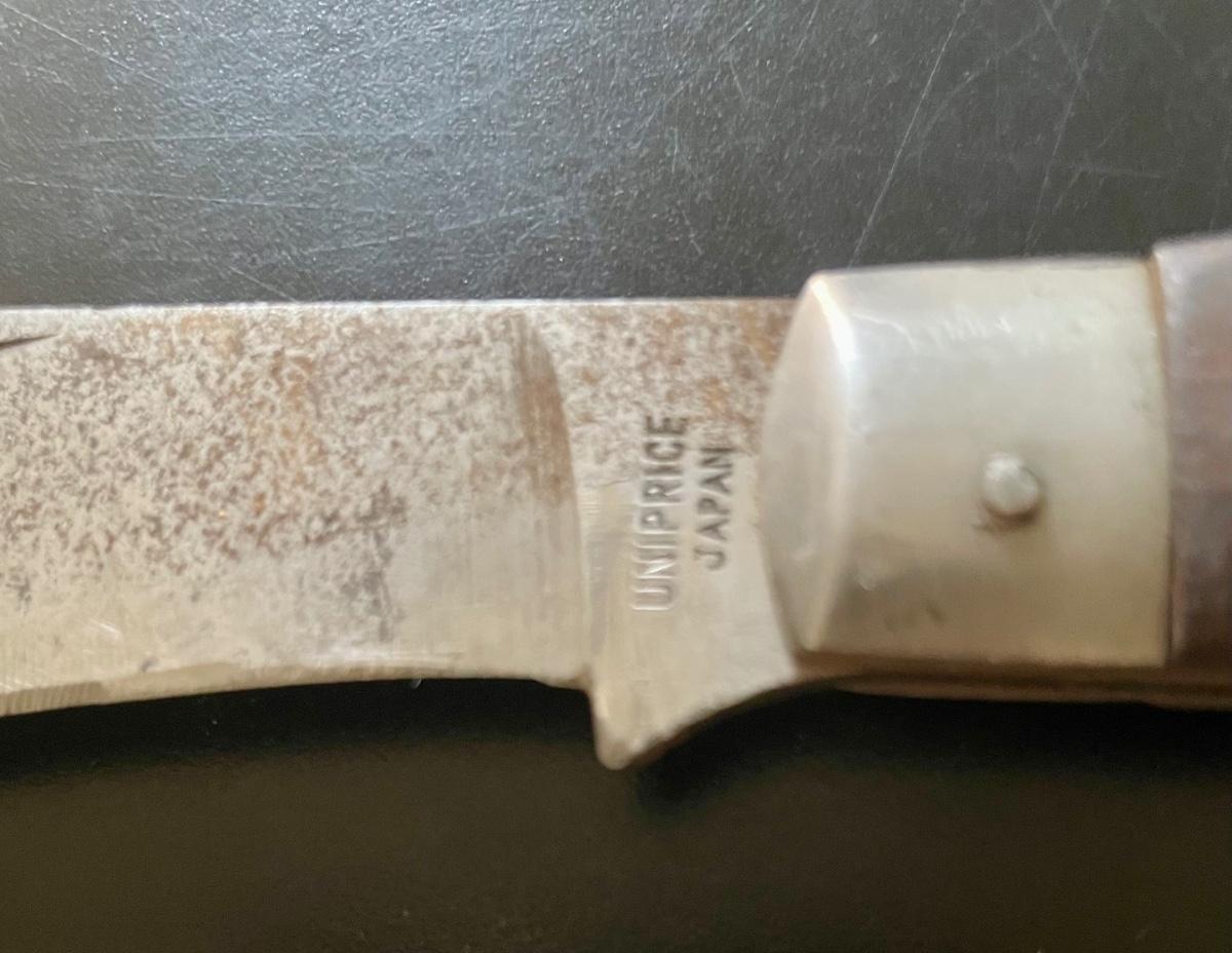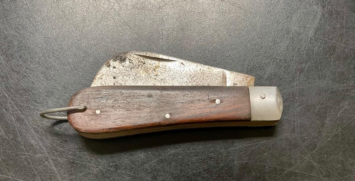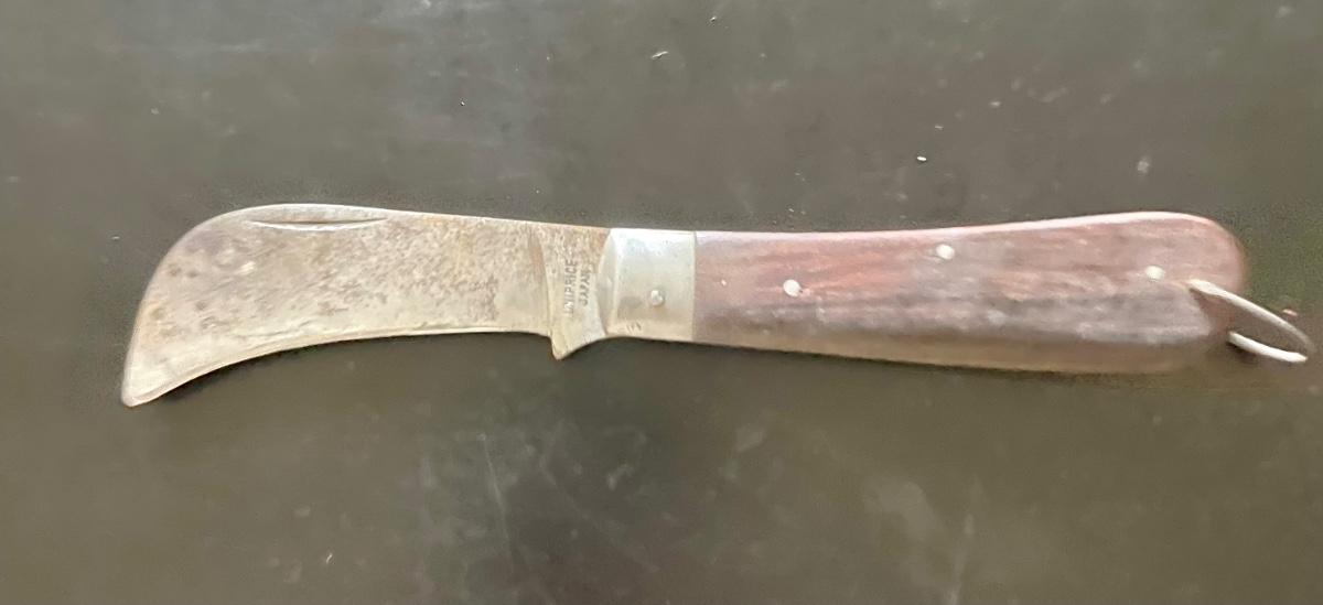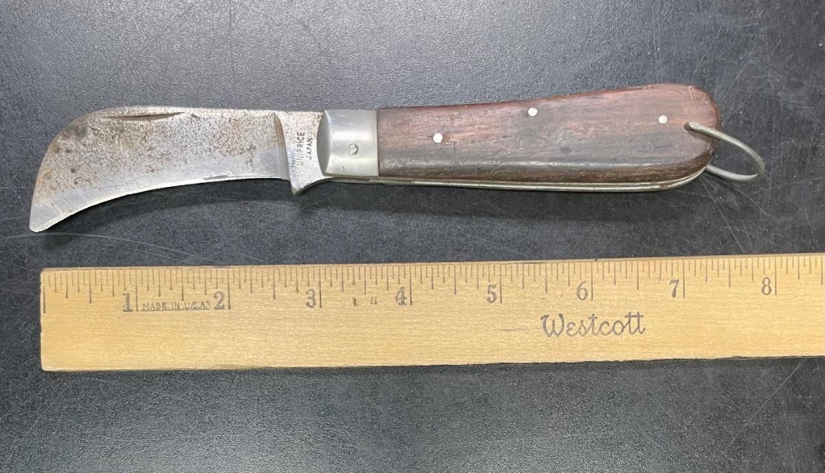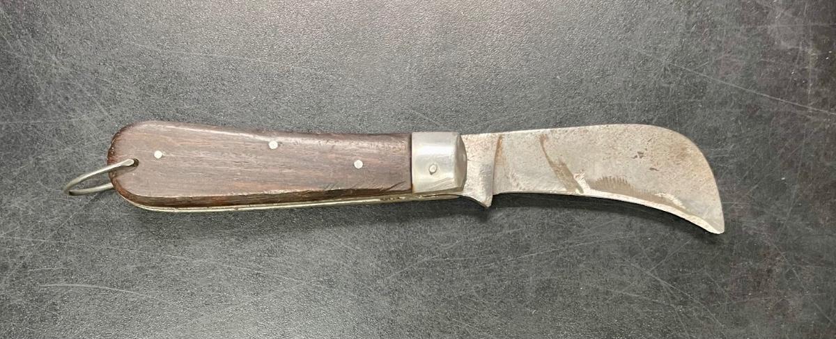 solid wood handle pieces, looks like walnut. Curved, hook-nose blade. D-ring on handle to allow it to be clipped to a belt. Some surface rust, but blade opens and closes smoothly. Approx. 7' long when opened.