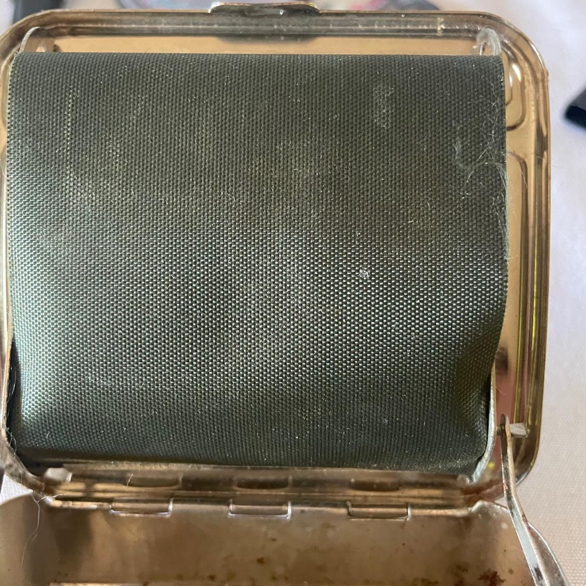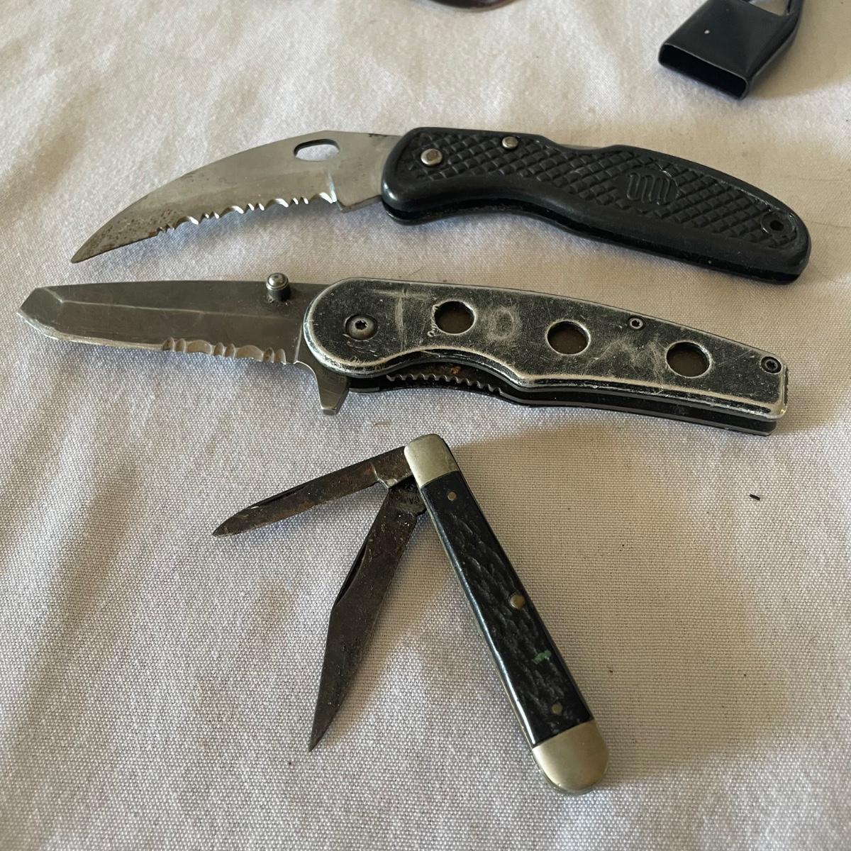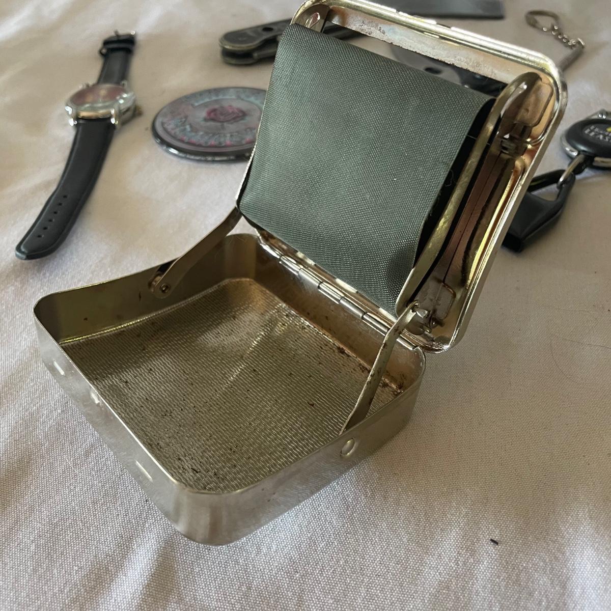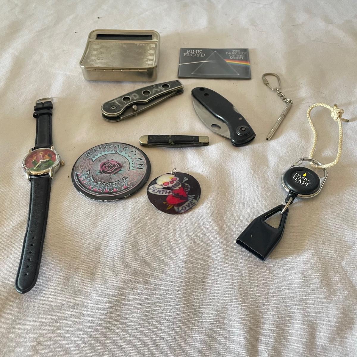 There are 3 pocket knives in this lot along with a metal cigarette case, watch, mini screwdriver and more. Watch has faux leather strap.