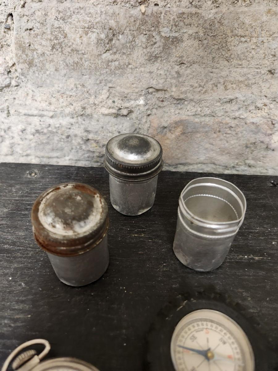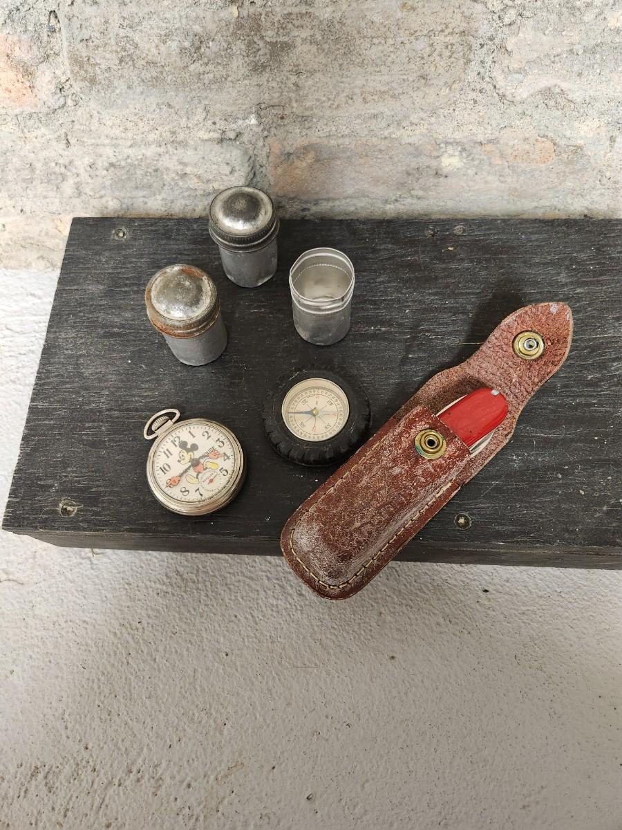Things you would find in a pocket. Compass, pocket watch doesn't work but super cool, film canisters, swiss army knife,